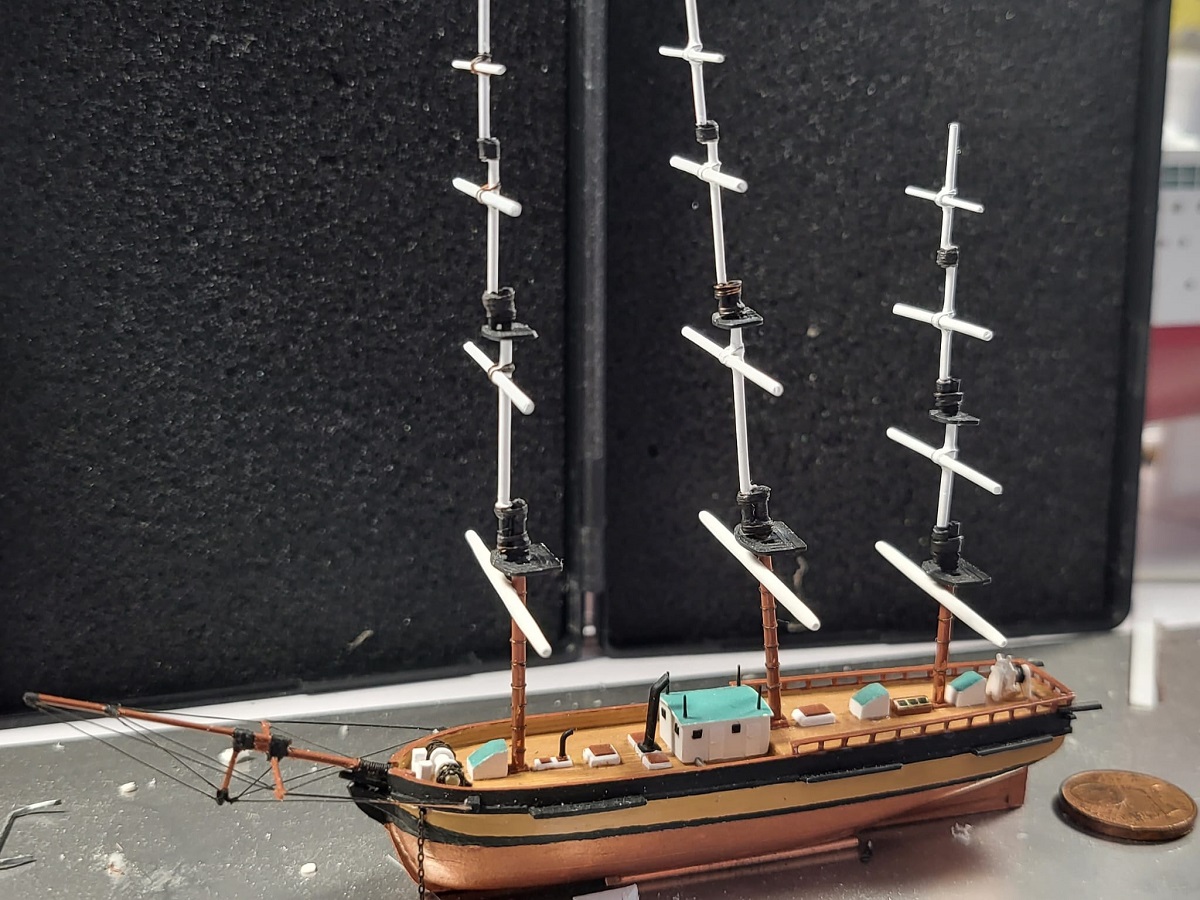 Hallo Wilfred, ich habe mir das beim Aufbau überlegt aber, nur die untere Rahstangen sind aus Plastik, und dieser sind bisschen auf Spitze gebracht, mindestens insofern das die Stärke es zu last, es ist ja so Klein das es unmöglich ist 100% Real zu machen.