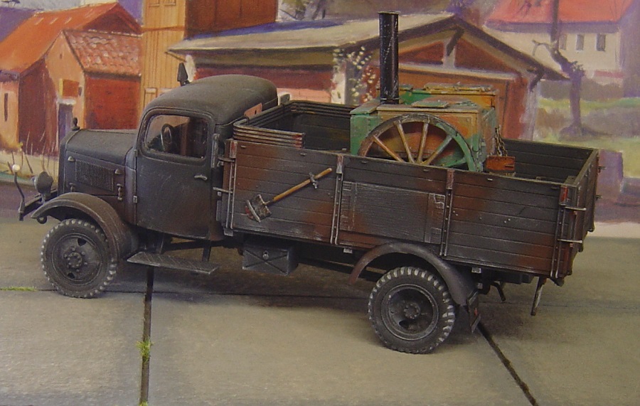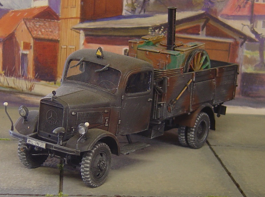Die Räder fehlten bei dem Bausatz und wurden durch herpa-Teile ersetzt. Der Kran ist drehbar, das Innere wurde bemalt. Das Armaturenbrett soll eine Holzimitation darstellen. Hierzu habe ich Rafaels Methode ausprobiert mit "Orange klar".