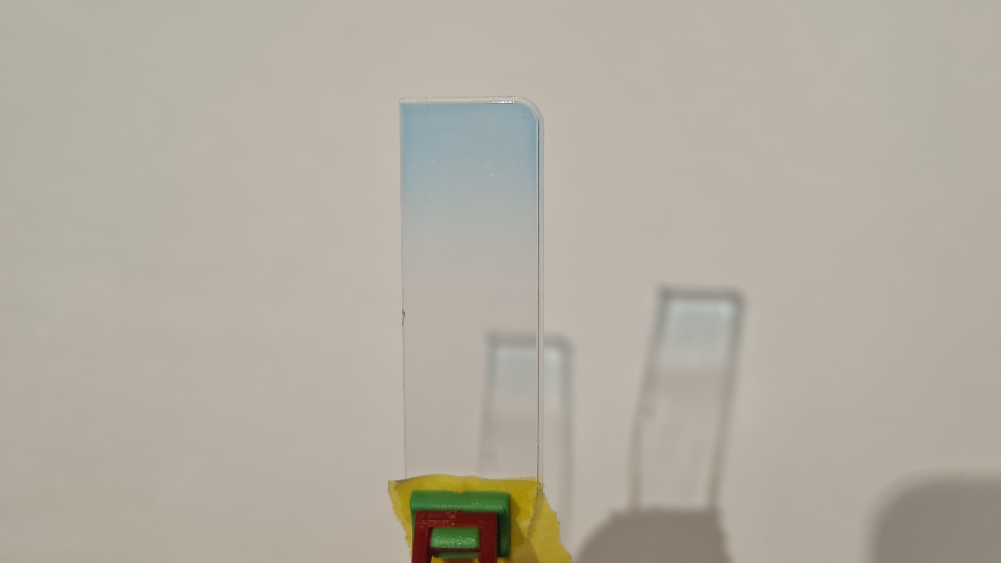 ich denke, ich würde es mit Tamiya Clear blue versuchen. Zur Hälfte mit Tamiya X-20A verdünnen und noch ein paar Tropfen Trocknungsverzögerer dazu. Läßt sich wunderbar mit der Airbrush sprühen. Ich habe mal gerade eben an einem überflüssigen Klarsichtteil ausprobiert. 5 Tropfen Clear Blue, 5 Tropfen Verdünner und 2 Tropfen Trocknungsverzögerer. Gesprüht etwa mit 1 bar.