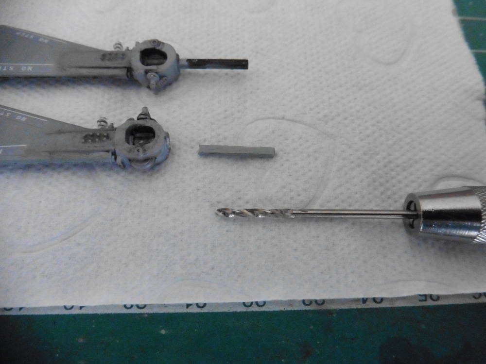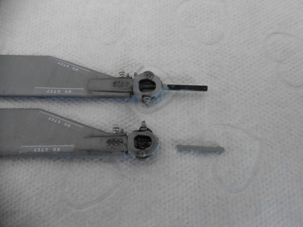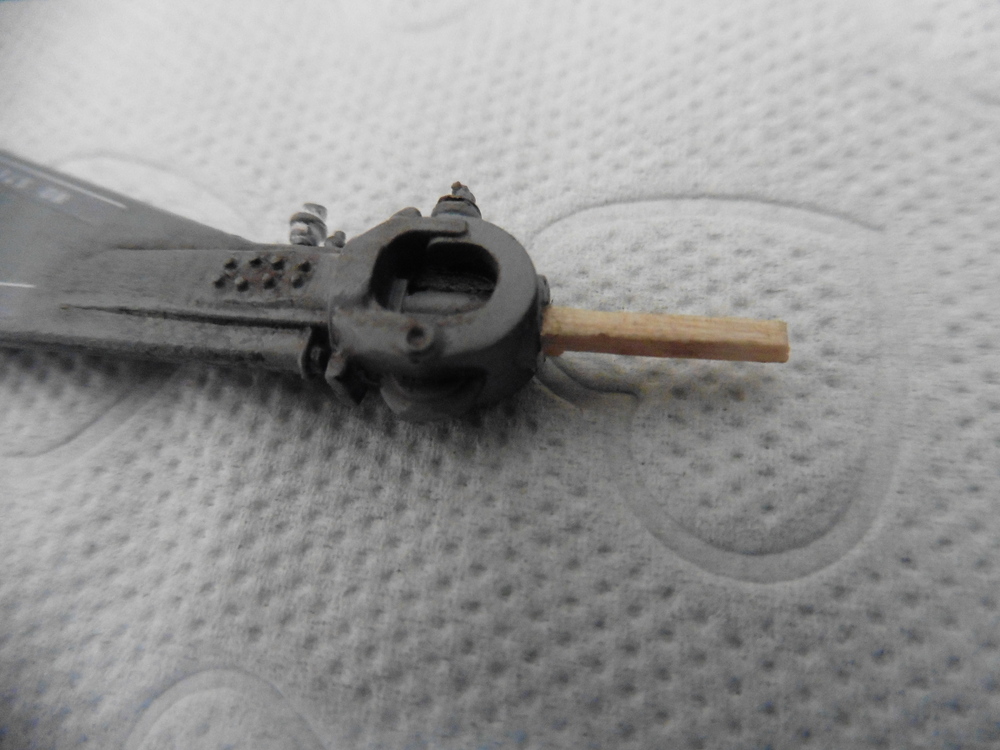 Ich habe dann mit einem Handbohrer die Rotorblätter aufgebohrt . Als erstversuch habe ich Streichhölzer genommen , da die Aufnahmen Quardatisch sind . Einfach war es dann aber mit großen Zahnstochern zu Arbeiten . Diese konnte ich so in meine Bohrung einkleben .