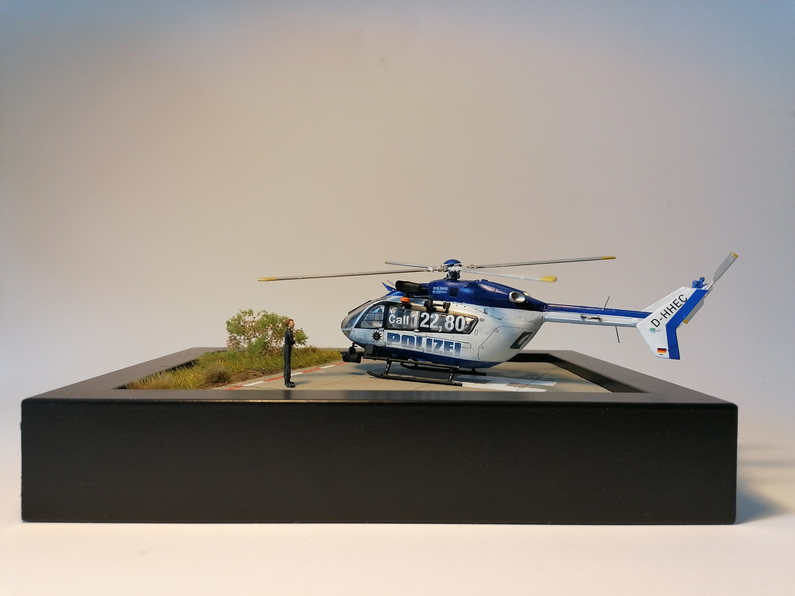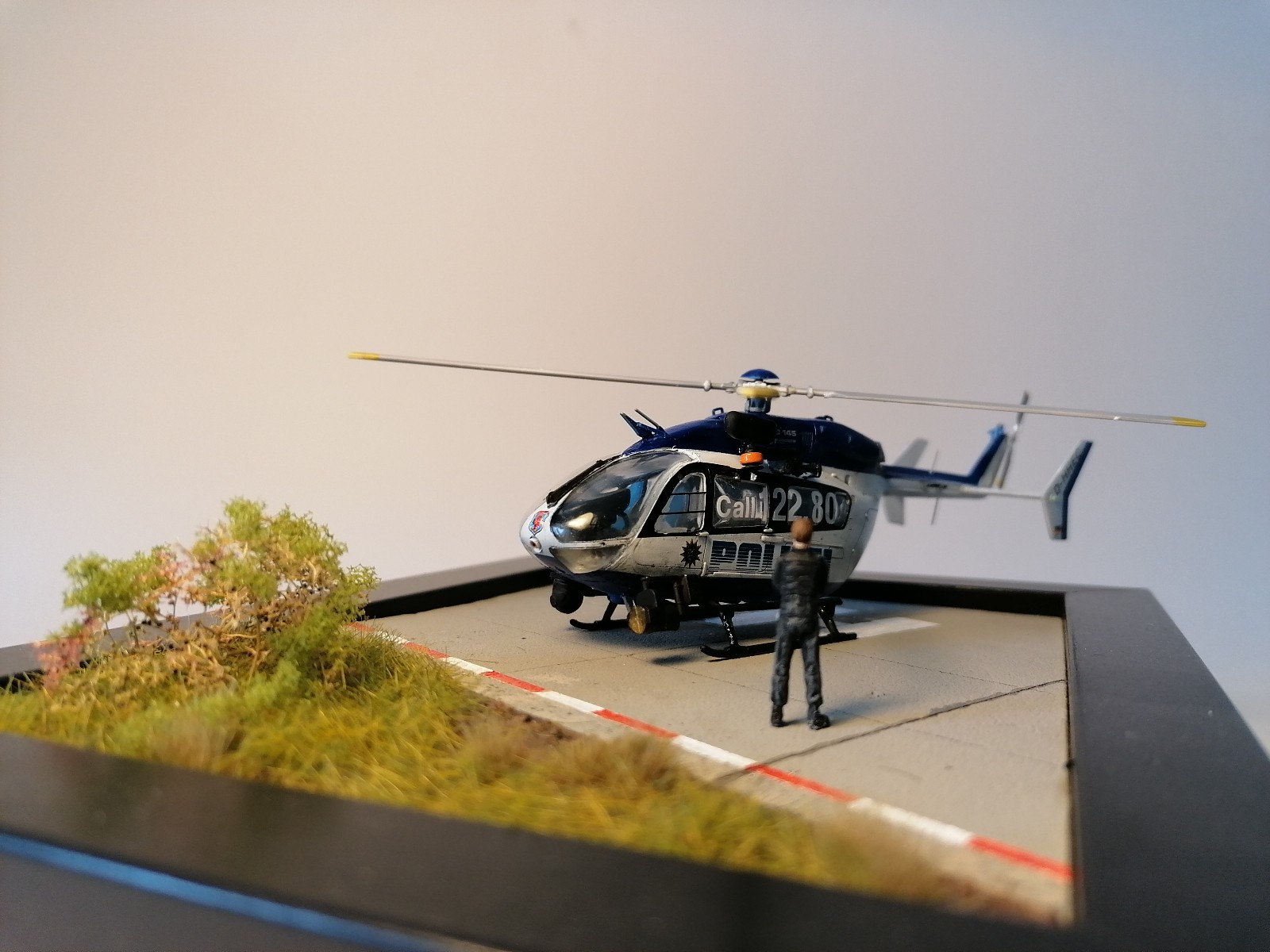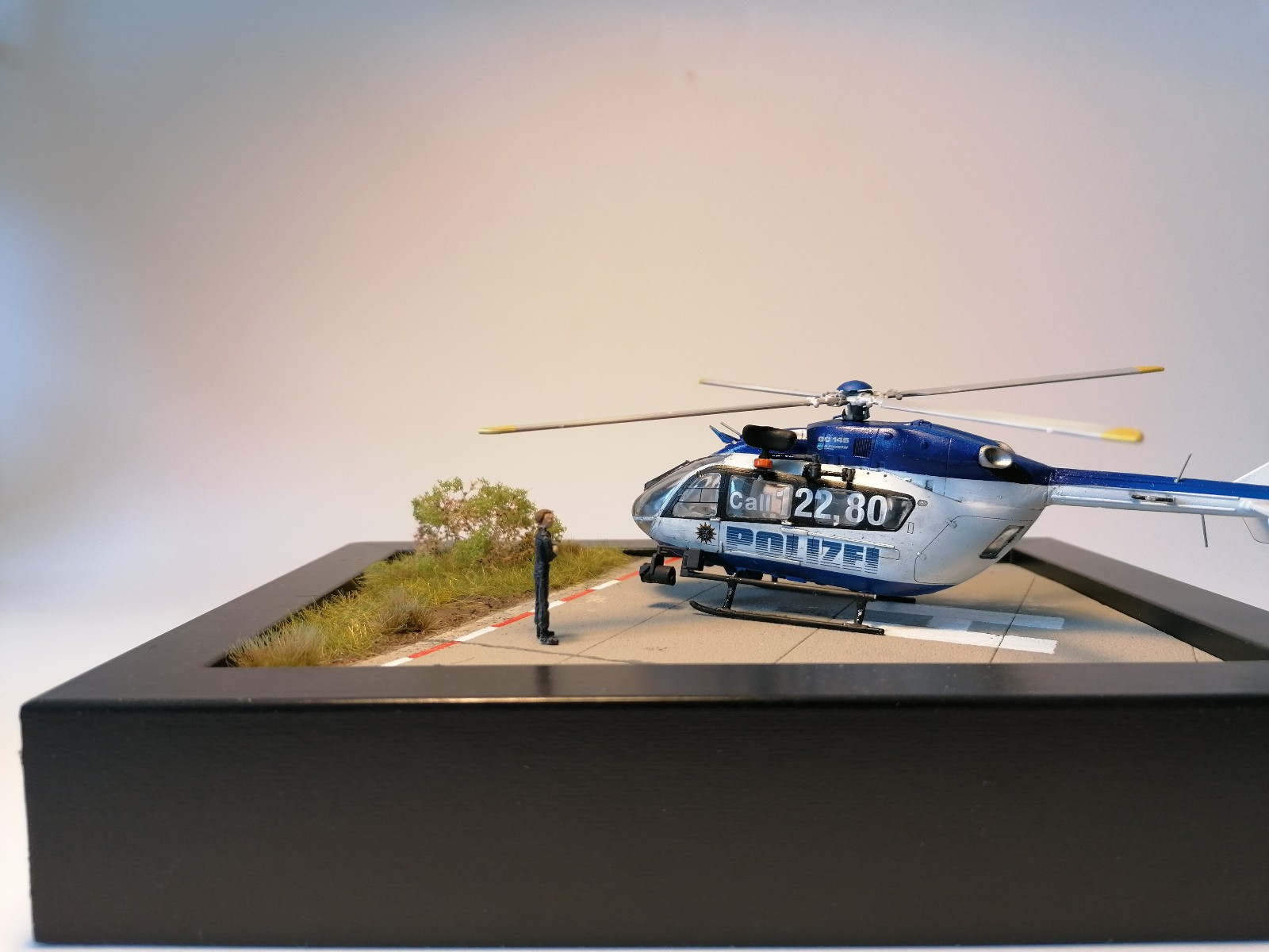 Bemalt wurde mit Vallejo Farben der Modell air Serie. Das Männchen was neben dem Heli steht ist aus dem Revell Piloten Set und ist eigentlich ein Jet Pilot. Hat sich wohl verirrt der Gute