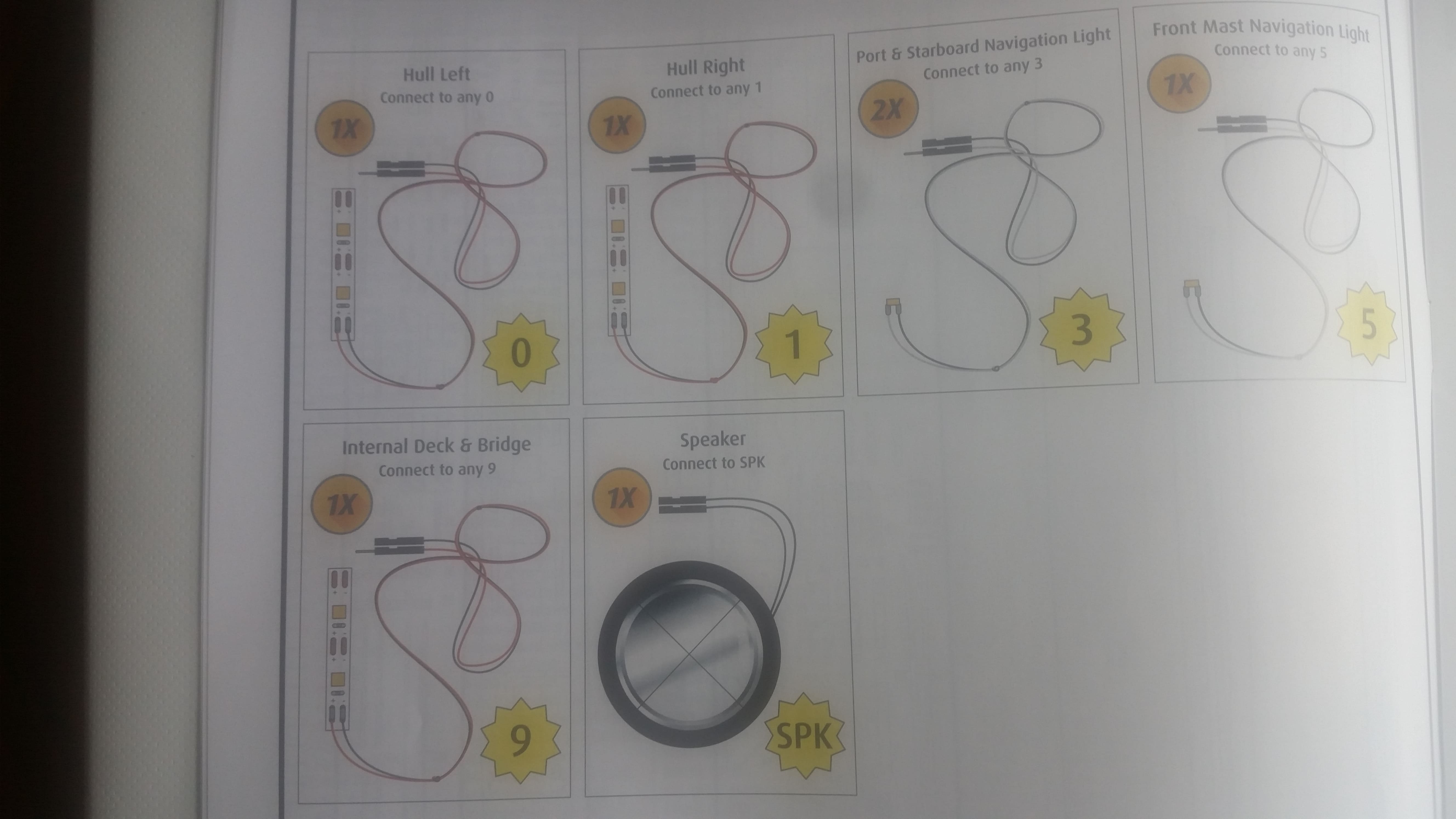 Guten Morgen. Bei meiner Titanic mit Licht und Sound sind an beiden Bordwänden innen jeweils ein Streifen mit 2 LED`s anzubringen.