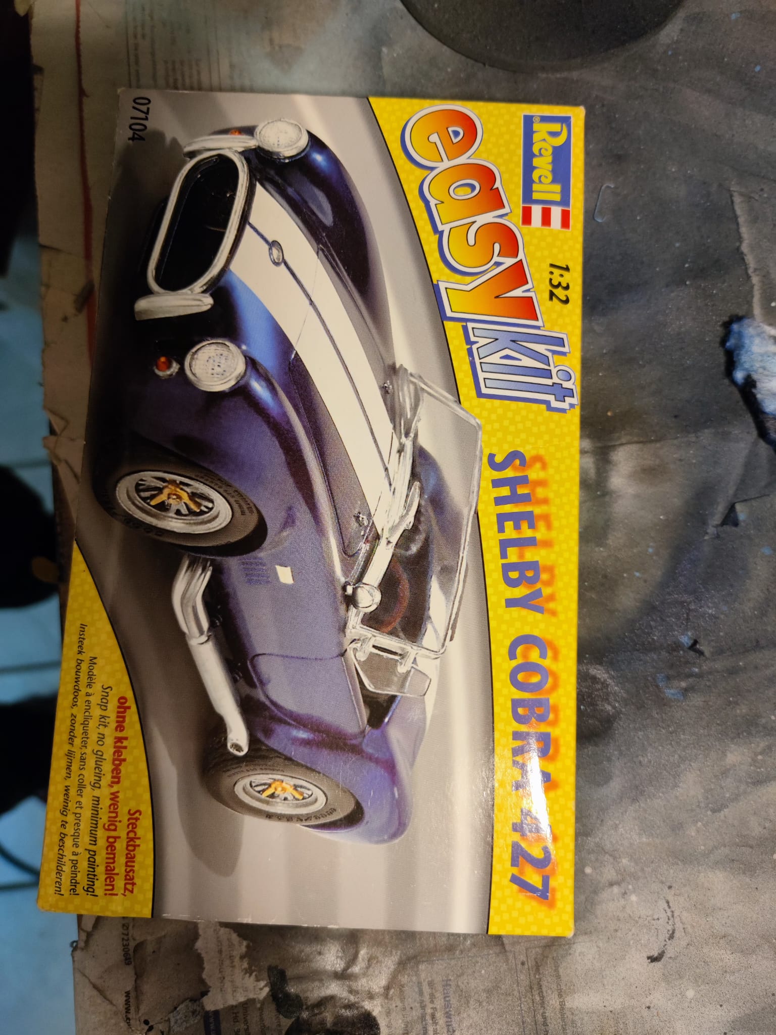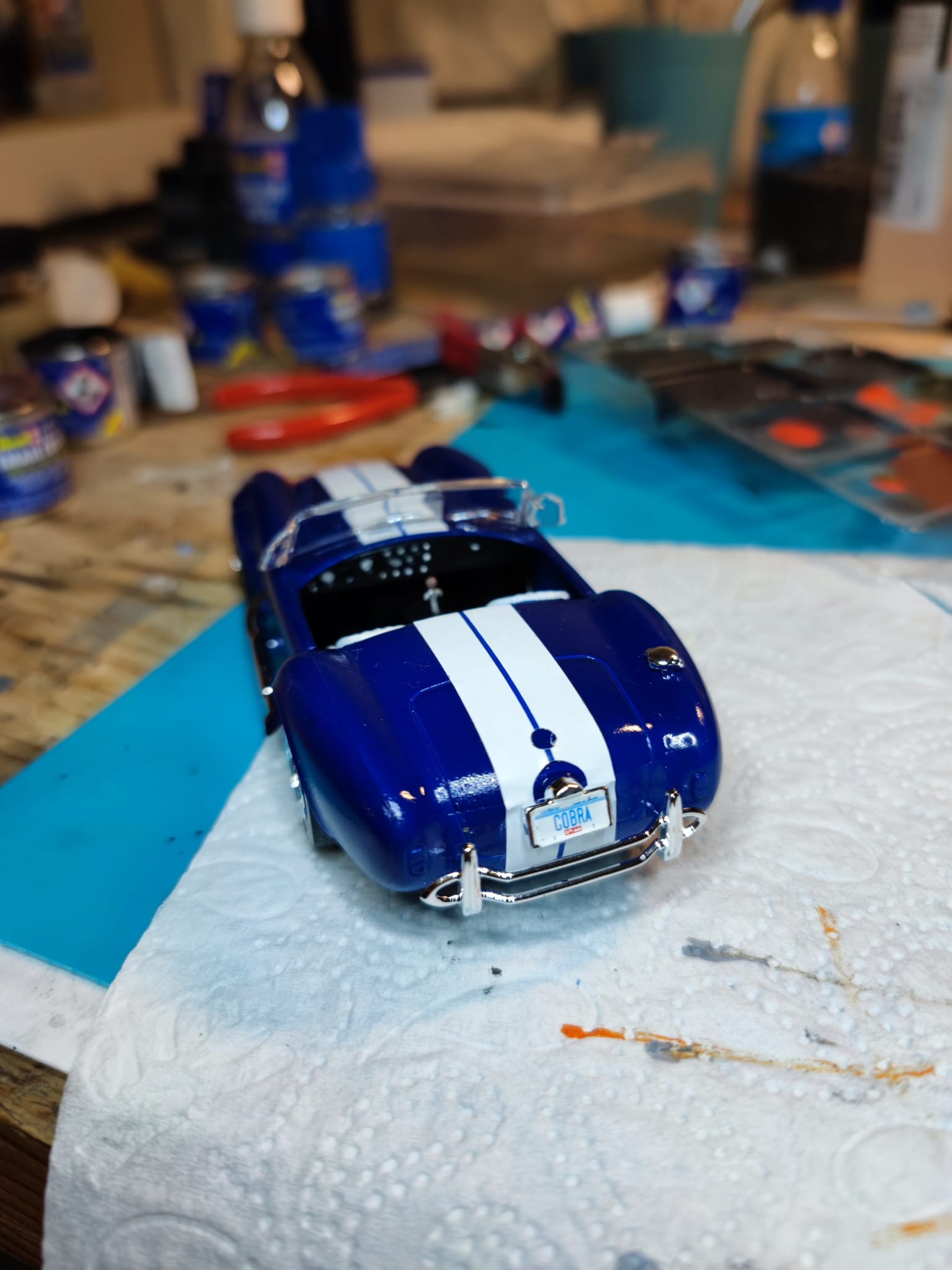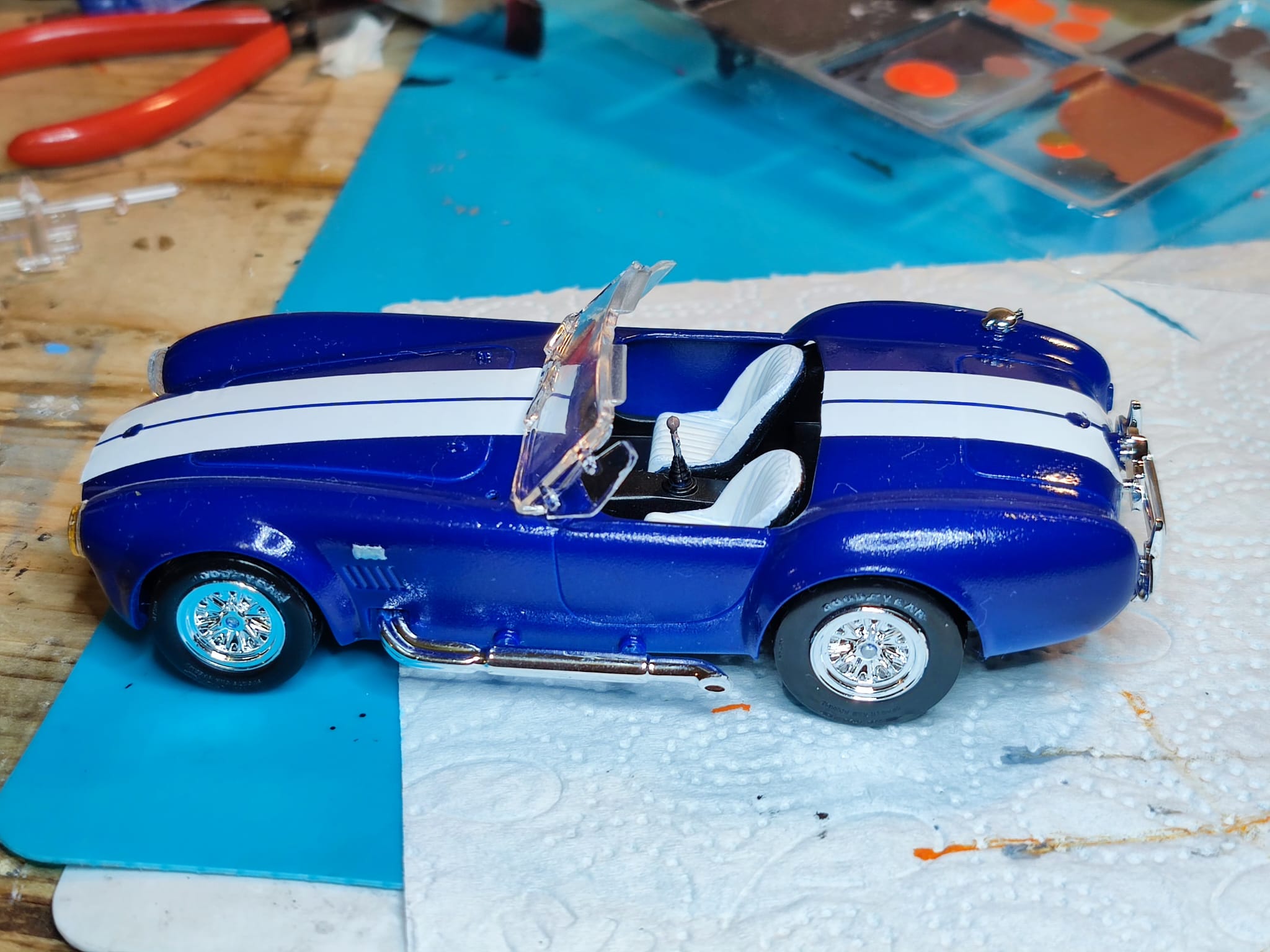 Während ich darauf wsrte, dass der Klarlack an der Bell X-1 trocknet, habe ich eine Shelby Cobra Easy Click, die ich gebraucht gekauft habe, gebaut und lackiert. Leider fehlt im Bausatz die vordere Stoßstange.