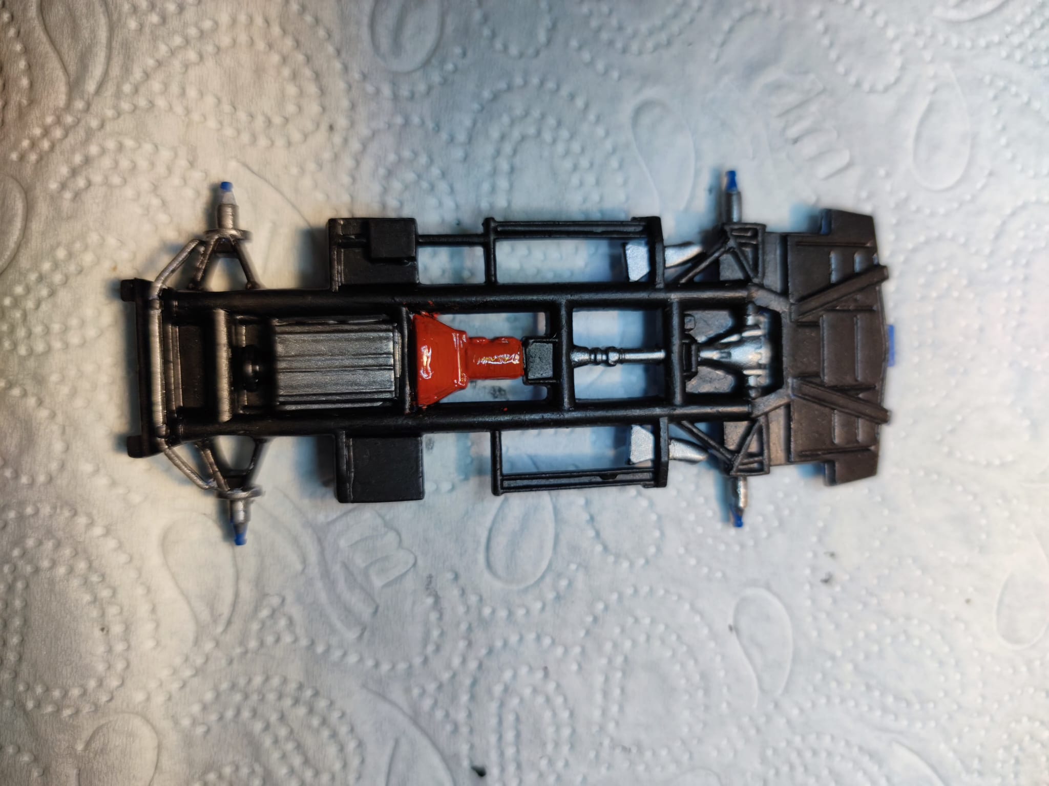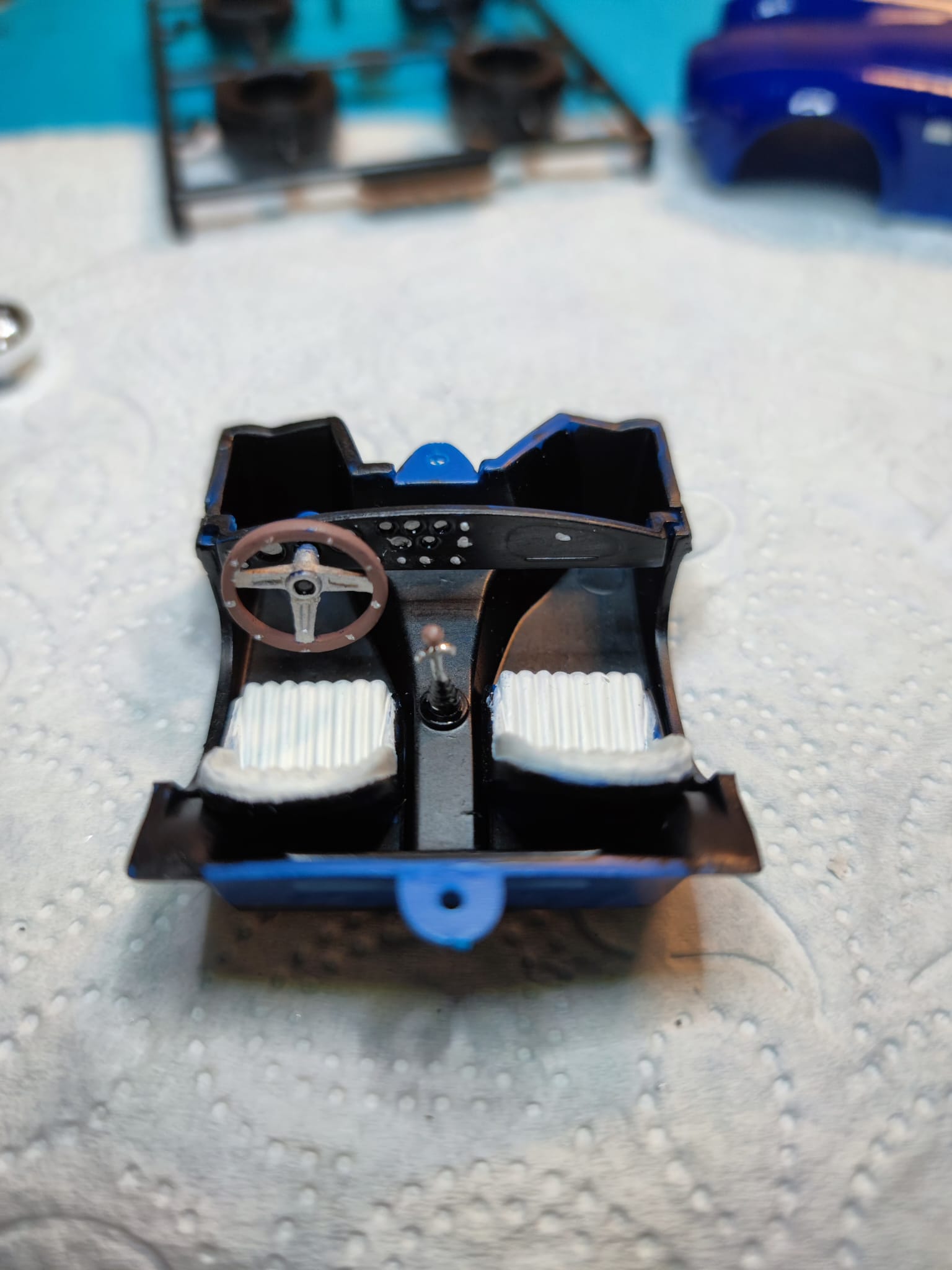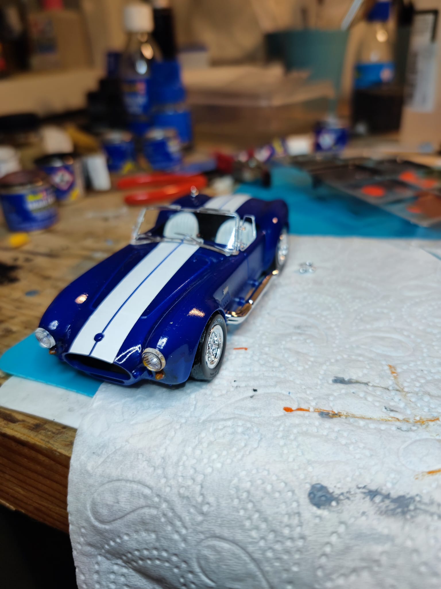 Während ich darauf wsrte, dass der Klarlack an der Bell X-1 trocknet, habe ich eine Shelby Cobra Easy Click, die ich gebraucht gekauft habe, gebaut und lackiert. Leider fehlt im Bausatz die vordere Stoßstange.