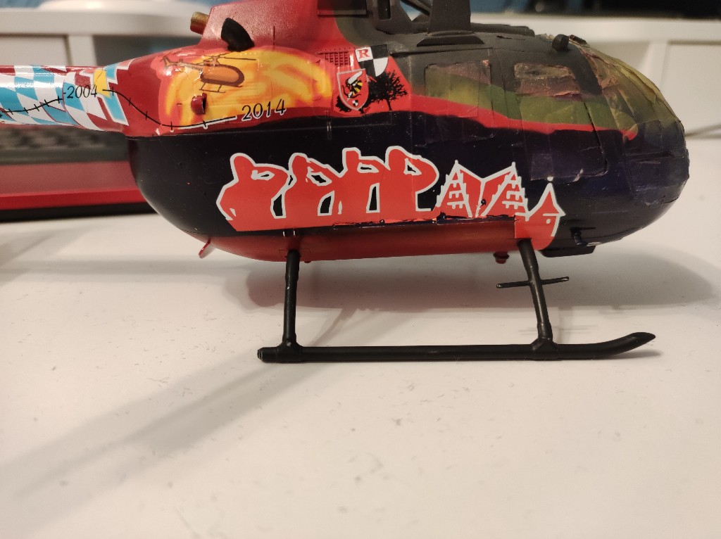 Lächerlich und mittlerweile kann ich darüber nur noch lachen, wie sich der Heli gegen die Fertigstellung wehrt, den kurz nach dem ich die Bilder geschossen habe passiert das: Aber egal, das würde geklebt und nun fehlt nur noch der Klarlack und dann Mal sehen wie es unter dem Tape aussiehst