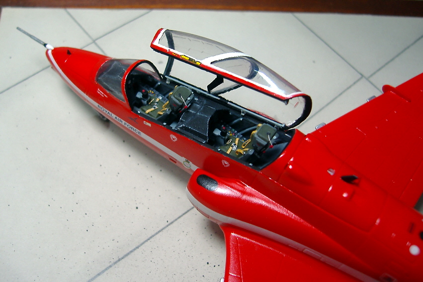 Die Hawk T.1 XX308, c/n 143/312133, wurde am 23.04.1980 an die RAF ausgeliefert. Ich wollte die XX 308 gerne so präsentieren, wie sie Anfang der 80er-Jahre auf Airshows zu sehen war. Deshalb verwendete ich nicht die im Bausatz vorhandenen Decals mit dem besonderen Logo der Saison 2000, wie es auf dem Deckelbild am SLW zu sehen ist. Da die Jets der Red Arrows immer sehr geflegt sind und das Farbkleid der XX 308 seinerzeit noch frisch war, verzichtete ich auf ein Weathering, was für mich auch die Akzentuierung von Blechstössen beinhaltet. Hinzu kommt, dass das Schätzchen fest mit der Platte verbunden ist. Um sie für die nachträgliche, umfassende Betonung der Panellines gut und sicher handhaben zu können, müsste ich sie von der Platte lösen. Das damit verbundene Risiko eines Bruchs ist mir zu hoch. Daher lasse ich sie lieber so, wie sie nunmal aussieht.