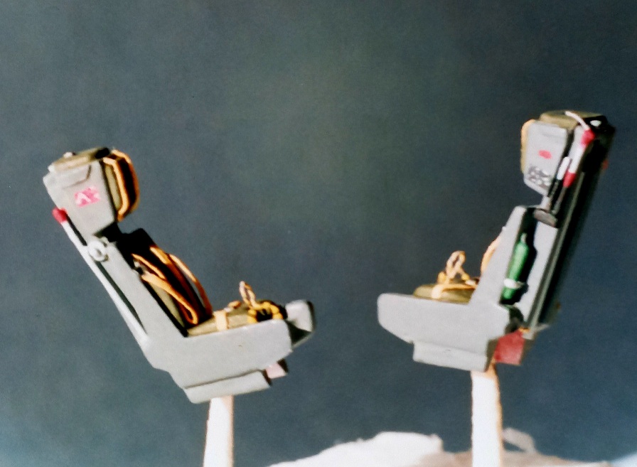 Beim Suchen nach der Bauanleitung habe ich auch den Abzug eines Fotos der beiden mit einfachen Mitteln nachdetaillierten MB Mk.10 Schleudersitze gefunden. Ist als Schnappschuss während des Baus entstanden. Hab es mal abfotografiert, ums hier zeigen zu können.