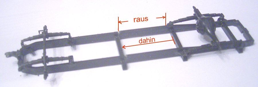 Die Zugmaschine ist kürzer als ein üblicher Lastkraftwagen, die Hinterachse muß also vorverlegt werden, ganz ohne kleinere Amputationen geht es nicht: