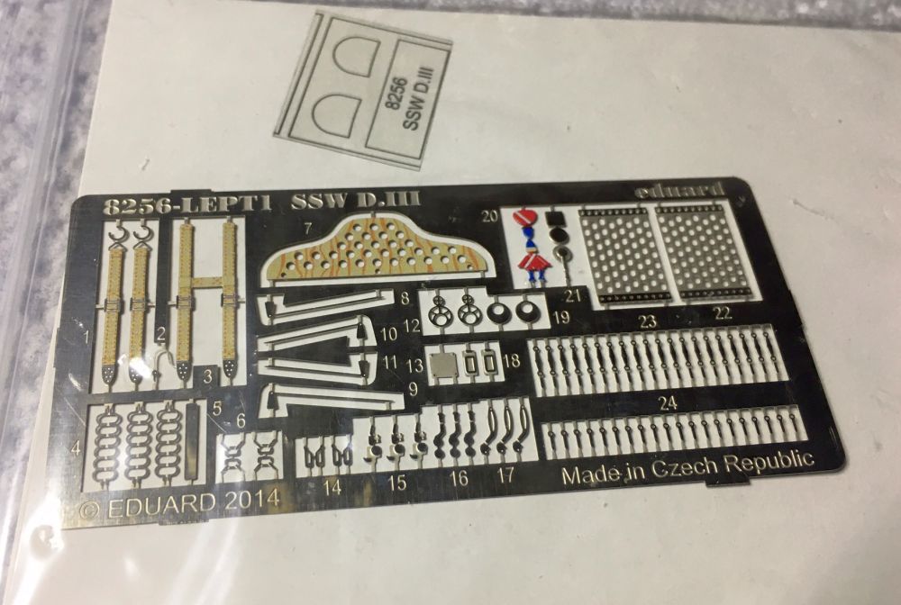 Wie üblich gehört zum Profipack ein teiweise farbiger Ätzteilbogen, inklusive der Spannschlösser für die Bespannung, Film fürs Glas und Masken für die Räder.