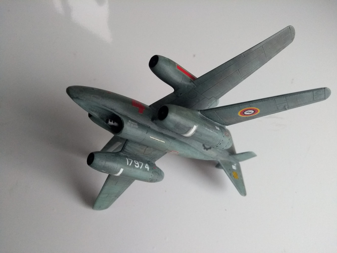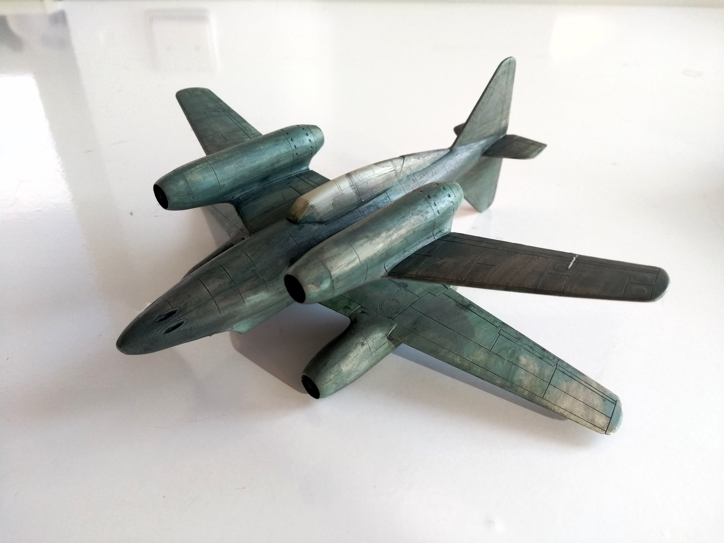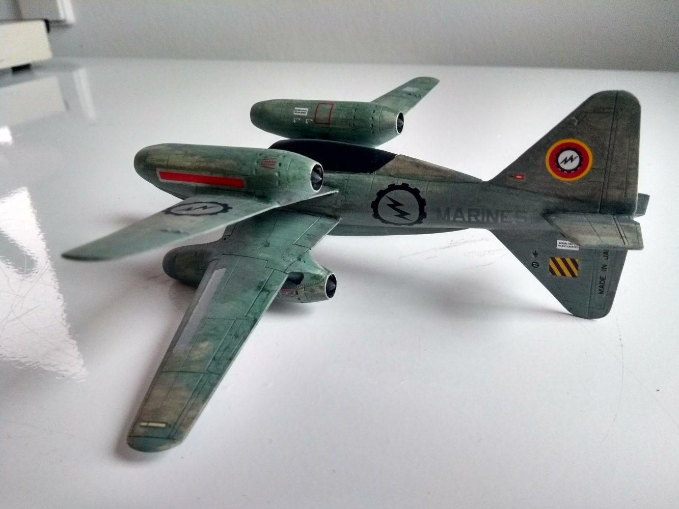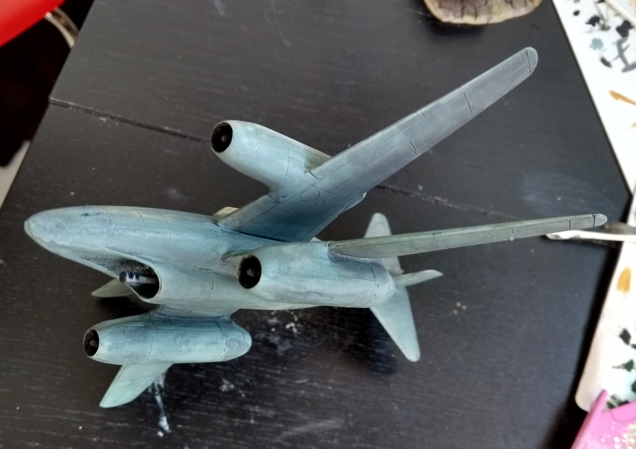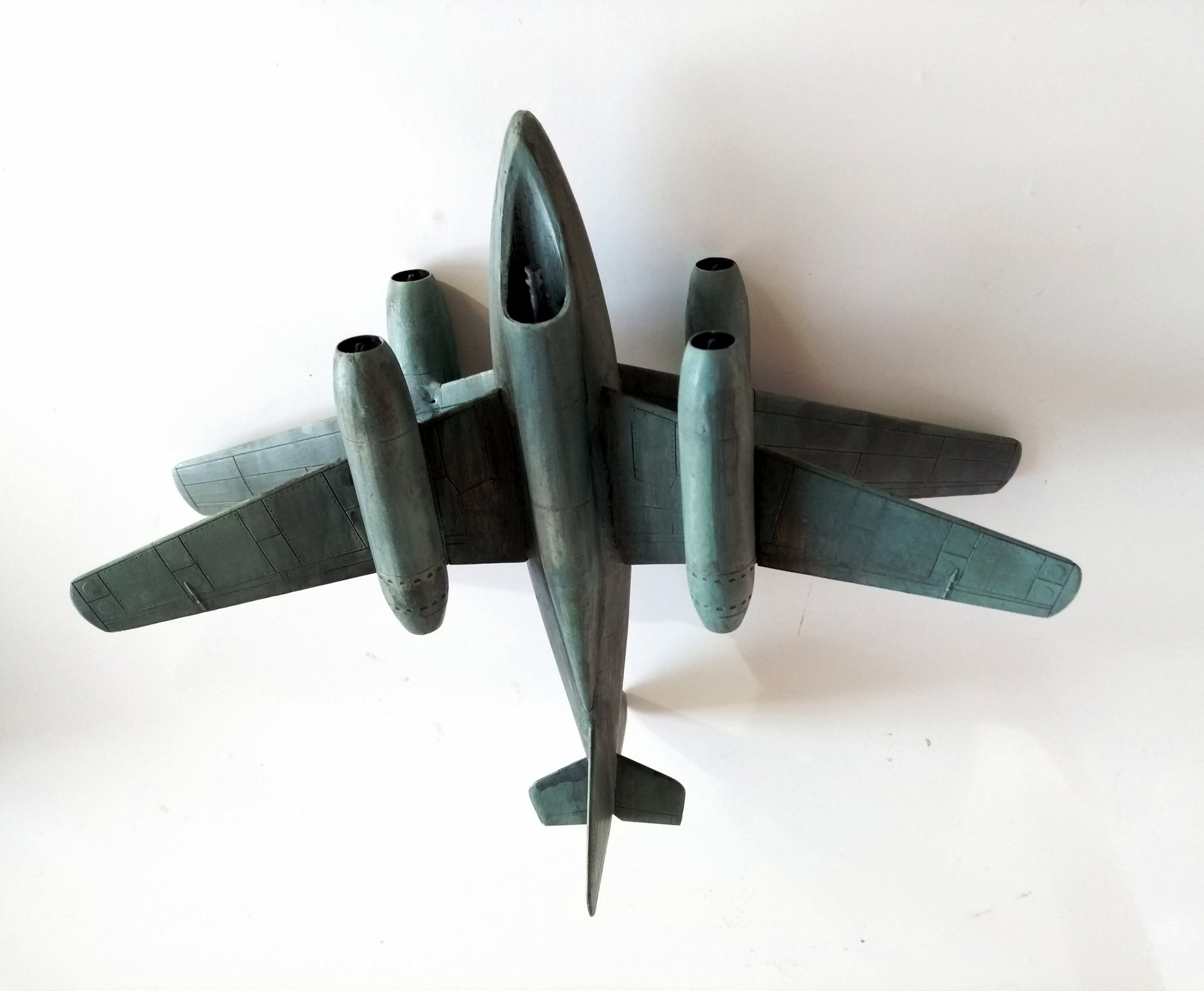 Aus den 2 zertrennten Bauchsegmenten der letzten 262 ( x Wing ) habe ich prima intakes gebastelt und auf dem Flügel einer Mig 31 platziert die dann am Rumpf einer He219 befestigt und mit Canards aus dem Leitwerk einer 747 ein Flugzeug ergeben .