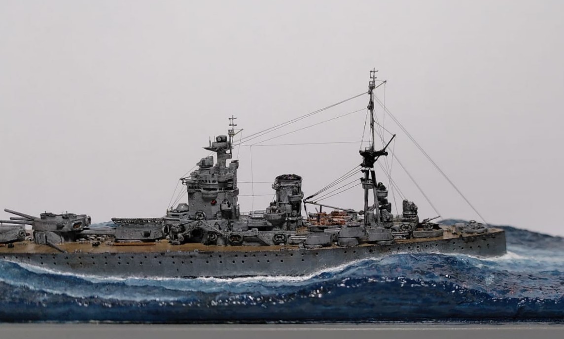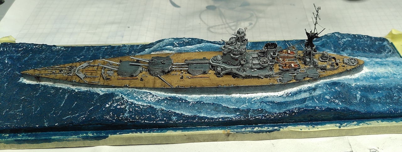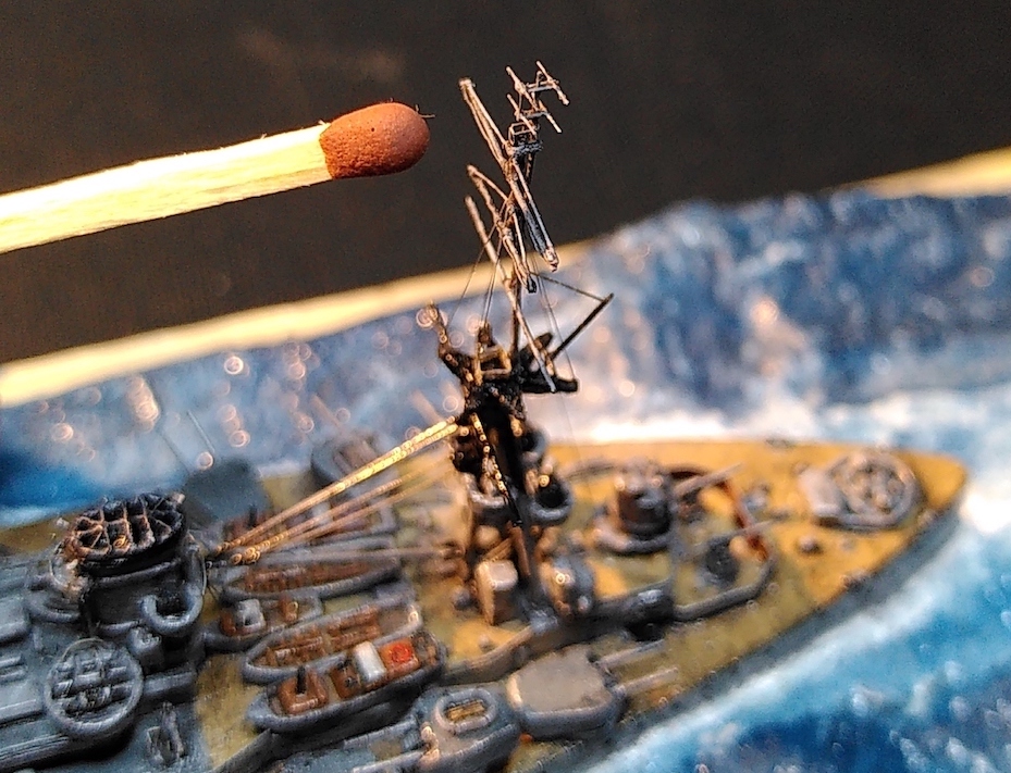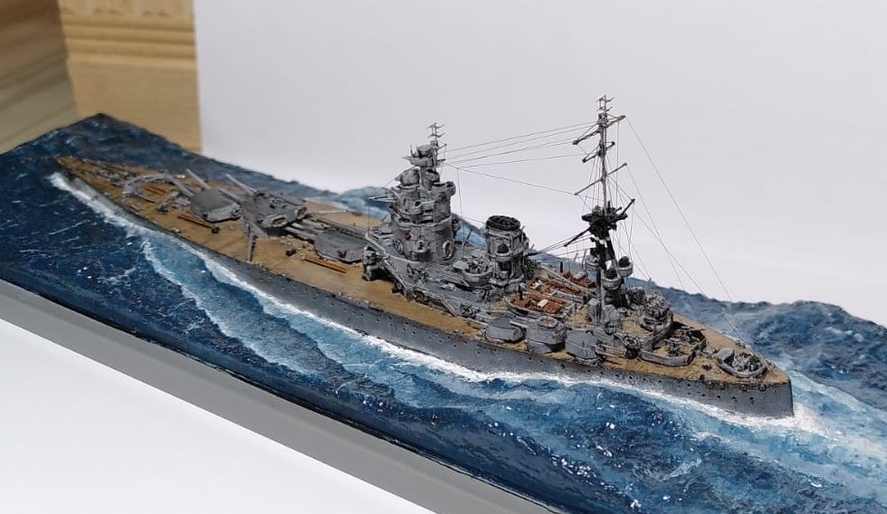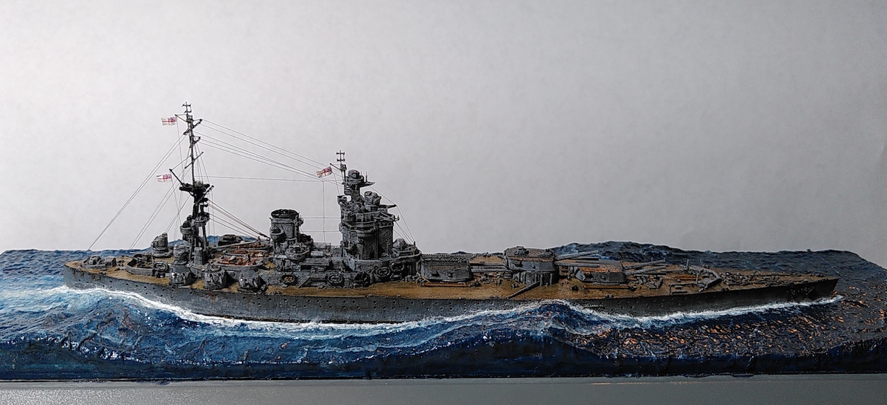 Oder die HMS Nelson, Schwesterschiff der Rodney 1940: Langer Rede kurzer Sinn: Hier zwei Fotos (mit der Handykamera gemacht - hat Tendenz zu etwas zu starken Kontrasten. Wenn fertig, gehts dann ins richtige Fotostudio) meiner Mini-Rodney... Es braucht jetzt eigentlich nur noch die Kabelbespannung, Radaranlagen an den Masten und noch die Überarbeitung des Wassers. Das sollte vor Weihnachten machbar sein.