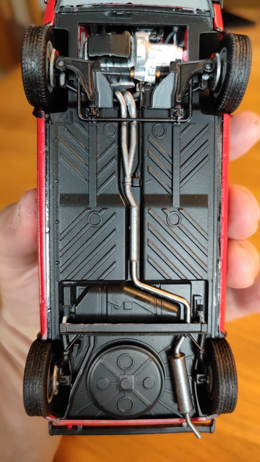 Ich habe mal panellining mit tamiya dunkelgrau versucht. Noch nicht perfekt, aber der Unterschied ist klar zu erkennen. Alterung gibt es nicht, denn meine Mutter hat den Wagen ständig geputzt und poliert, der sah immer aus, als stünde er im Autohaus.