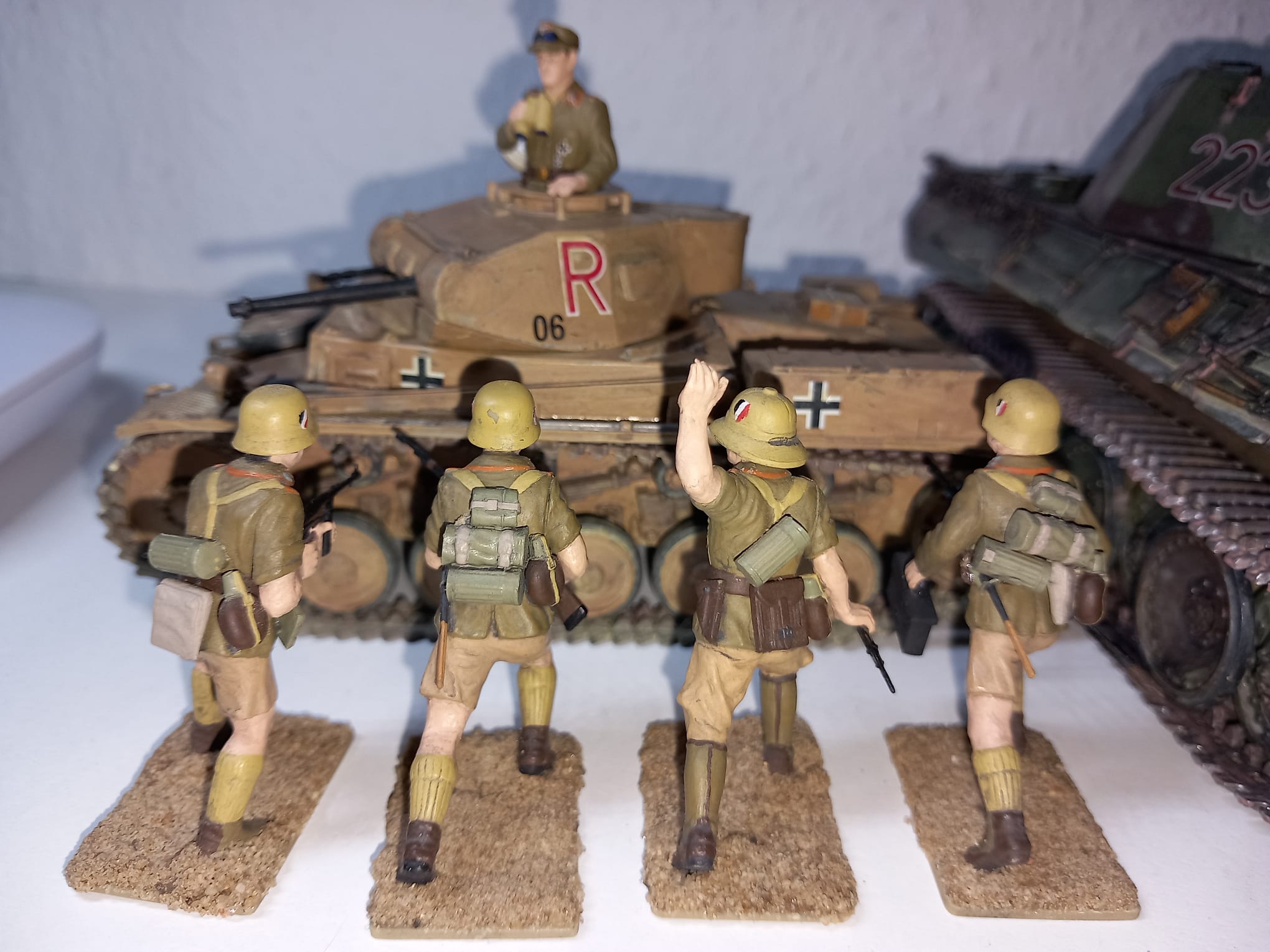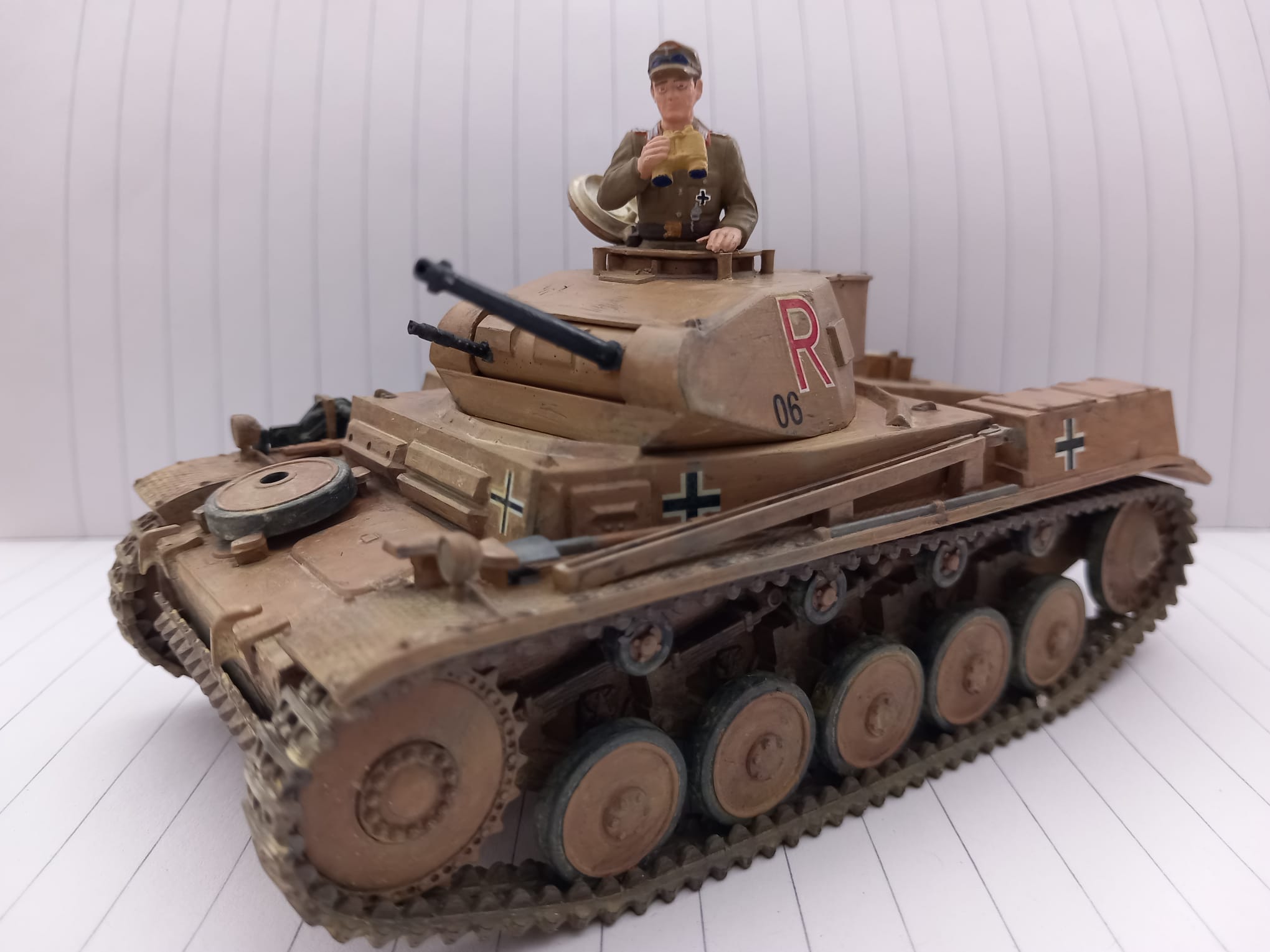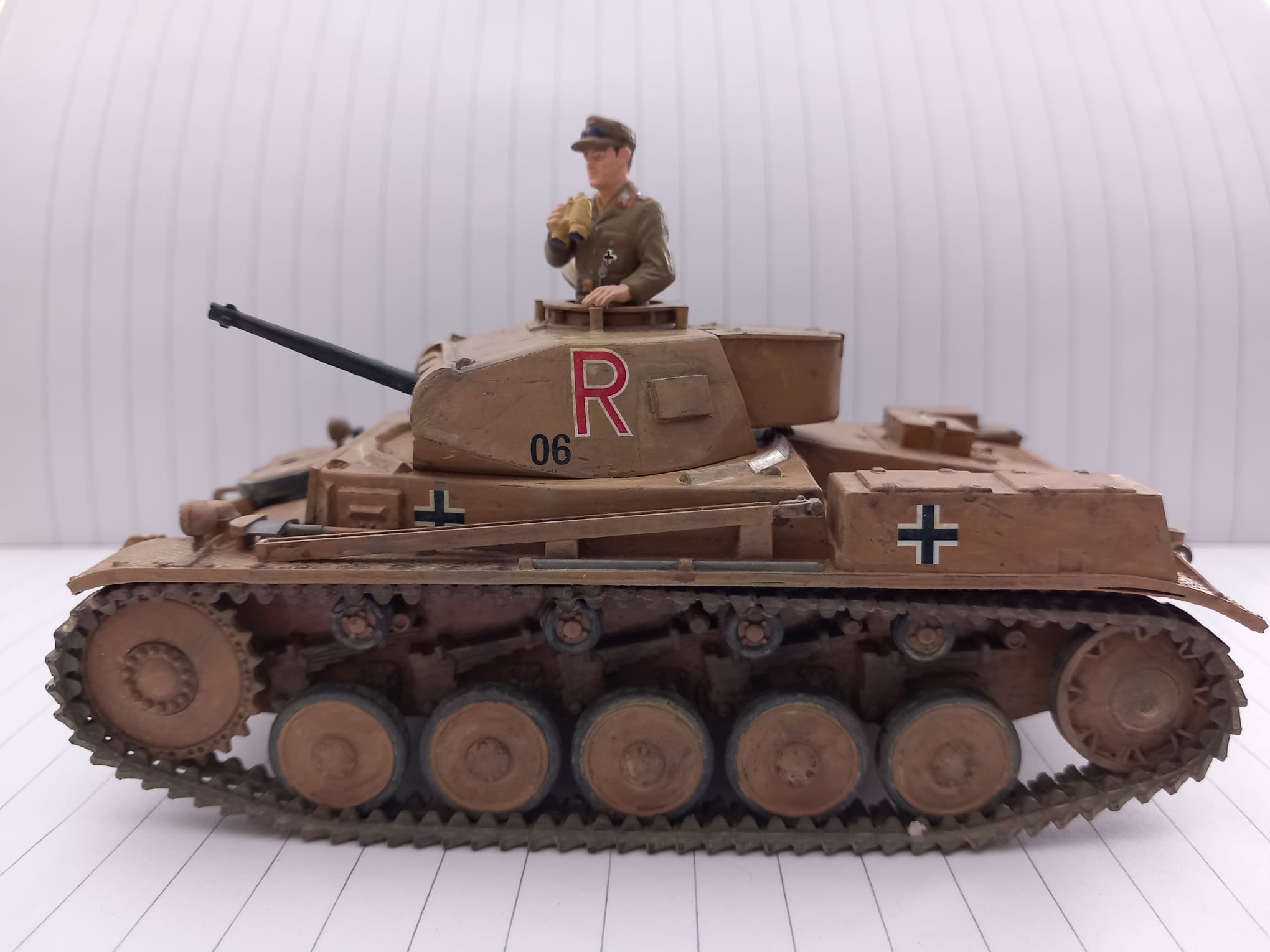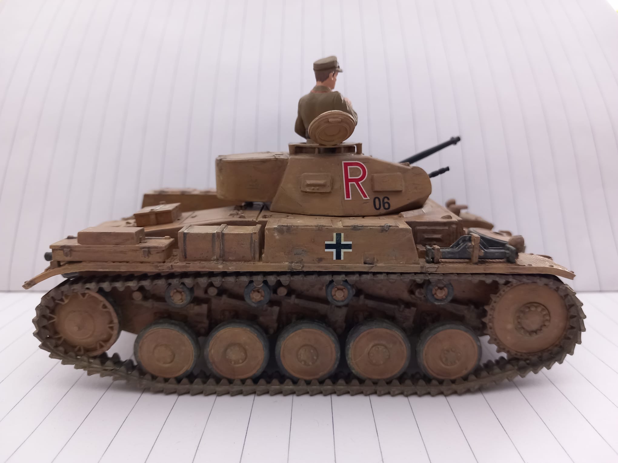 Heute möchte ich euch eins meiner letzten Projekte vorstellen, der Panzer Kampfwagen II Ausf. F/G oder auch das Sd.Kfz 121 von Tamiya in 1:35. Dieser Modellbausatz stammt aus dem Jahr 1971 und gleich nach dem ersten betrachten der Guss Äste, wie auch bei meinen Letzten Tamiya Satz (Panzer Kampfwagen V), sehr große Ernüchterung. Wir haben wieder ein Loch zwischen Unter und Oberwanne, was ich mit Bastelkarton bearbeiten musste und die einzelnen Teile mussten alle ordentlich skalpiert und geschliffen werden, auch diesmal hatten ich sehr viel Spiel zwischen den Teilen so das auch Plaste zum Einsatz gekommen ist. Diesmal habe ich mich für eine Kratz und Wasch-Technik entschieden, da ich mir erst vor kurzen den Panzer Kampfwagen IV (Frederike) im Panzermuseum Munster genau angesehen und Studiert hatte, da konnte man schön an den ein oder anderen stellen die Hellgraue Grundierung sehen. Die Figuren waren Natürlich auch nicht so schön detailliert wie sie bei Aktuellen Sätzen sind, ist ja aber auch dem Alter geschuldet. Diesmal habe ich an den Ketten fast kein Metallabrieb und nur mit ordentlich Sand-Wasch bearbeitet da dieses Fahrzeug ja auf unbefestigten Sandstraßen in Afrika unterwegs war. Dieses Fahrzeug habe ich der 15. Panzer Division zugeordnet also zwischen April 1941 - Dezember 1942. Jetzt Kurz noch etwas zur Geschichte und dann bekommt ihr direkt die Bilder.