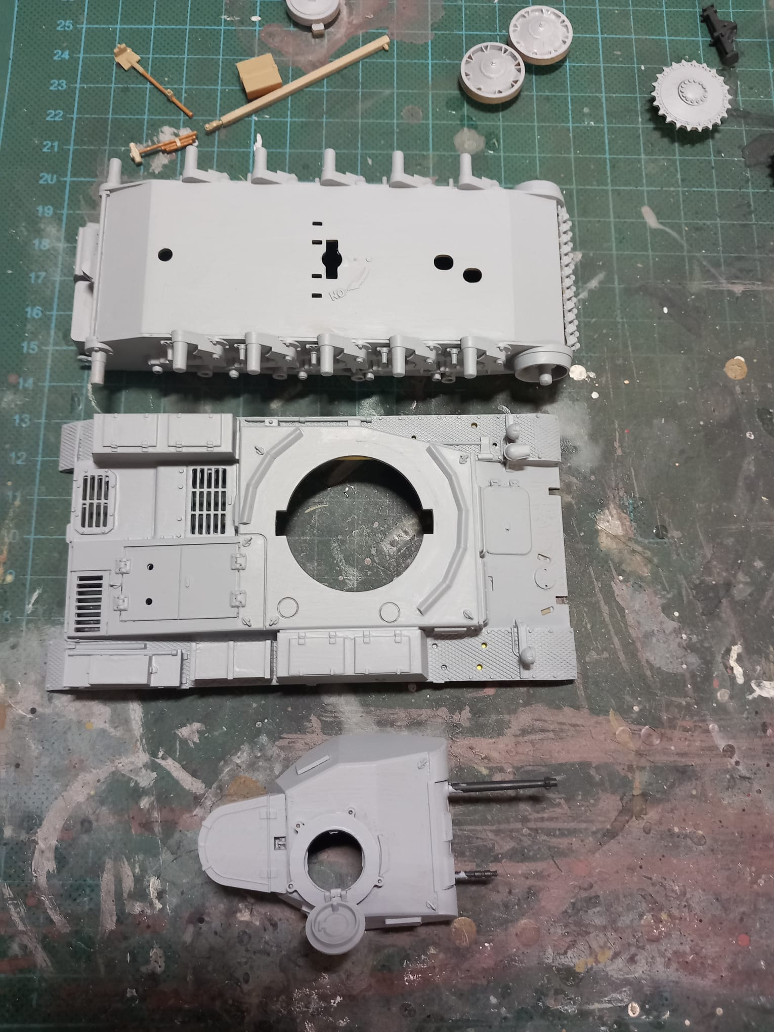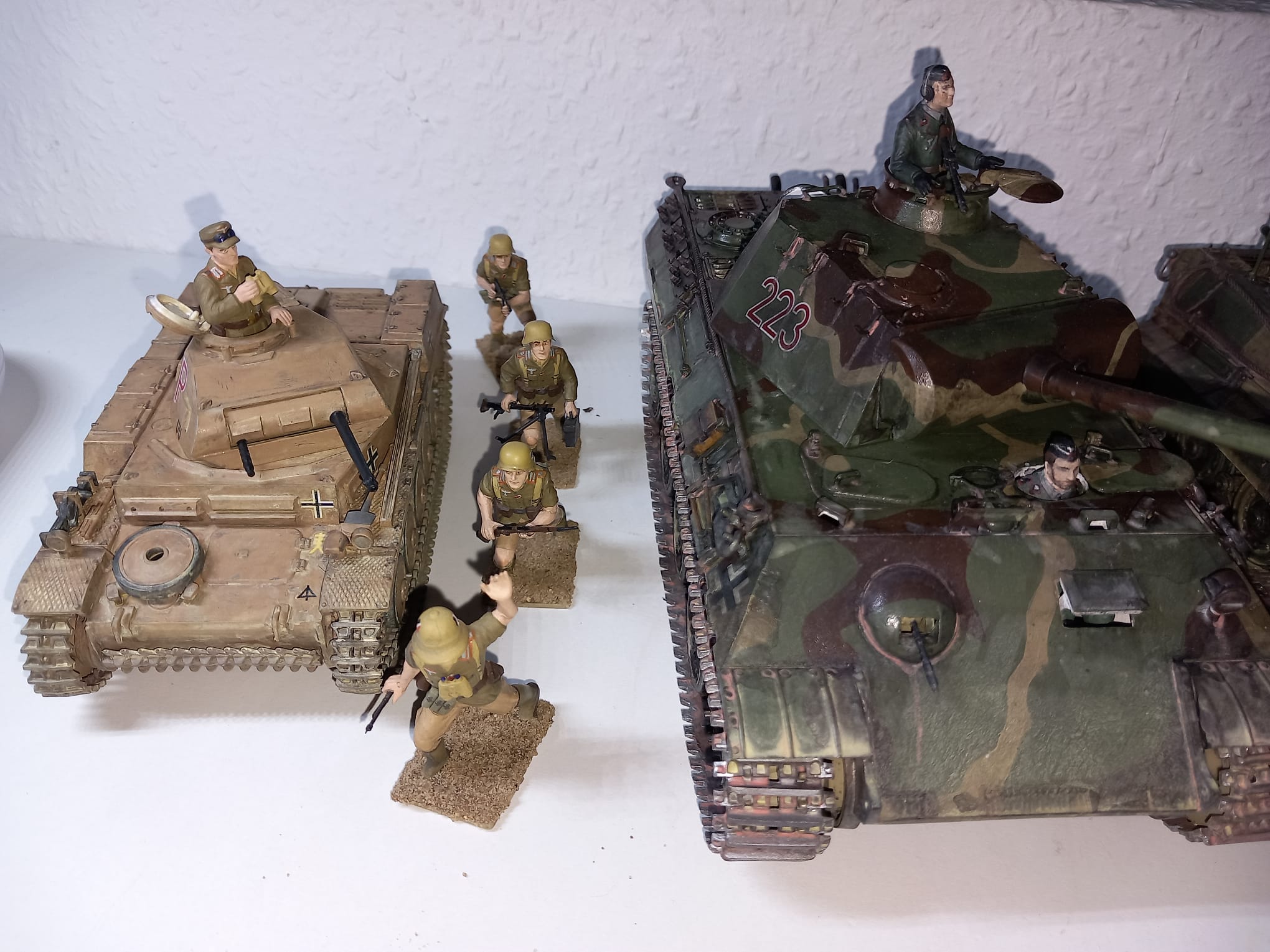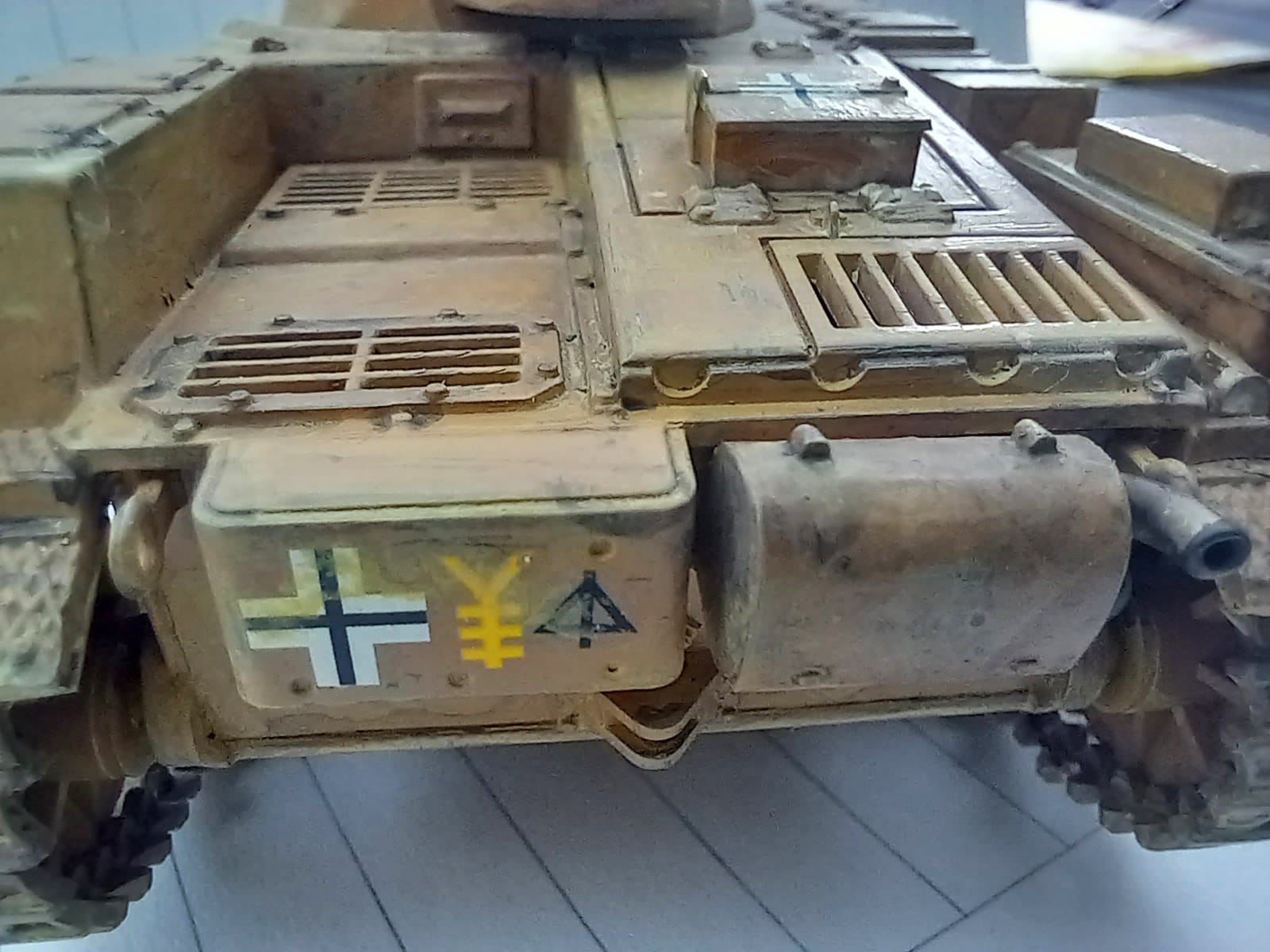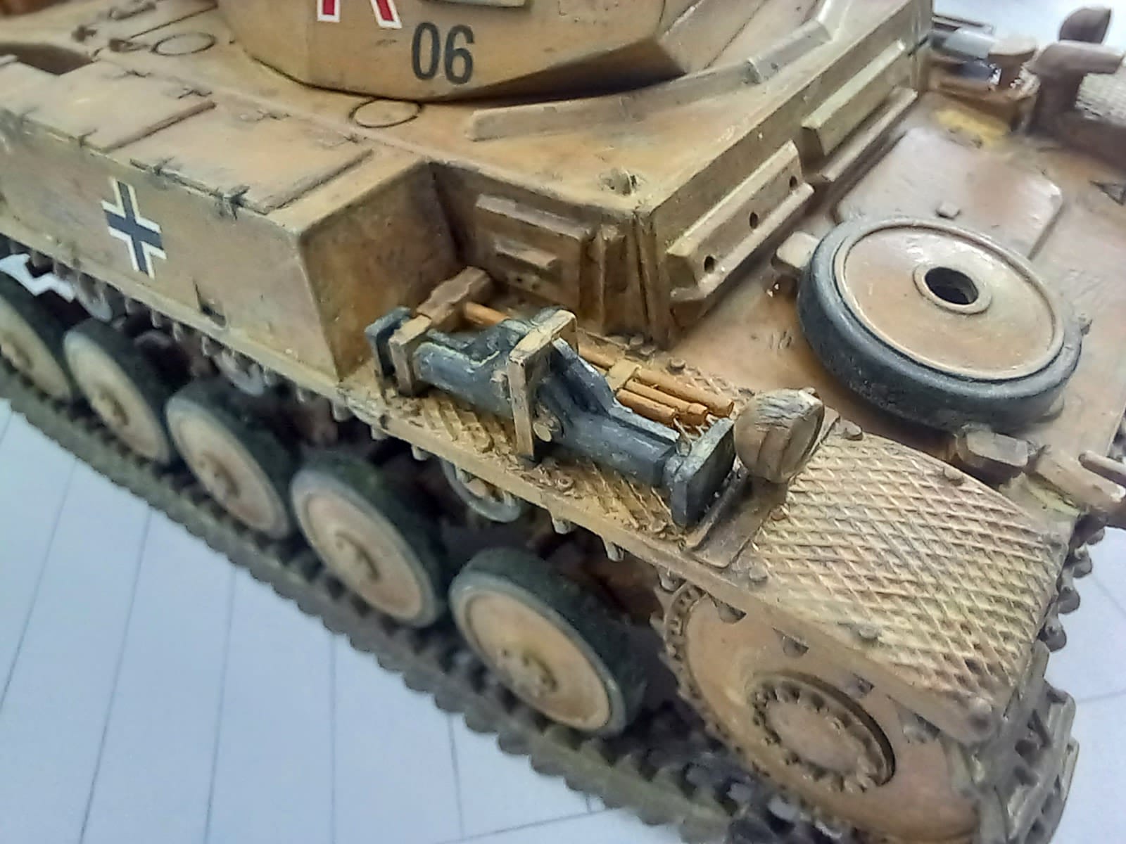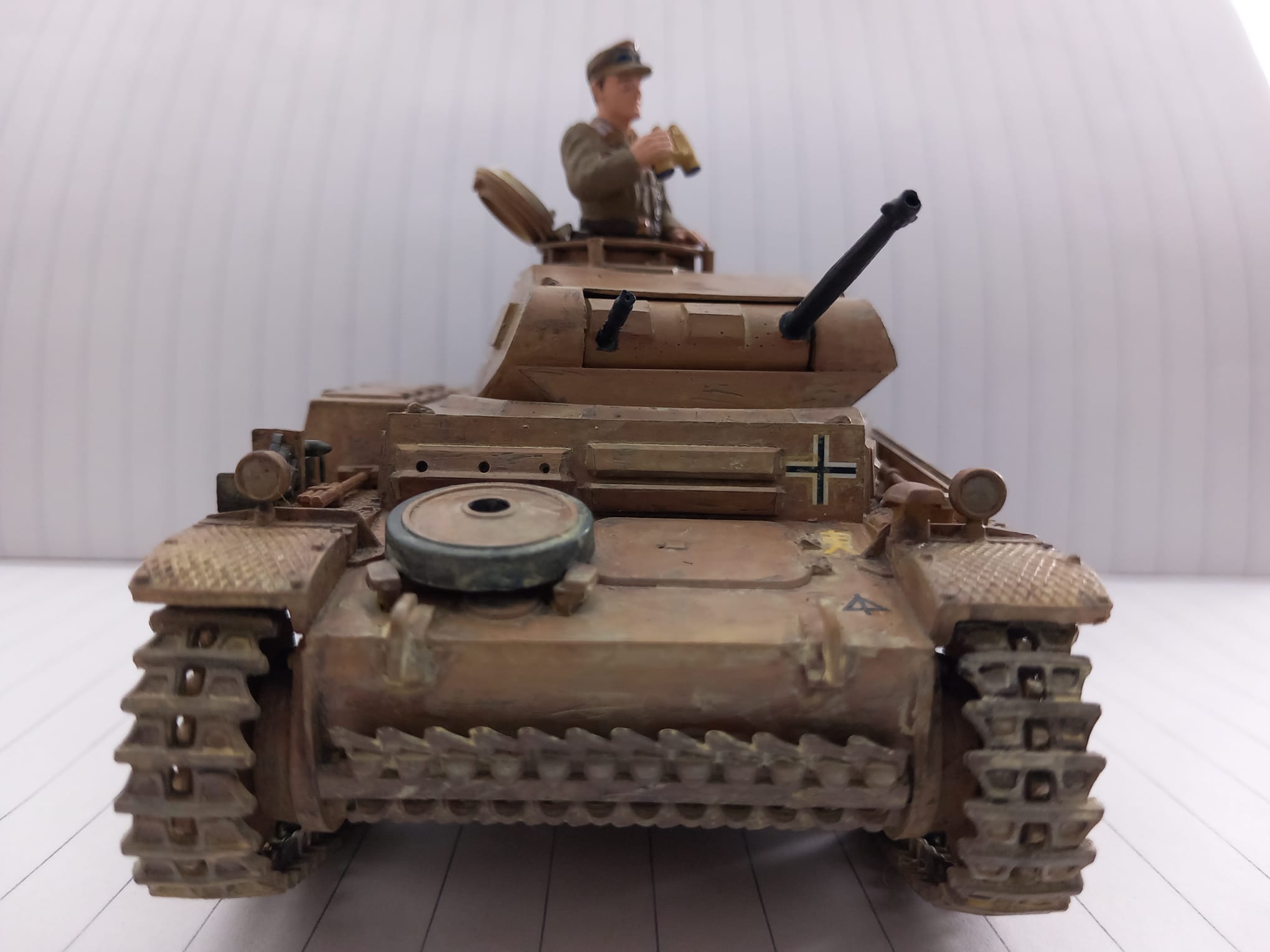 Heute möchte ich euch eins meiner letzten Projekte vorstellen, der Panzer Kampfwagen II Ausf. F/G oder auch das Sd.Kfz 121 von Tamiya in 1:35. Dieser Modellbausatz stammt aus dem Jahr 1971 und gleich nach dem ersten betrachten der Guss Äste, wie auch bei meinen Letzten Tamiya Satz (Panzer Kampfwagen V), sehr große Ernüchterung. Wir haben wieder ein Loch zwischen Unter und Oberwanne, was ich mit Bastelkarton bearbeiten musste und die einzelnen Teile mussten alle ordentlich skalpiert und geschliffen werden, auch diesmal hatten ich sehr viel Spiel zwischen den Teilen so das auch Plaste zum Einsatz gekommen ist. Diesmal habe ich mich für eine Kratz und Wasch-Technik entschieden, da ich mir erst vor kurzen den Panzer Kampfwagen IV (Frederike) im Panzermuseum Munster genau angesehen und Studiert hatte, da konnte man schön an den ein oder anderen stellen die Hellgraue Grundierung sehen. Die Figuren waren Natürlich auch nicht so schön detailliert wie sie bei Aktuellen Sätzen sind, ist ja aber auch dem Alter geschuldet. Diesmal habe ich an den Ketten fast kein Metallabrieb und nur mit ordentlich Sand-Wasch bearbeitet da dieses Fahrzeug ja auf unbefestigten Sandstraßen in Afrika unterwegs war. Dieses Fahrzeug habe ich der 15. Panzer Division zugeordnet also zwischen April 1941 - Dezember 1942. Jetzt Kurz noch etwas zur Geschichte und dann bekommt ihr direkt die Bilder.