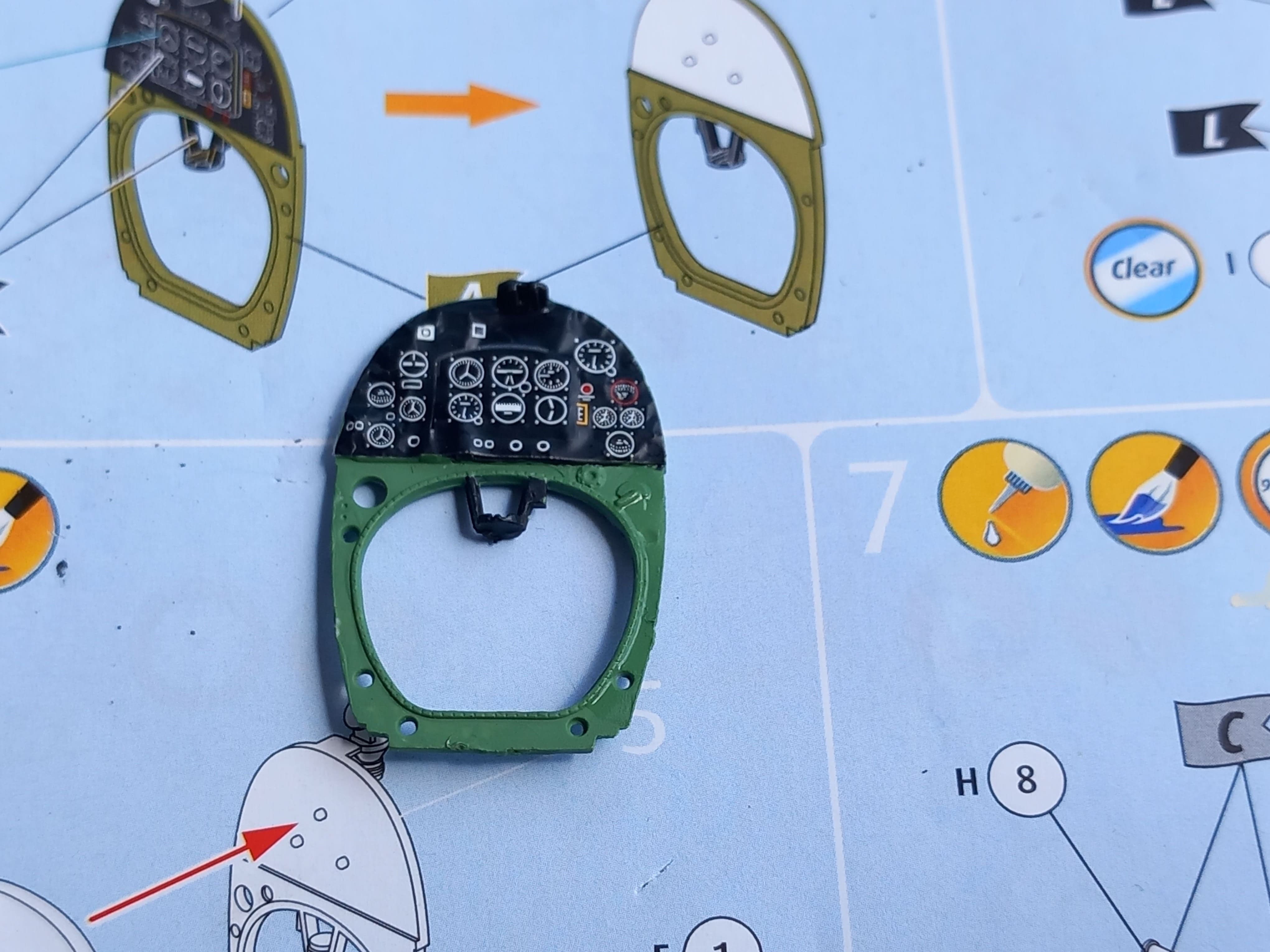 Die Armaturen im Cockpit sind auch angebracht. Eigentlich wollte ich die Spitfire mit Eduard Ätzteilen verschönern die Teile sind ausverkauft. Wenn ich das Armaturenbrett jetzt so sehe sind die beiliegenden Decals schon recht ausführlich.