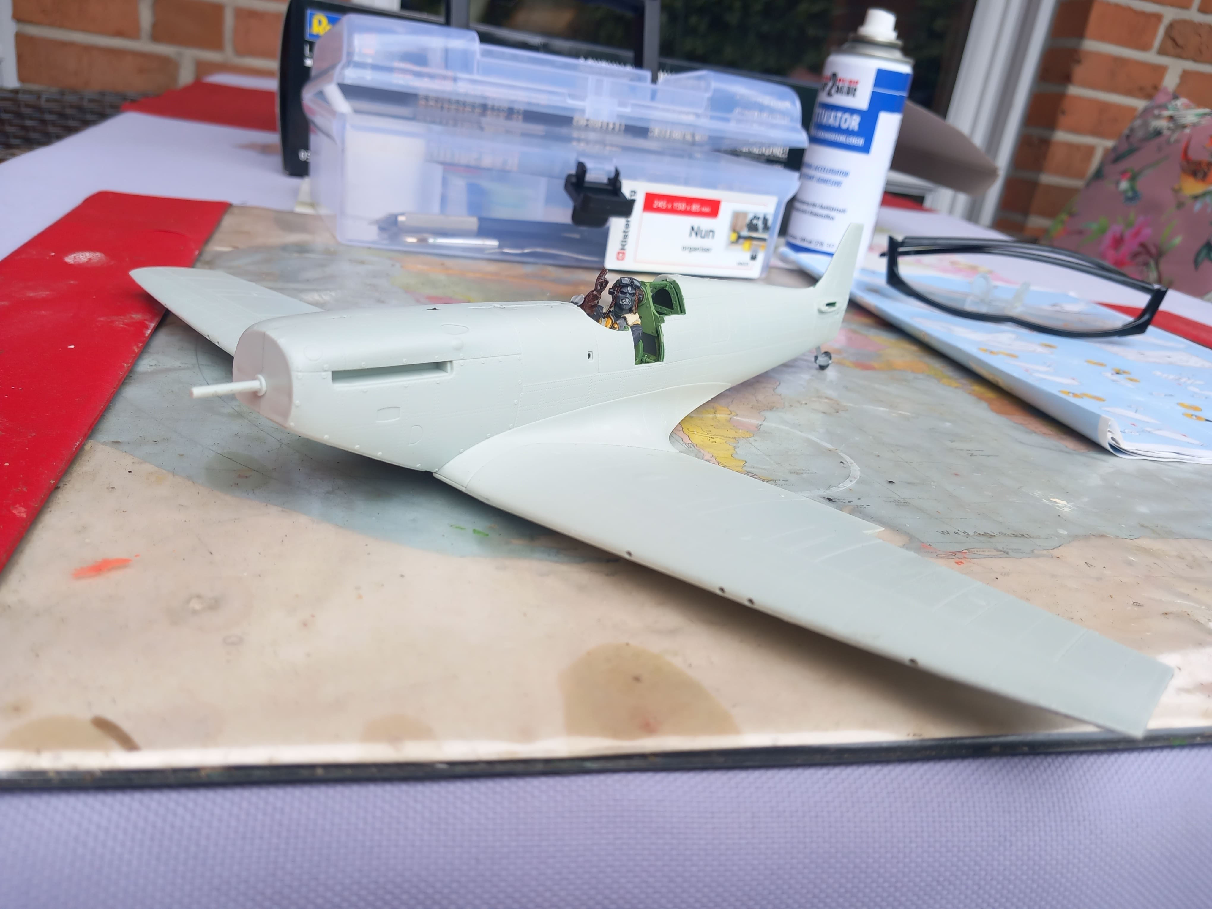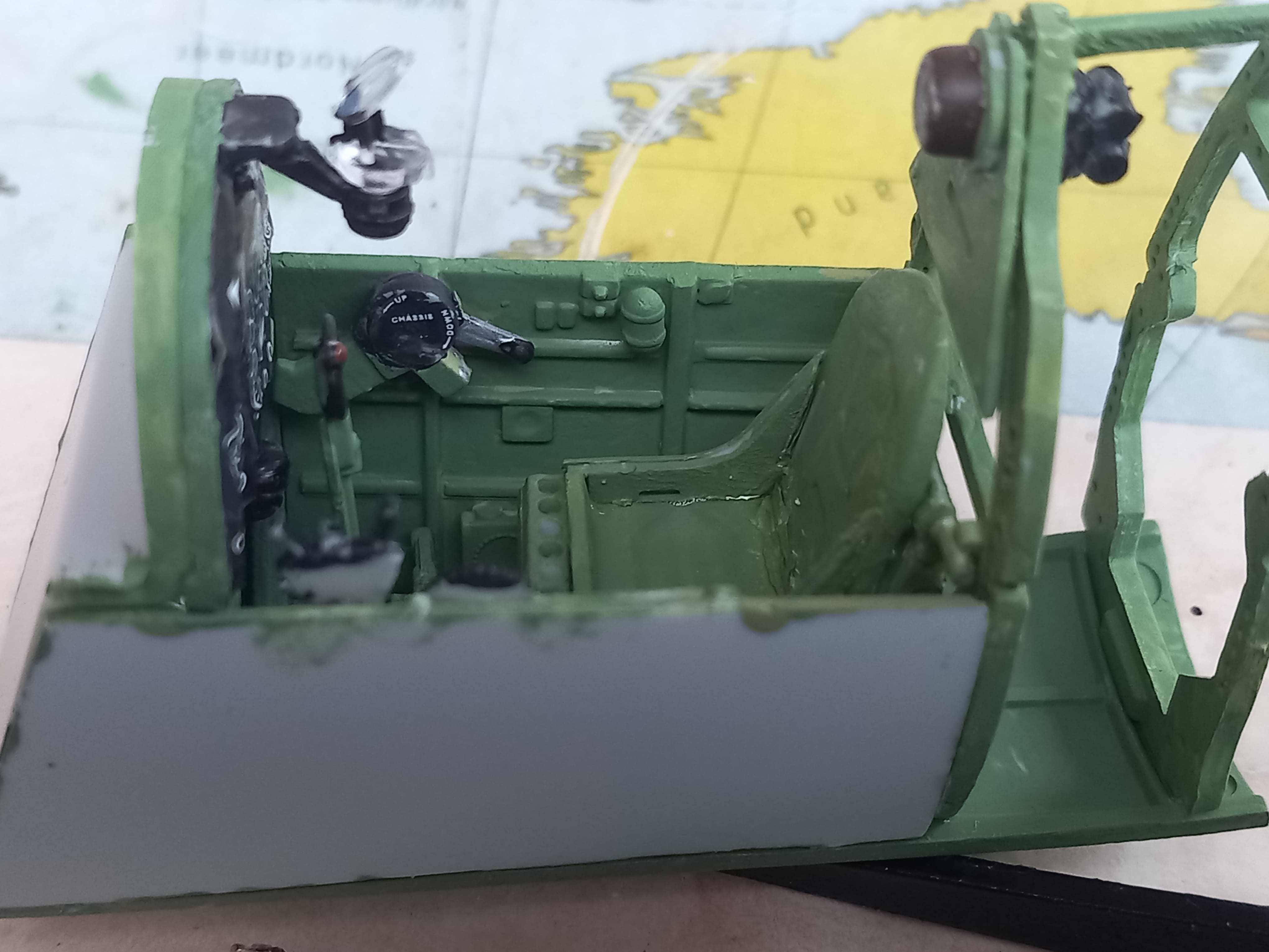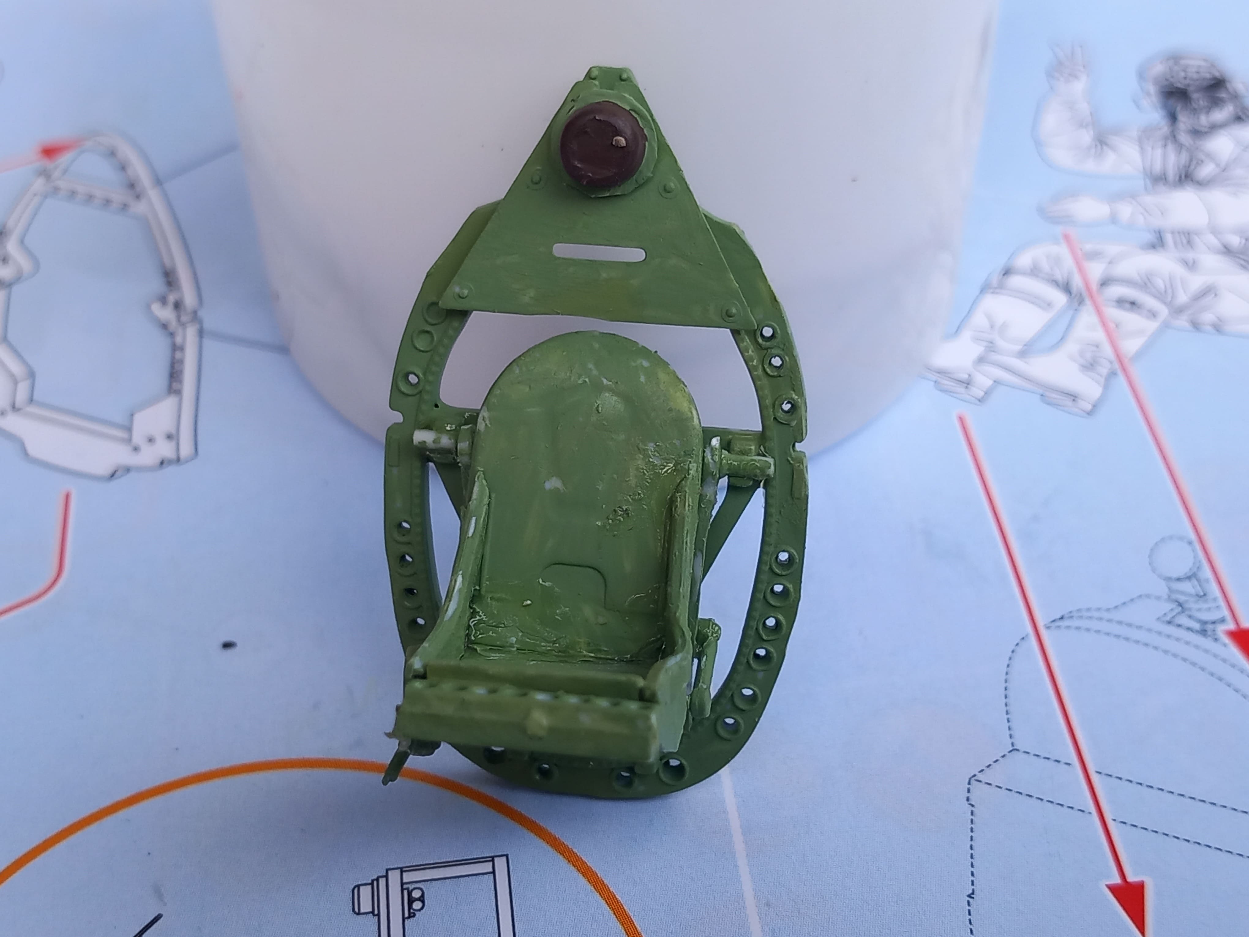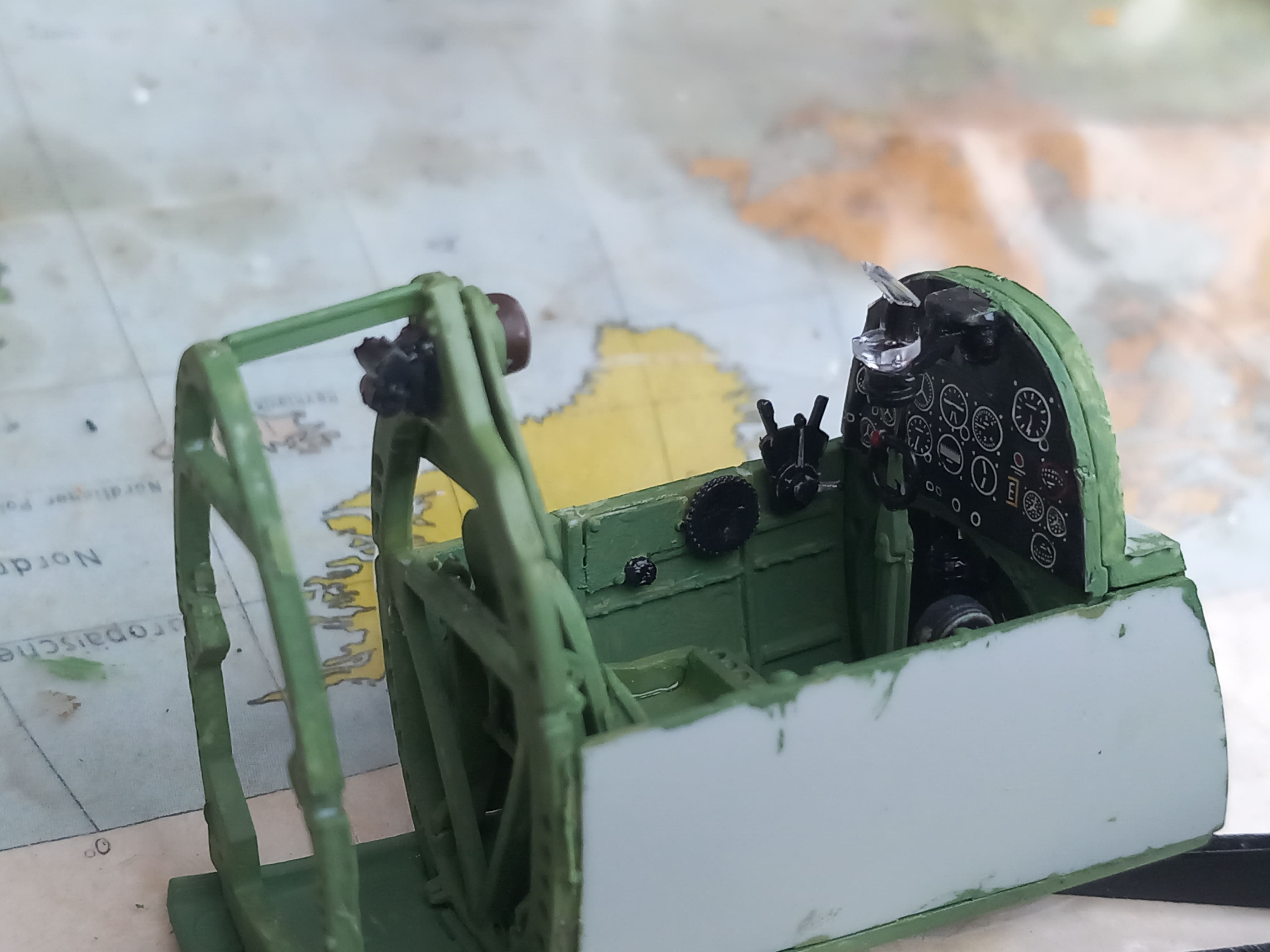 Das Cockpit ist jetzt komplett bestückt und Eddie hat Platz genommen. Eddie hat aber ein wenig zu lange Beine, so daß die Pedalen heruntergedrückt werden müssen damit er hineinpasst. Also es passt so gerade eben. Das Cockpit ist sehr ausführlich und die farbige Anleitung echt super. Der Bausatz gefällt mir bisher sehr gut auch wenn Gratreste an den größeren Bauteilen sichtbar sind.