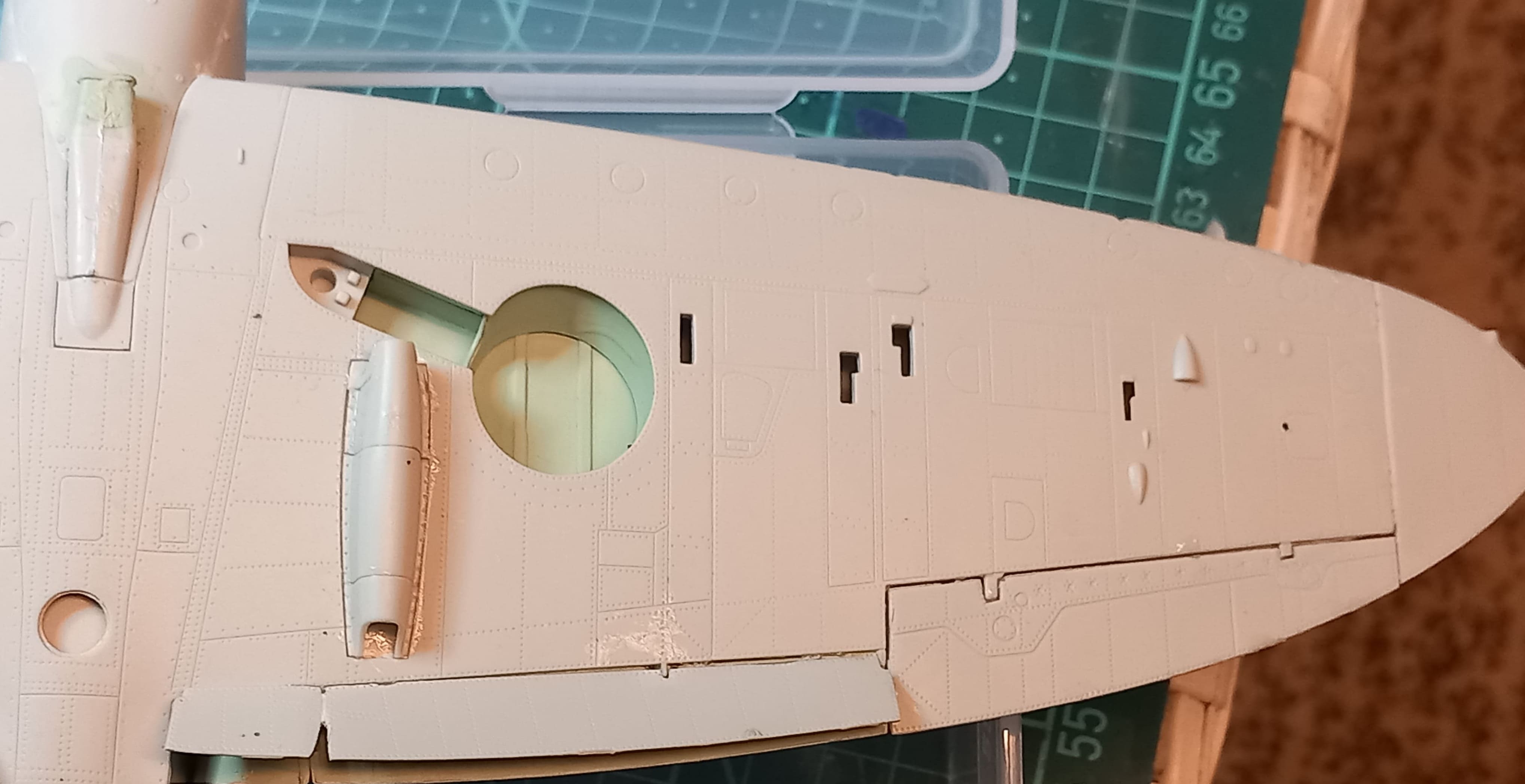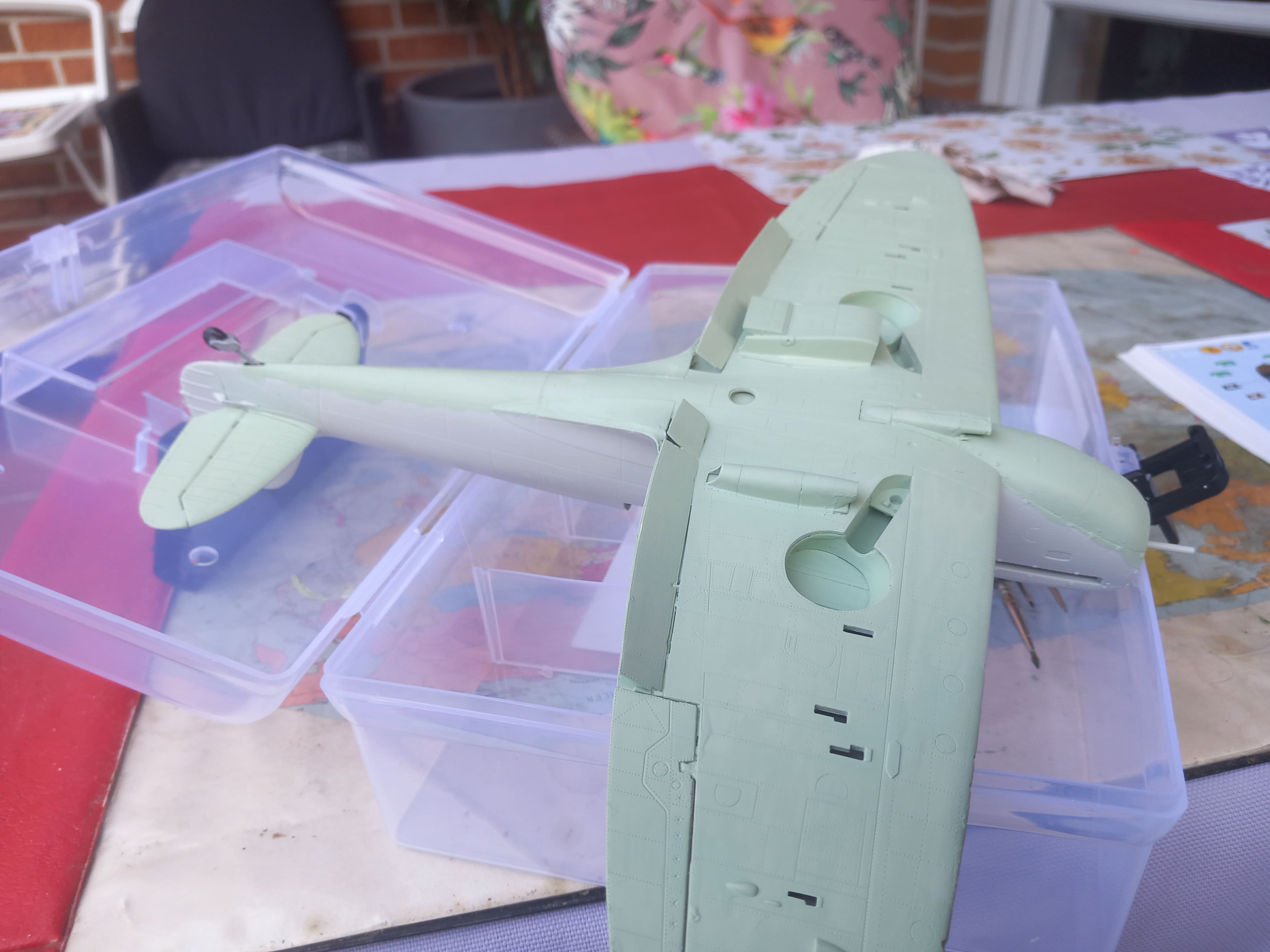 Die Rumpfinnenseiten auf Höhe des Cockpits sind bestückt, Rumpf wurde zusammengesetzt und die Tragflächen sind drunter.