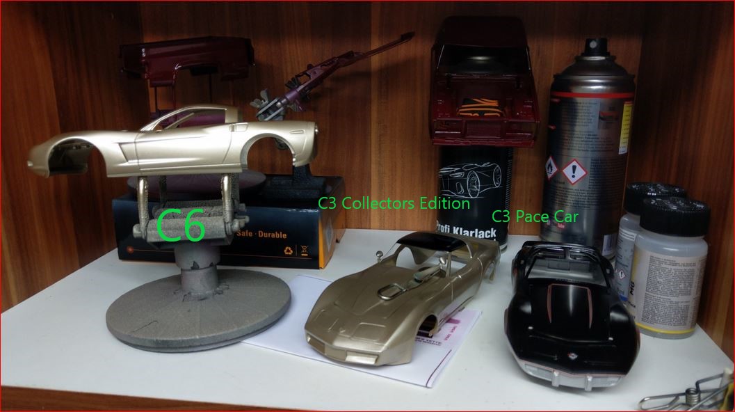 Bei der C6 wartet auf die letzte Schicht Klarlack und die C3 Collectors Edition wartet auf Decals (welche ich noch drucken muss)