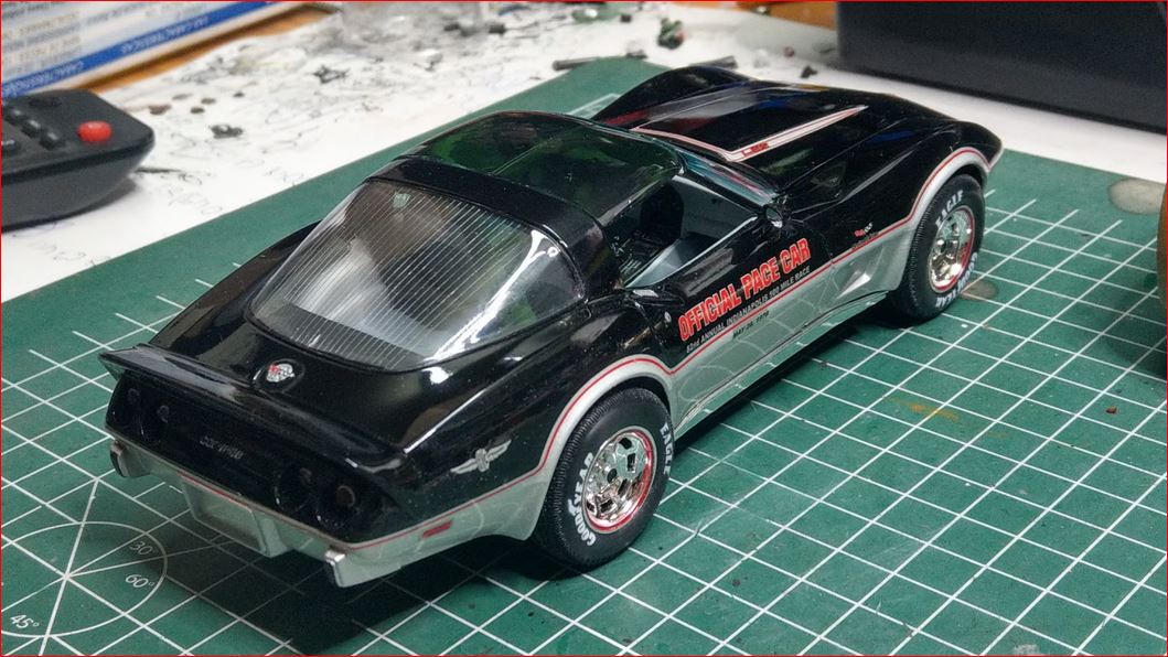 An meinem PaceCar geht es auf die Zielgerade. Nach einer kurzen Recherche, muss ich den inneren Absatz unter der Heckscheibe noch Antrazit lackieren. Der T-Top-Steg soll poliertes Edelstahl sein.