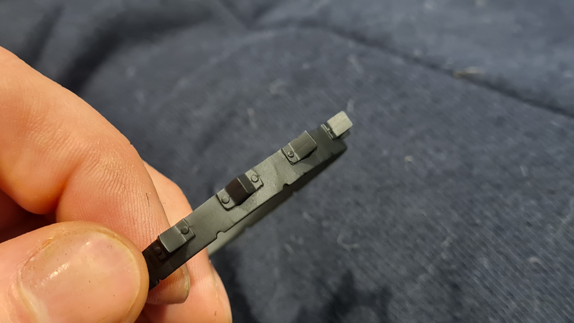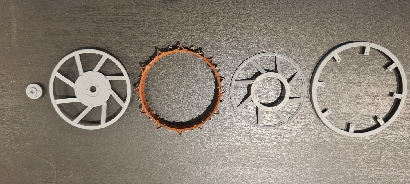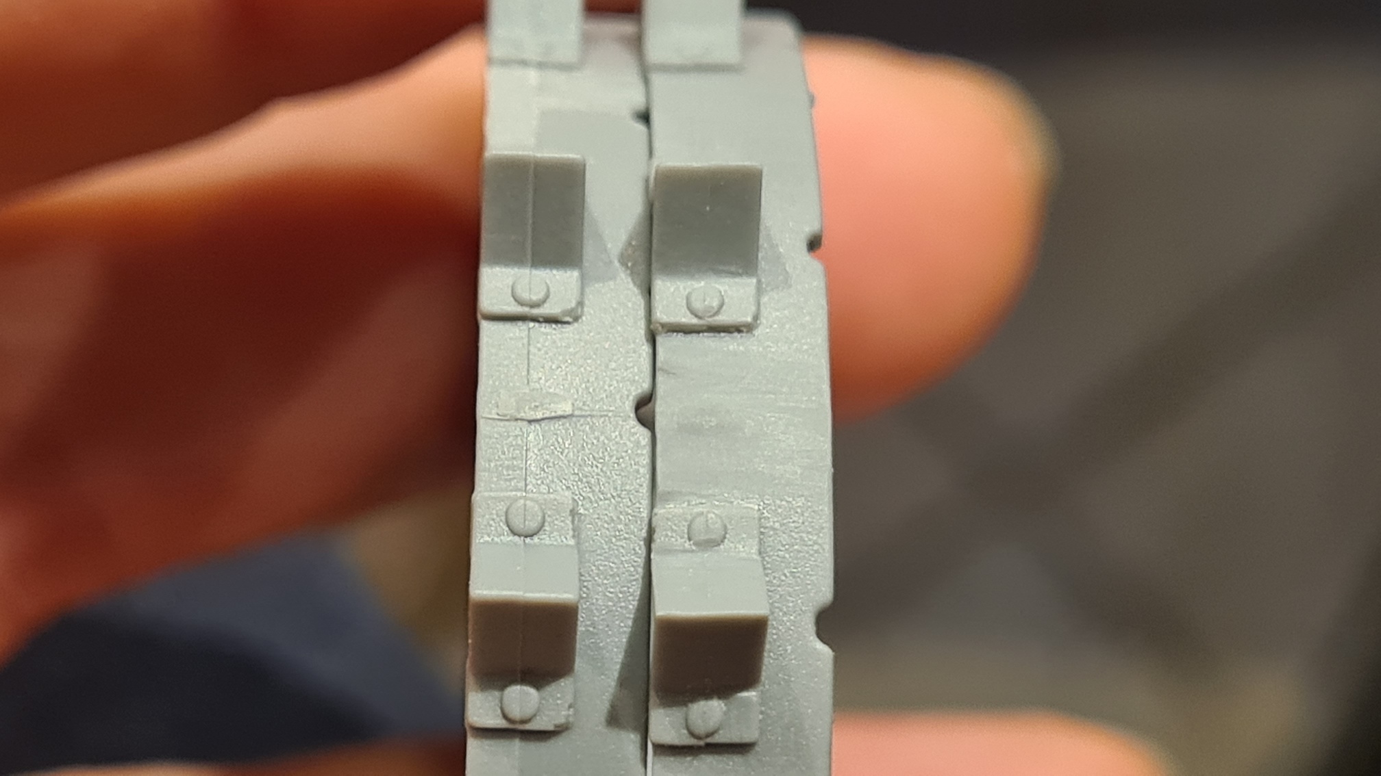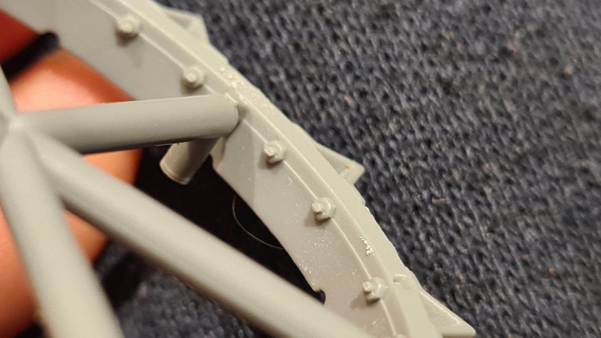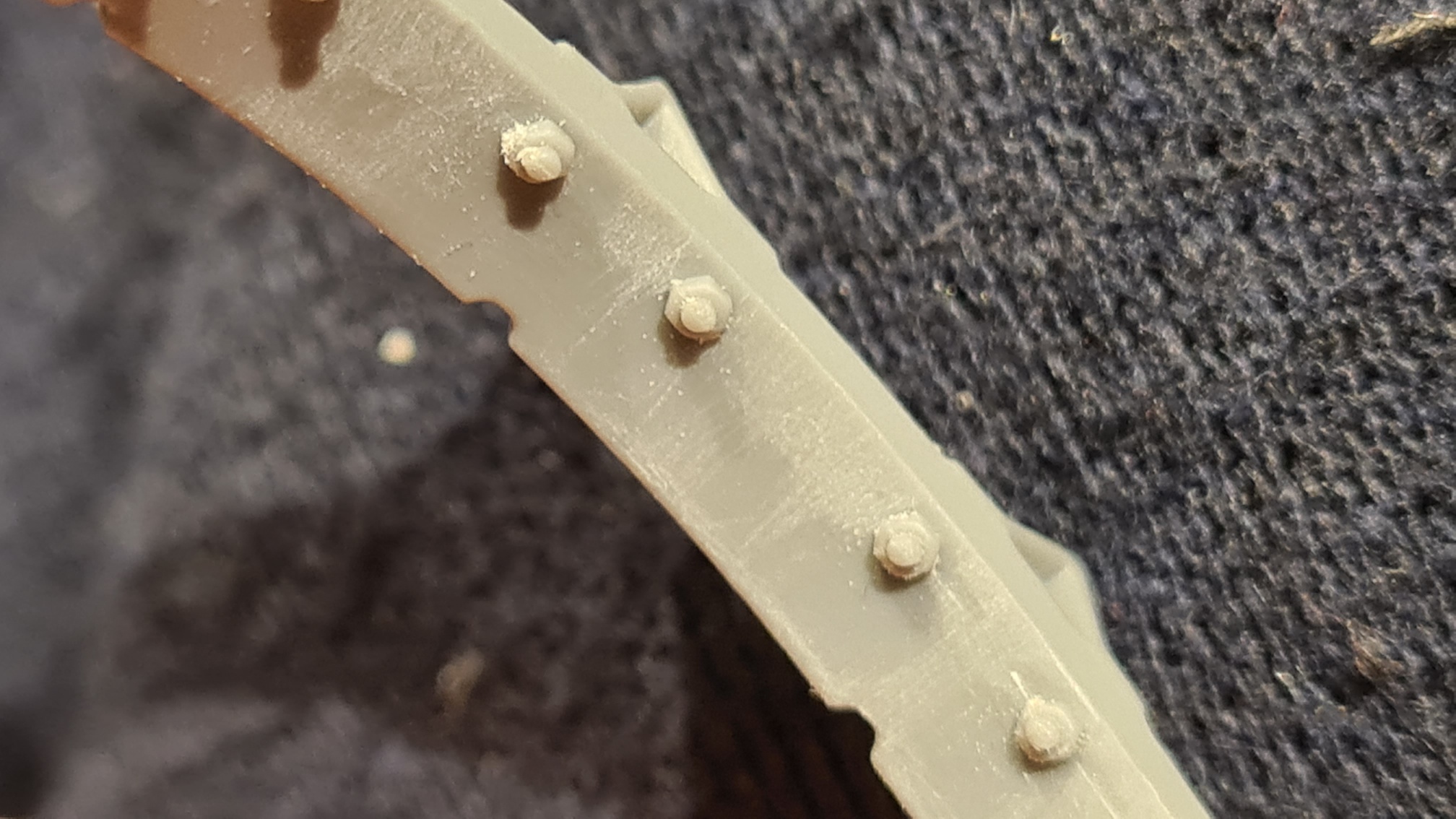 Ich hatte ja bereits in der Bausatzvorstellung die Spritzgussnaht in den Rädern gezeigt. Diese dann auszufeilen war die erste Frustaufgabe. Auf dem folgenden Bild, kann man rechts das verbesserte Resultat sehen, links ein unbehandeltes Objekt: