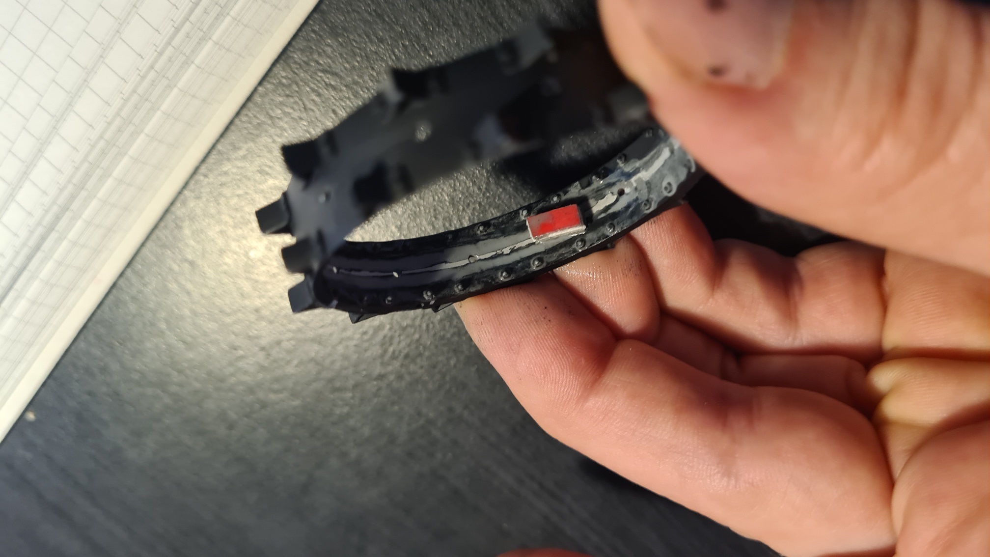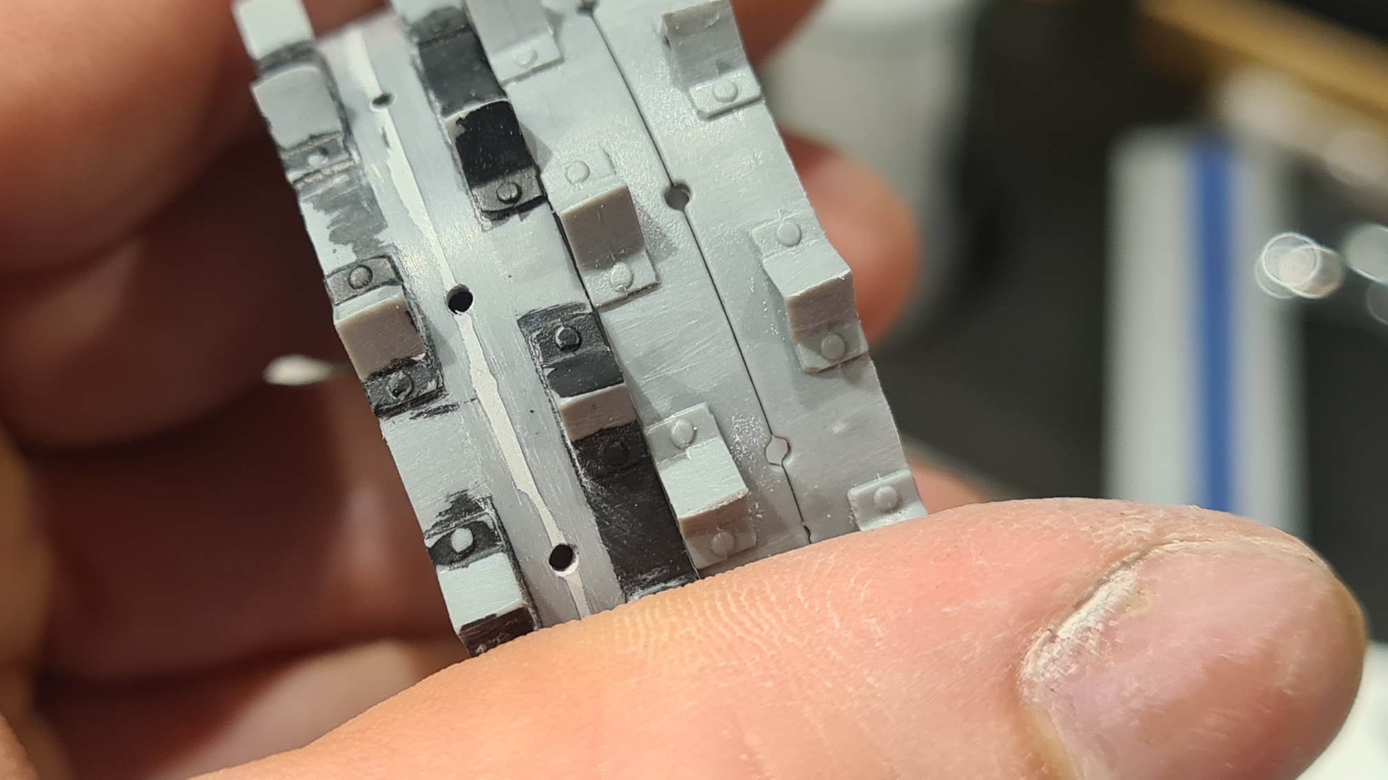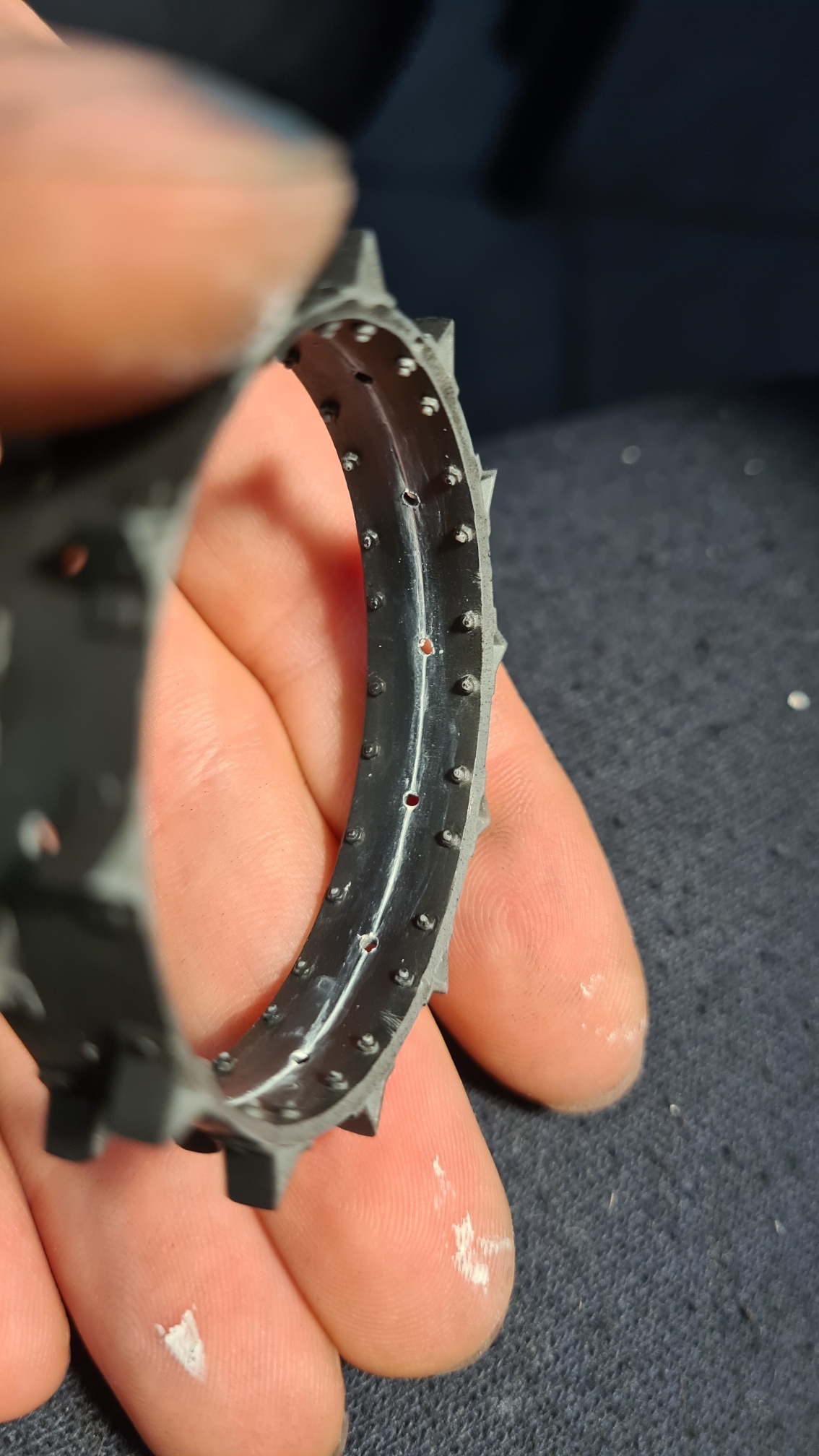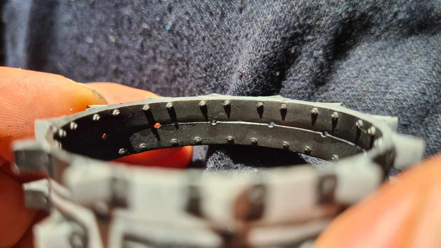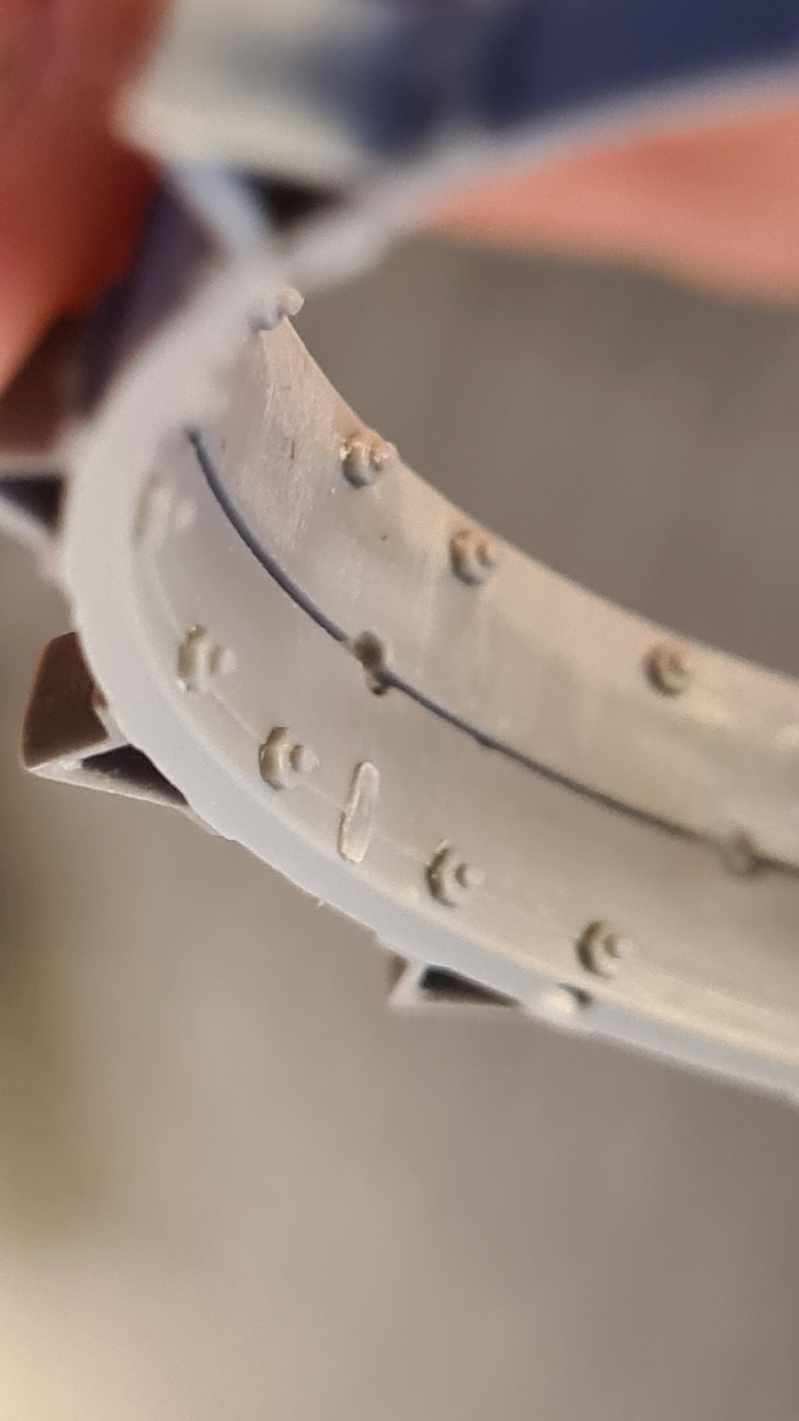 Die Innenseite hingegen ist eine Quahl. Das Problem ist die schwierige Zugänglichkeit. Im ersten Versuch habe ich Vallejo Plastic Putty mit der Fingerspitze verschmiert:
