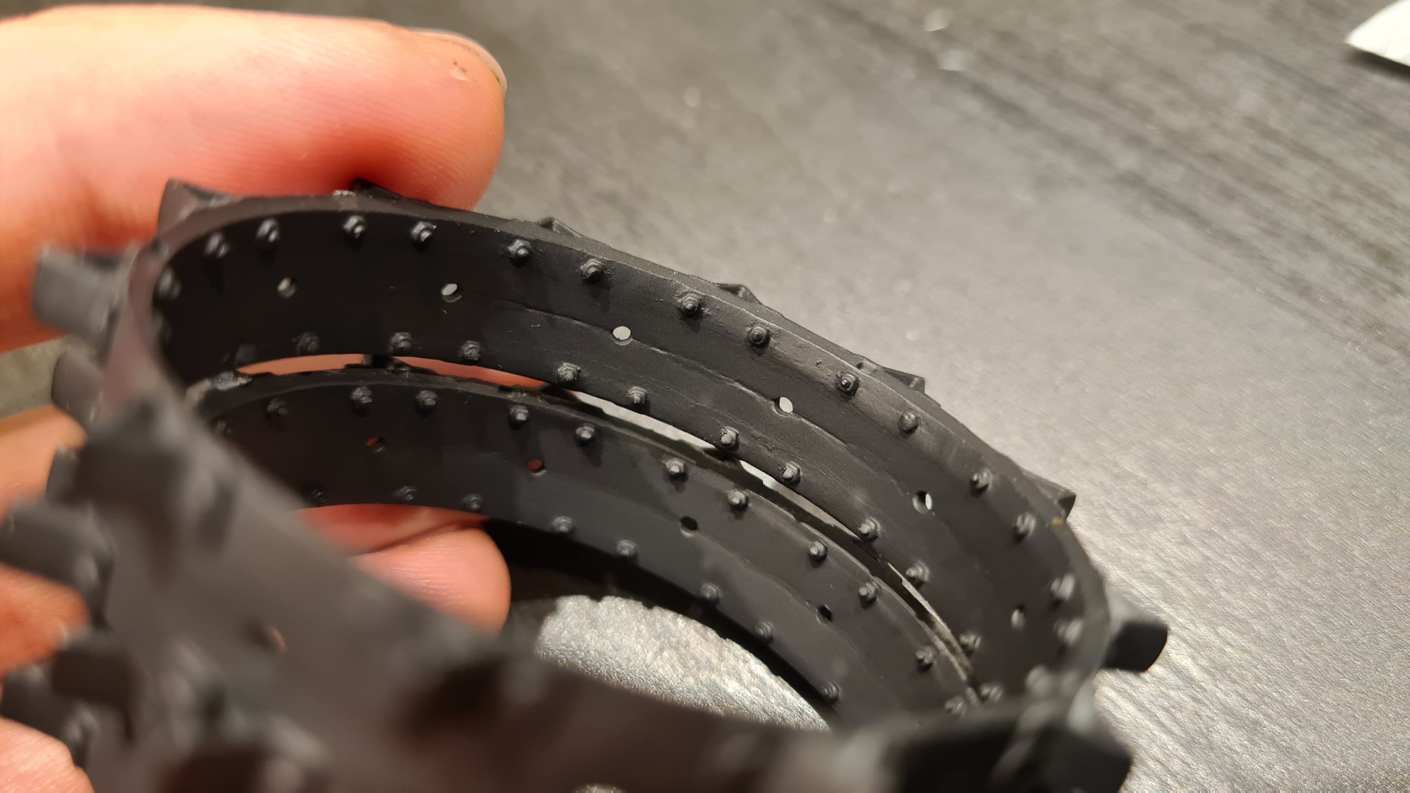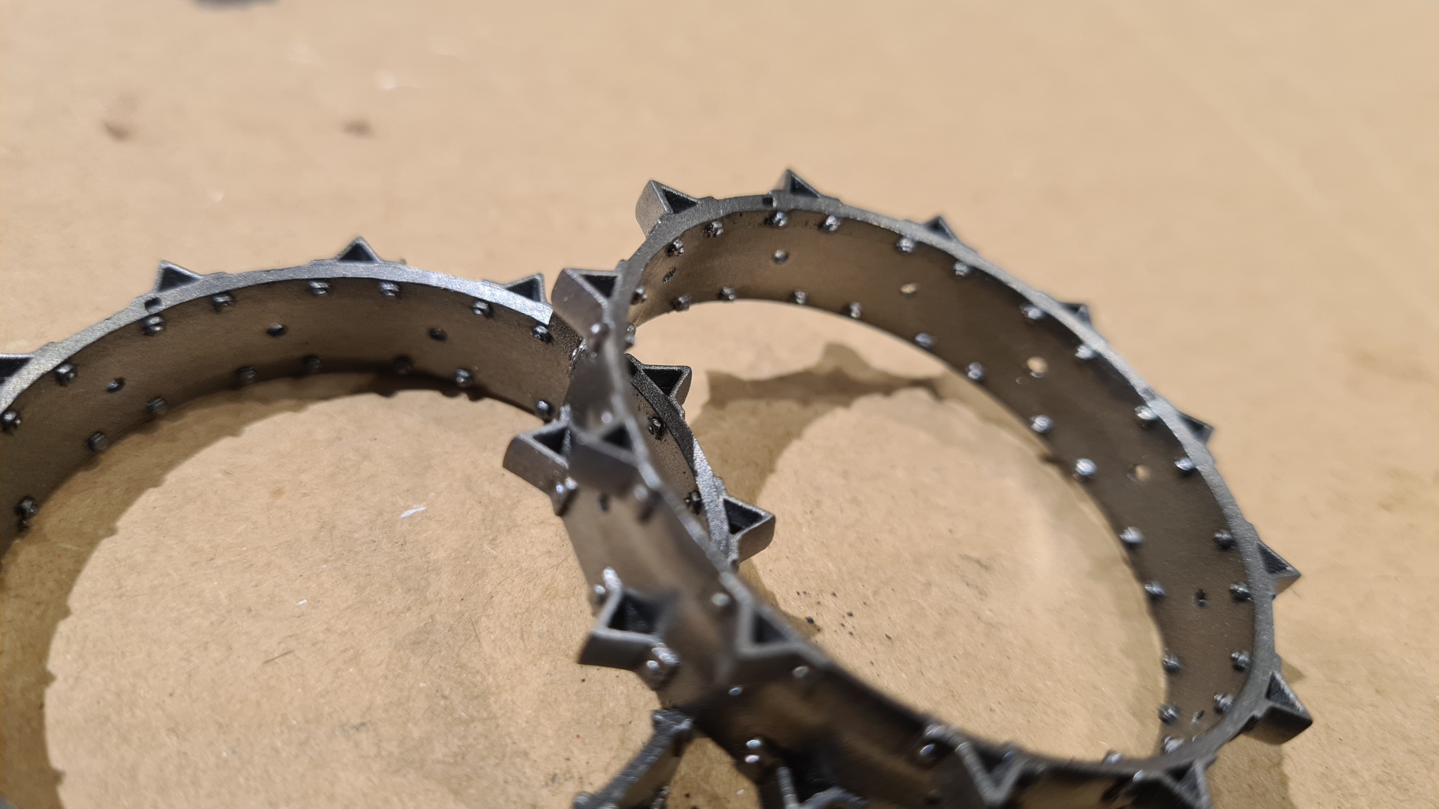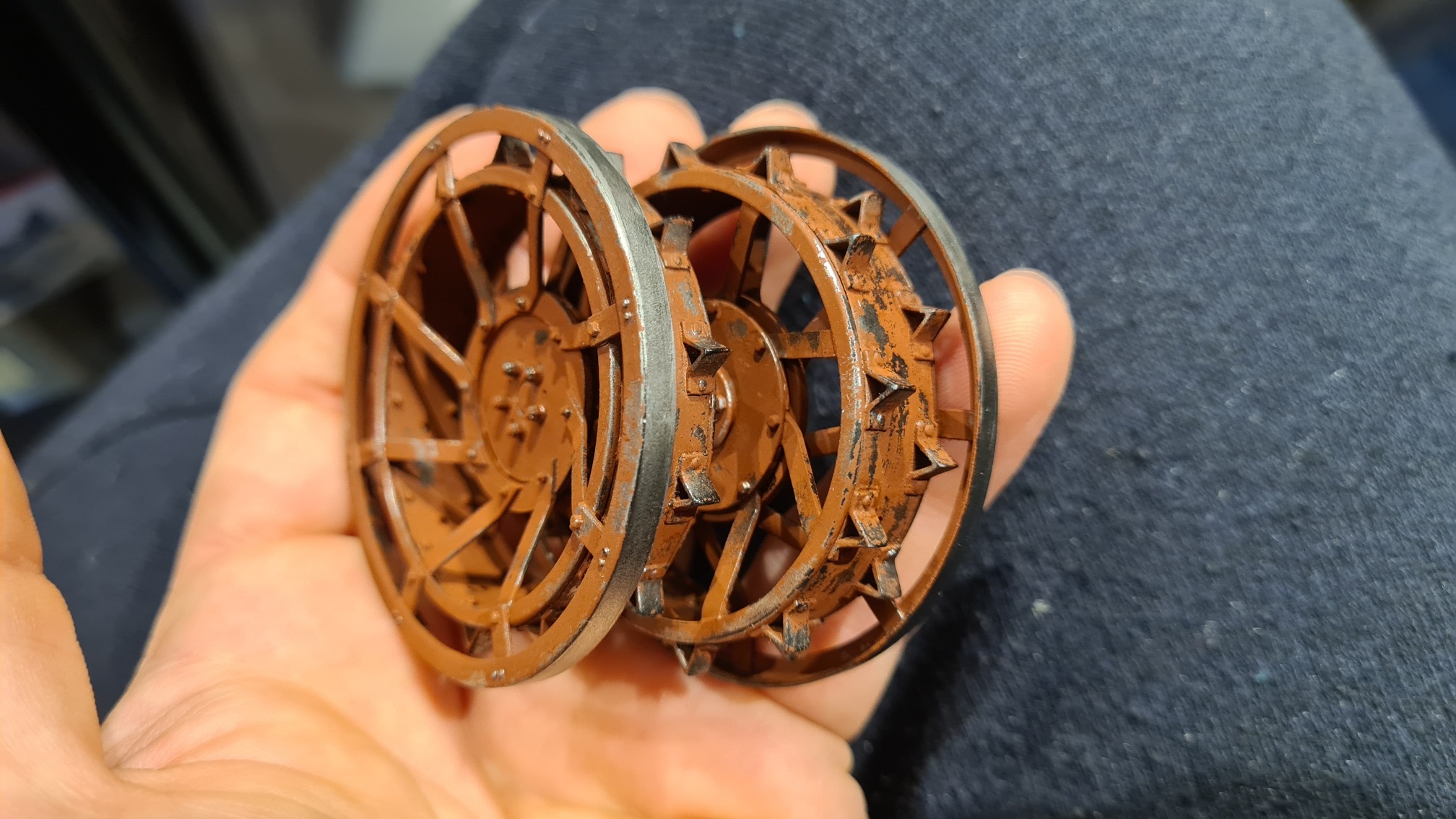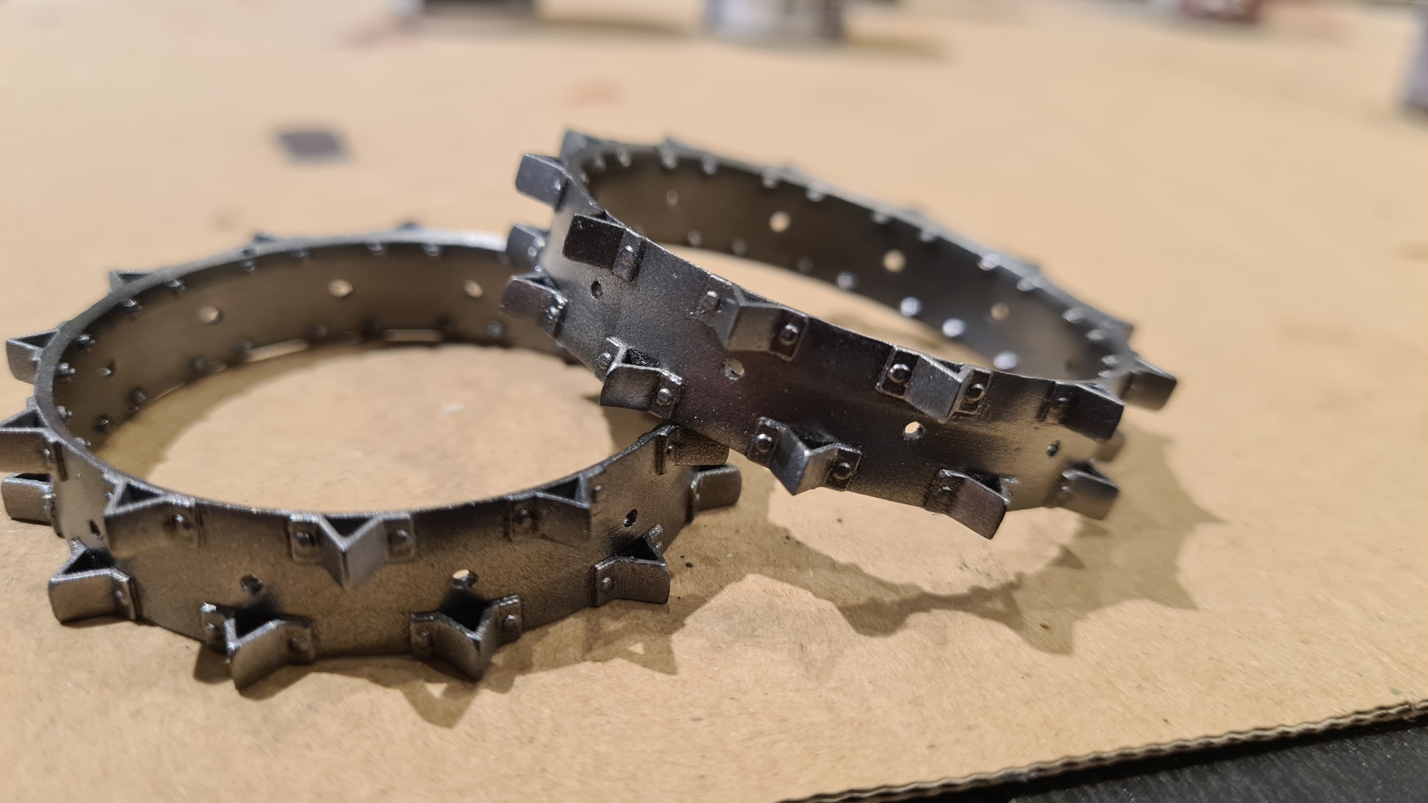 Nun muss man sich vorstellen, dass jedes Hinterrad aus zwei solcher Stahlzackenreifen zusammengebaut wird, in etwa so: