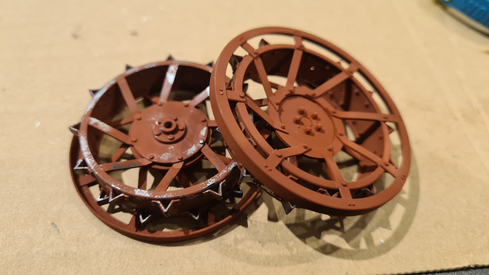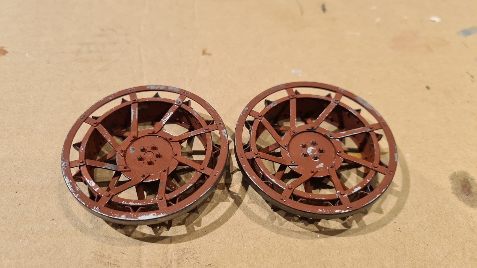 Später sollen die Räder rotbraun lackiert sein mit etwas Abnutzung. An den abgenutzten Stellen soll der blanke Edelstahl durchscheinen. Eigentlich mehr oder weniger wie auf dem Karton-Foto. Daher wurde als nächstes 2x Alclad 2 Microfiller schwarz gesprüht