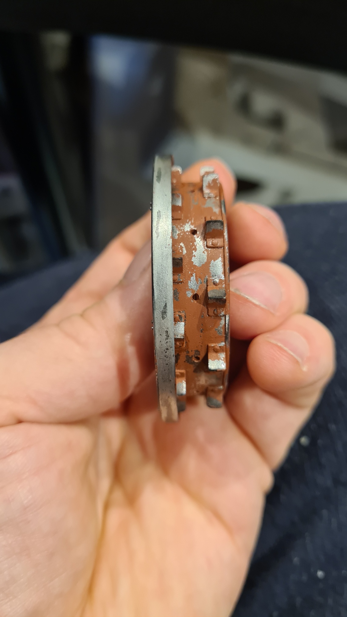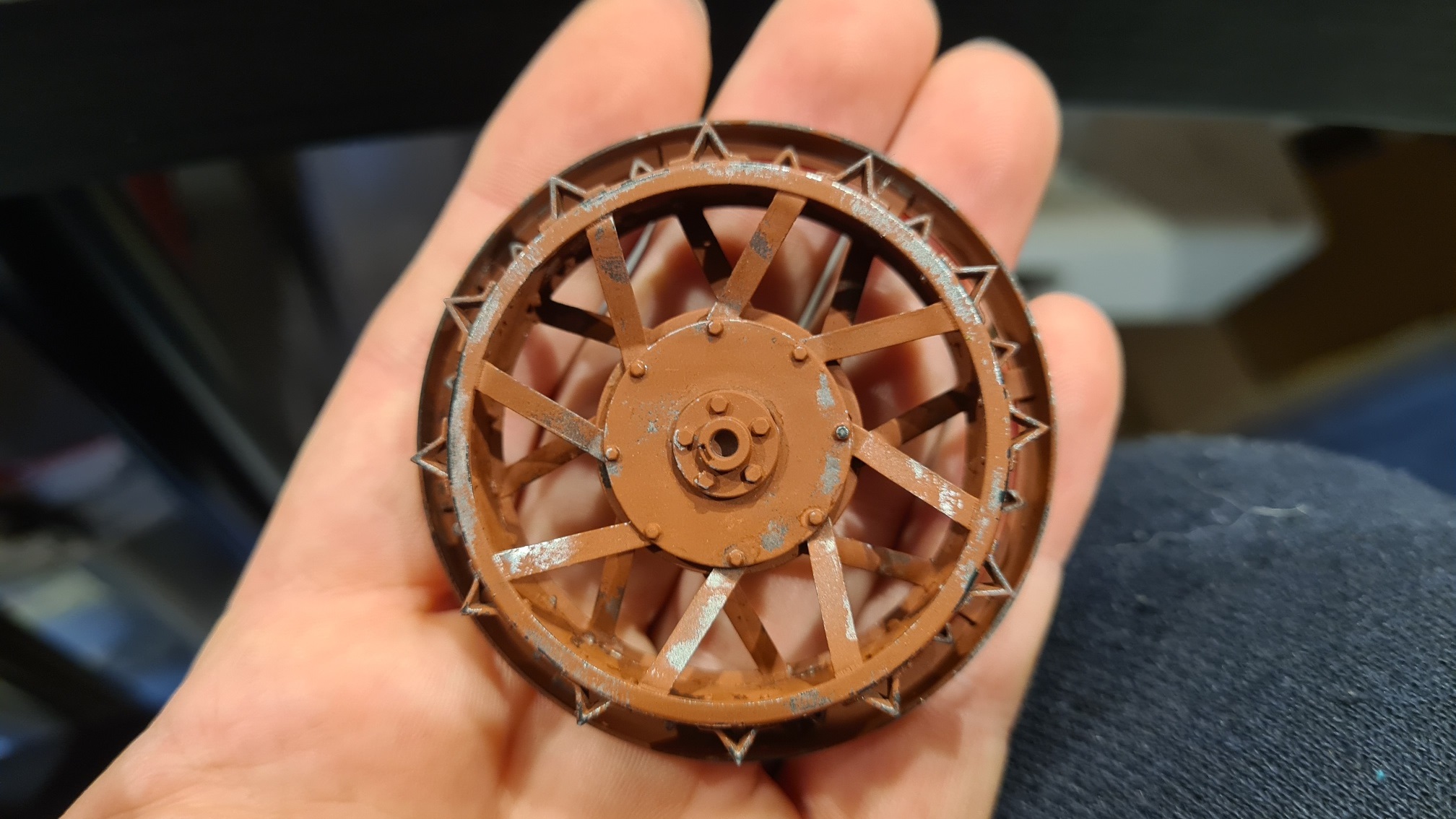 Auch hier das Gleiche. Zunächst mit Alclad Primer schwarz (ALC 309) grundiert. Dann kam Alclad 2 Edelstahl drauf. Für die großen Laufkränze habe ich mir aber noch etwas ausgedacht. Die Laufflächen werden in jedem Fall blank sein. Aber das wird niemals einförmig blank sein. Lunker usw. werden hier deutlich sichtbar sein. Also wurde Acrylfarbe aus der Tube genommen, schwarz und braun, mit dem Finger vermatscht und dann auf die Lauffläche in Laufrichtung verrieben:
