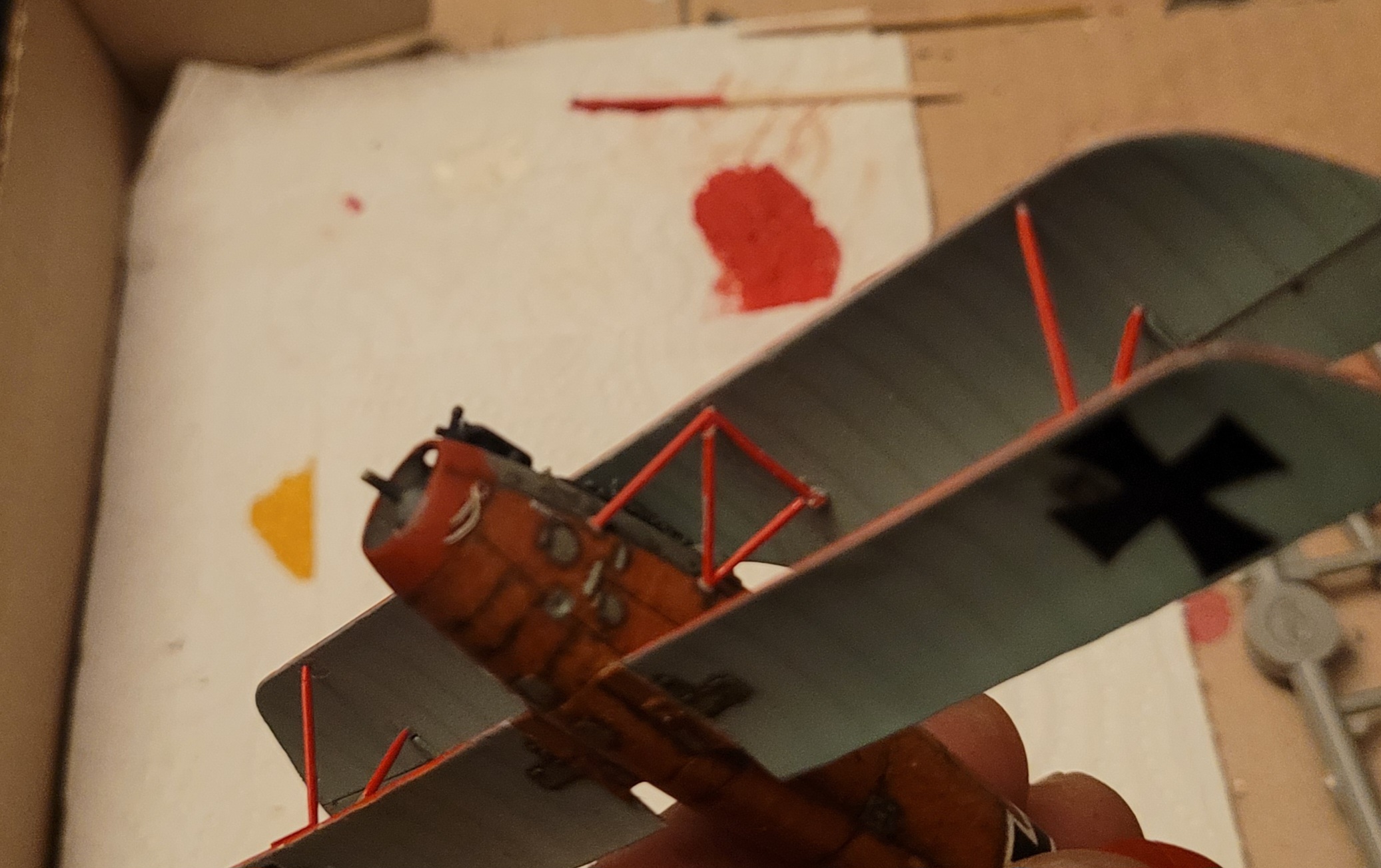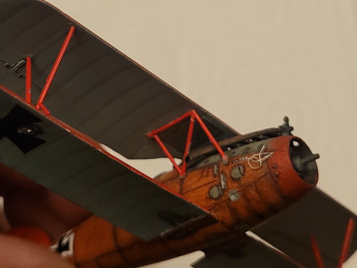 Zuerst die oberen Tragflächen nur auf den äußeren Verstrebungen anbringen. Hat schon mal gut geklappt, ohne dass alles auseinander fällt