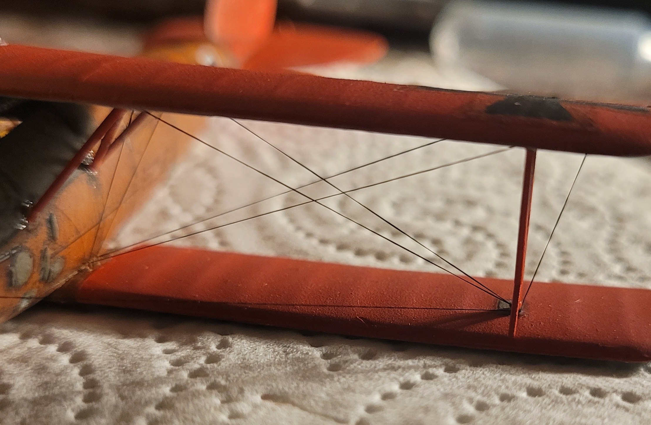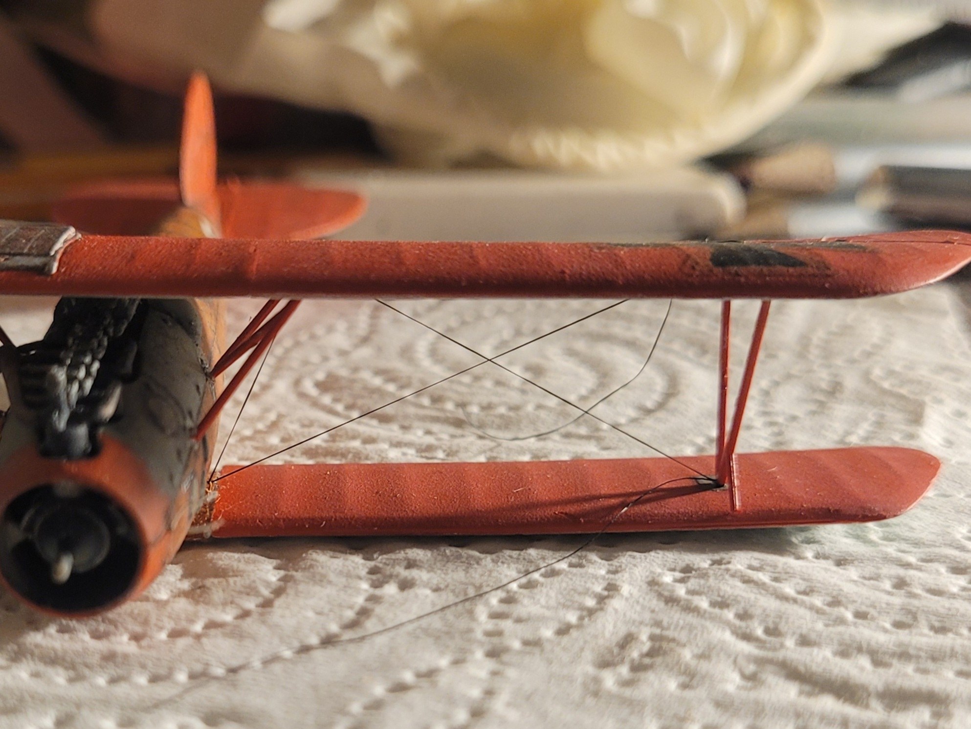 Das Rigging der Tragflächen wäre erledigt. Hat es auf der ersten Seite noch ewig gedauert, ging es mir auf der zweiten Seite schon deutlich einfacher von der Hand. Hierbei kamen auch die sechs relativ früh eingebauten, winzigen Drahtösen zum Einsatz.