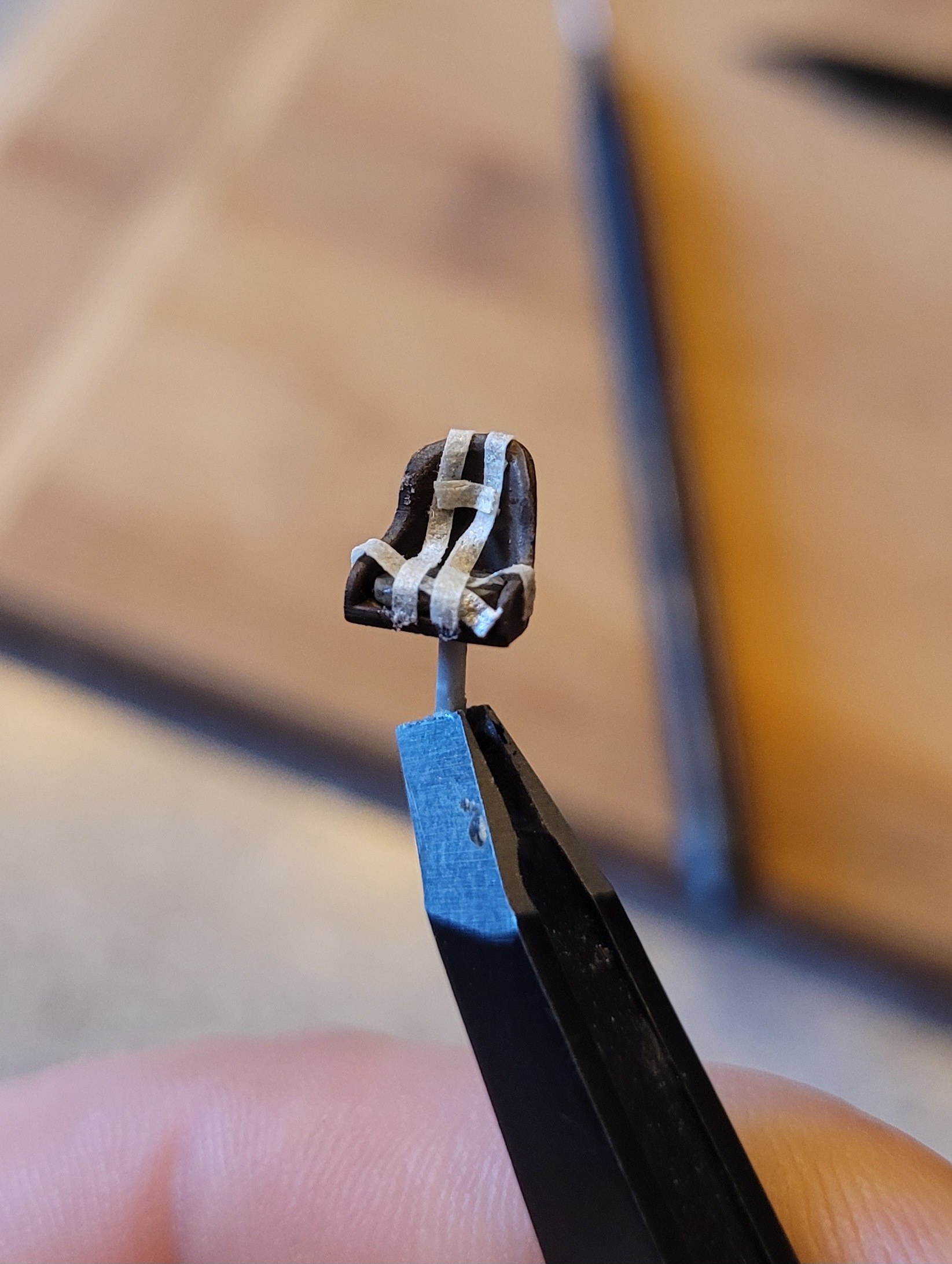 Zu guter Letzt konnte ich mich dem Sitz widmen. Der sah mir ein wenig langweilig aus, deswegen habe ich versucht, ihm ein Sitzkissen aus Resten und Gurte aus Malerkrepp zu scratch-basteln.