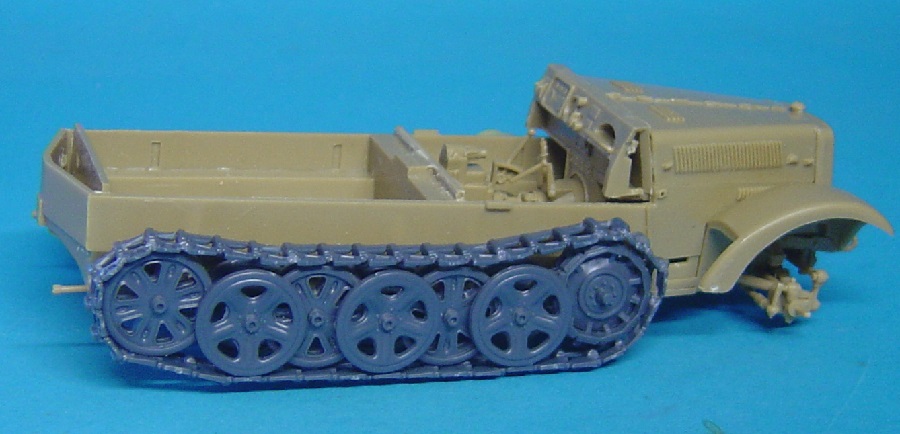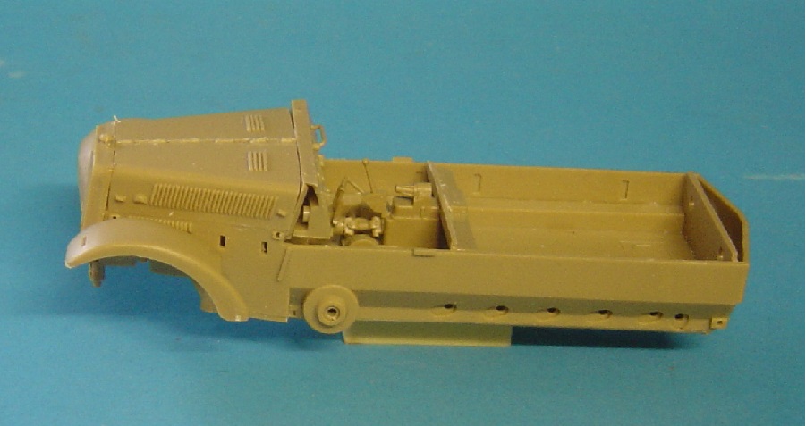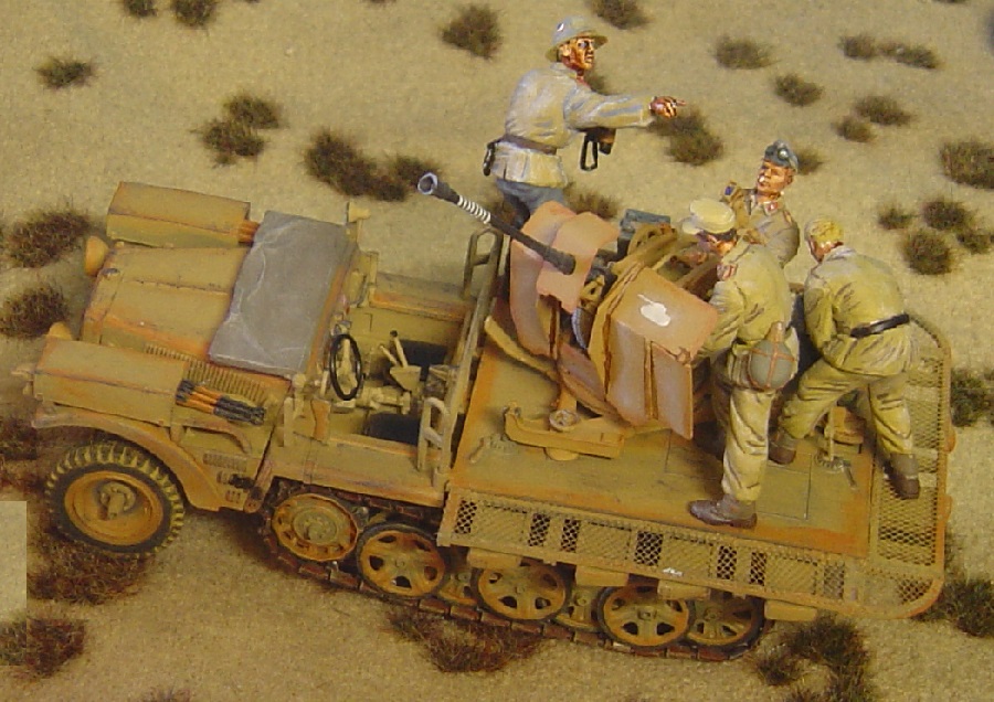 Original Abziehbilder zerbröselt , neue Bilder gesucht zerbröselt , hinten ordentlich wieder zusammen geschoben. Vorne mit dem Abschleppseil überdeckt. Die Kette habe ich verkehrt rum zusammengeklebt ( keine Ahnung wie das passiert ist ) und beim Aufziehen wieder auseinander gefallen. Durch den wenigen Platz ( Aufbau ), war das eine fürchterliche Friemelarbeit. Das Armaturenbrett bekam noch Abziehbilder, die von einem Revell Autobausatz über waren. Das Tachoglas aus dem Bausatz fand seinen Platz am Suchscheinwerfer ( rechte Seite ). In den Kästen auf den vorderen Kotflügeln gehören je drei K 98 und nicht wie im Bausatz zwei. Da es keine Halterung dafür gab, die drei K 98 mit 1 mm Abstand zusammen geklebt. Und dann bemalt und fast nicht mehr in die Kästen bekommen, der Blinker war im Weg. Aber alles fertig und passend zum Erscheinungstermin des Bausatzes auf einer Preiser Wüstenmatte aus dem Jahr 1975 fotografiert.