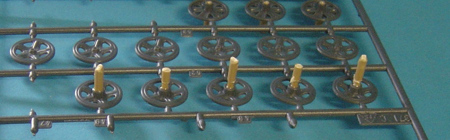 Nur leider passte die neu Kette nicht auf die alten Laufräder, weil die Führungszähne zu breit waren. Also werden auch die neuen Räder verbaut. Die Achsen sind 1.6 mm dick und die Löcher in den Rädern 2,1 mm, darum die Löcher in den Rädern mit Gießästen verschließen und neu aufbohren.