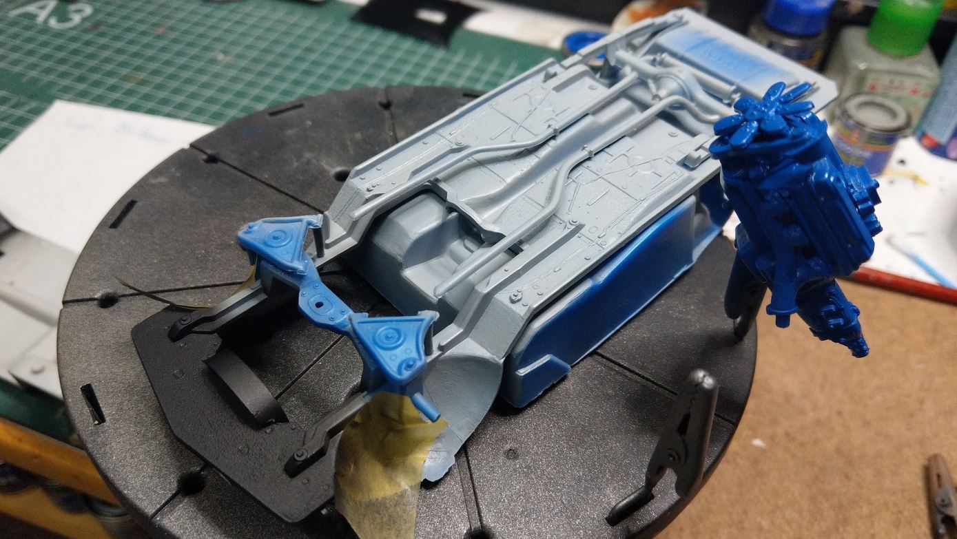 Die Basisfarbe am Chassis ist erledigt. Der nächste Schritt ist ein sanfter overspray, da die Firebirds seinerzeit unten herum nicht durch Unterbodenschutz oder ähnlichem gut geschützt waren. Danach natürlich die Detailbemalung der Anbauten.