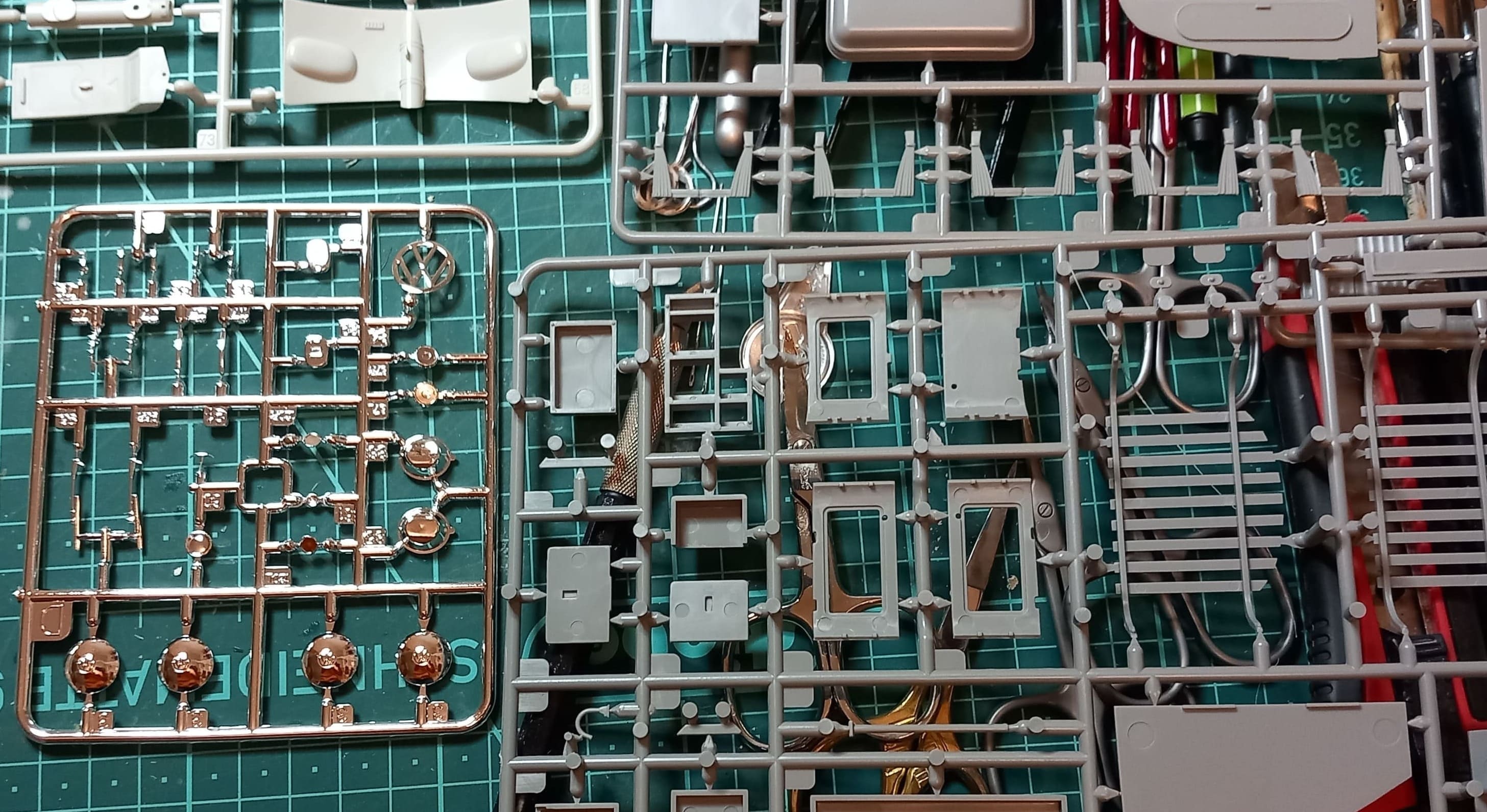Der Bausatz ist von Revell im Massstab 1:24 und hat 189 Teile. Einige dieser Teile, die auf jeder Menge Platten verteilt sind, werden vermutlich zu anderen T1 Modellen passen, wie dem Samba-Bus. Auf jeden Fall eine ganze Menge Spritzlinge, auch viele Klarsichtteile und 4 GUMMIREIFEN.