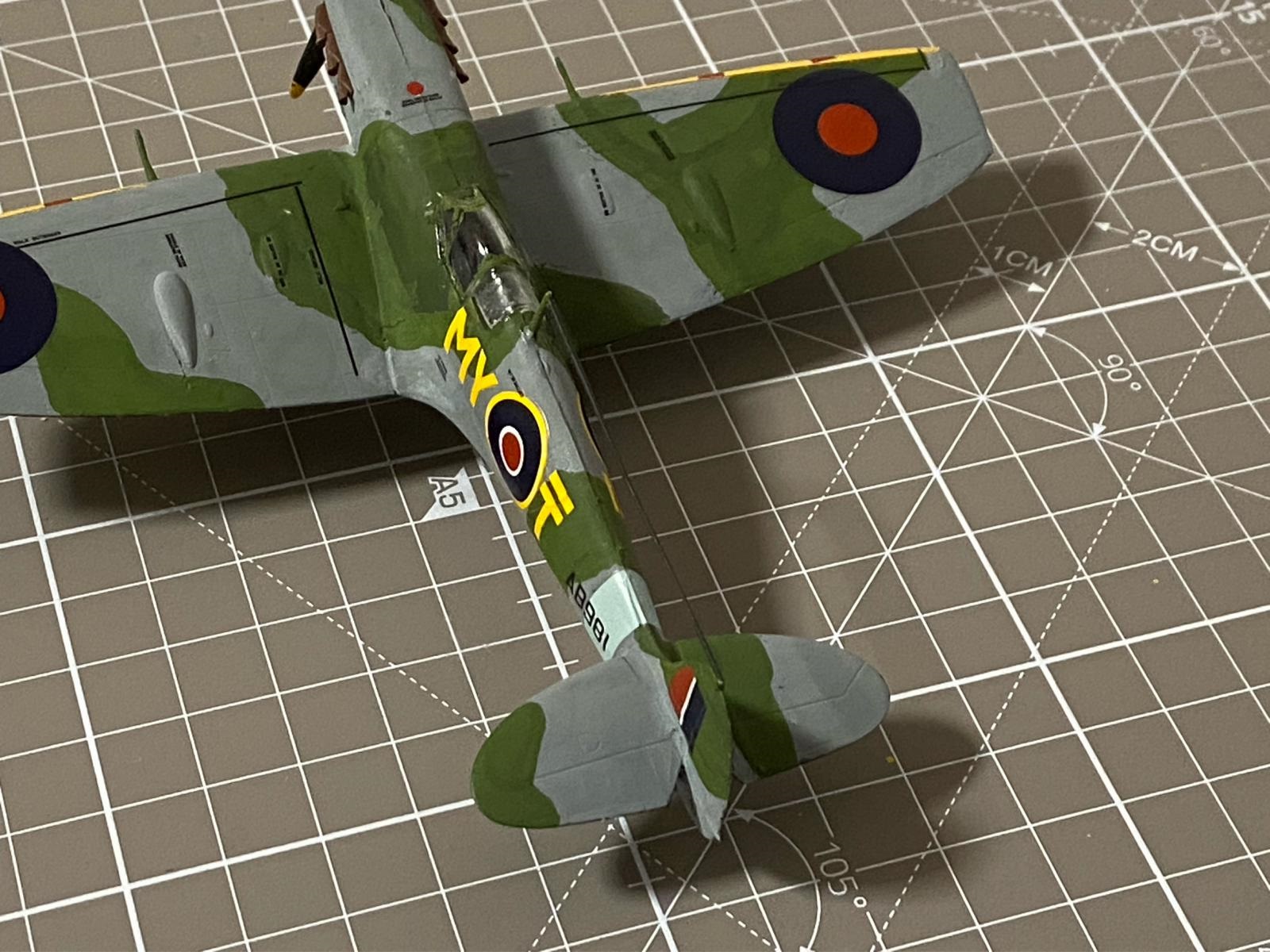 Unten war es gut, oberer hinterer Teil hatte ich es zu gut gemeint, zuviel Grundierung drauf Details verschwunden. Ganz klar mein Fehler. Tarnungsbemalung wie bei Spitfire mit Color Stop.