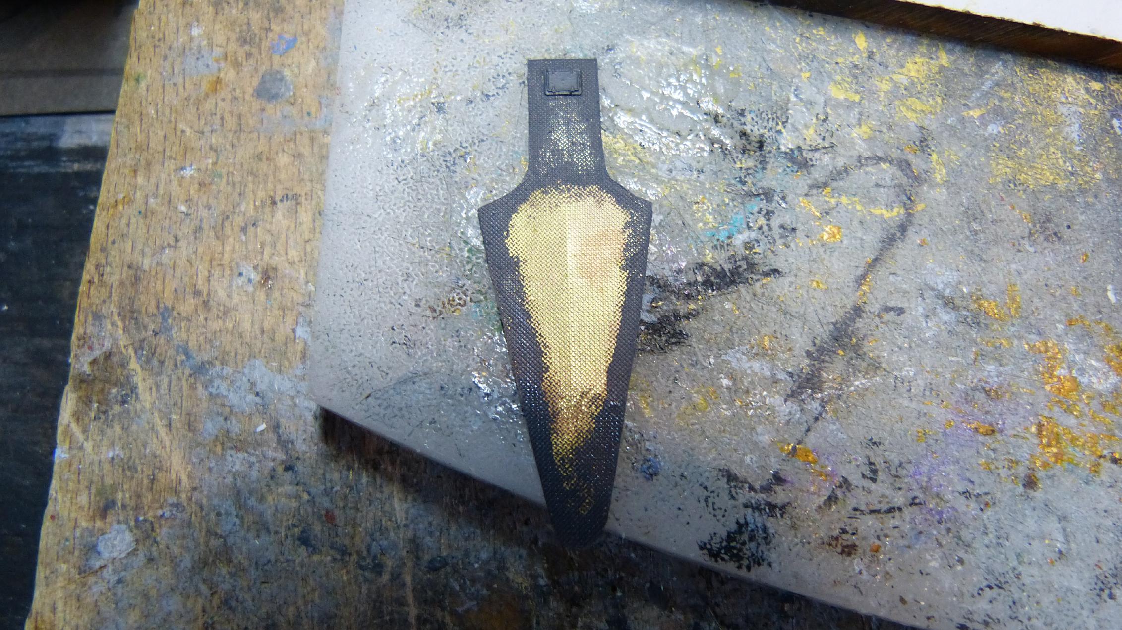 Dann zurechtschneiden, die Kanten ggfs. mit roter Farbe nachbessern und komplett mit Klarlack matt pinseln.