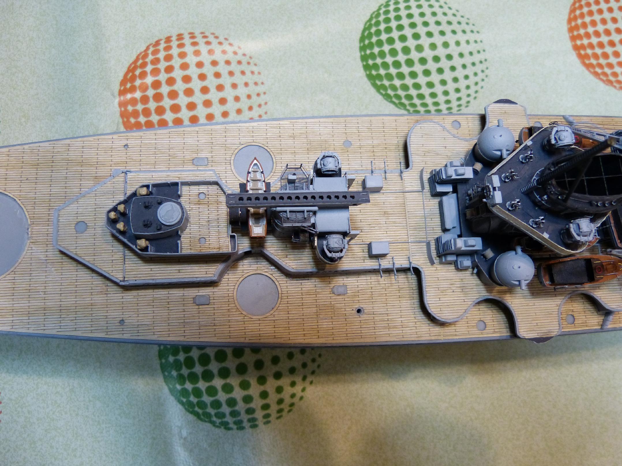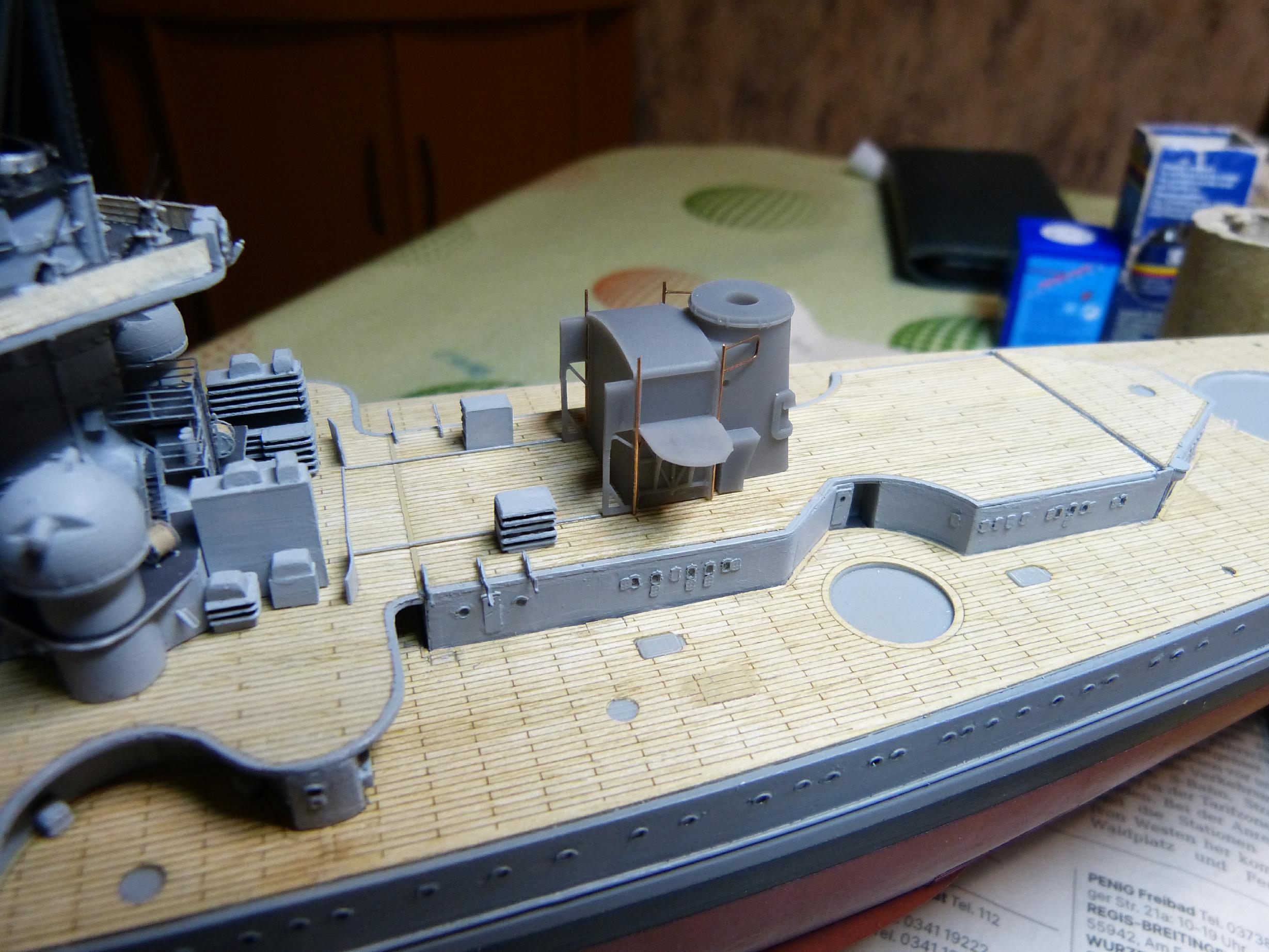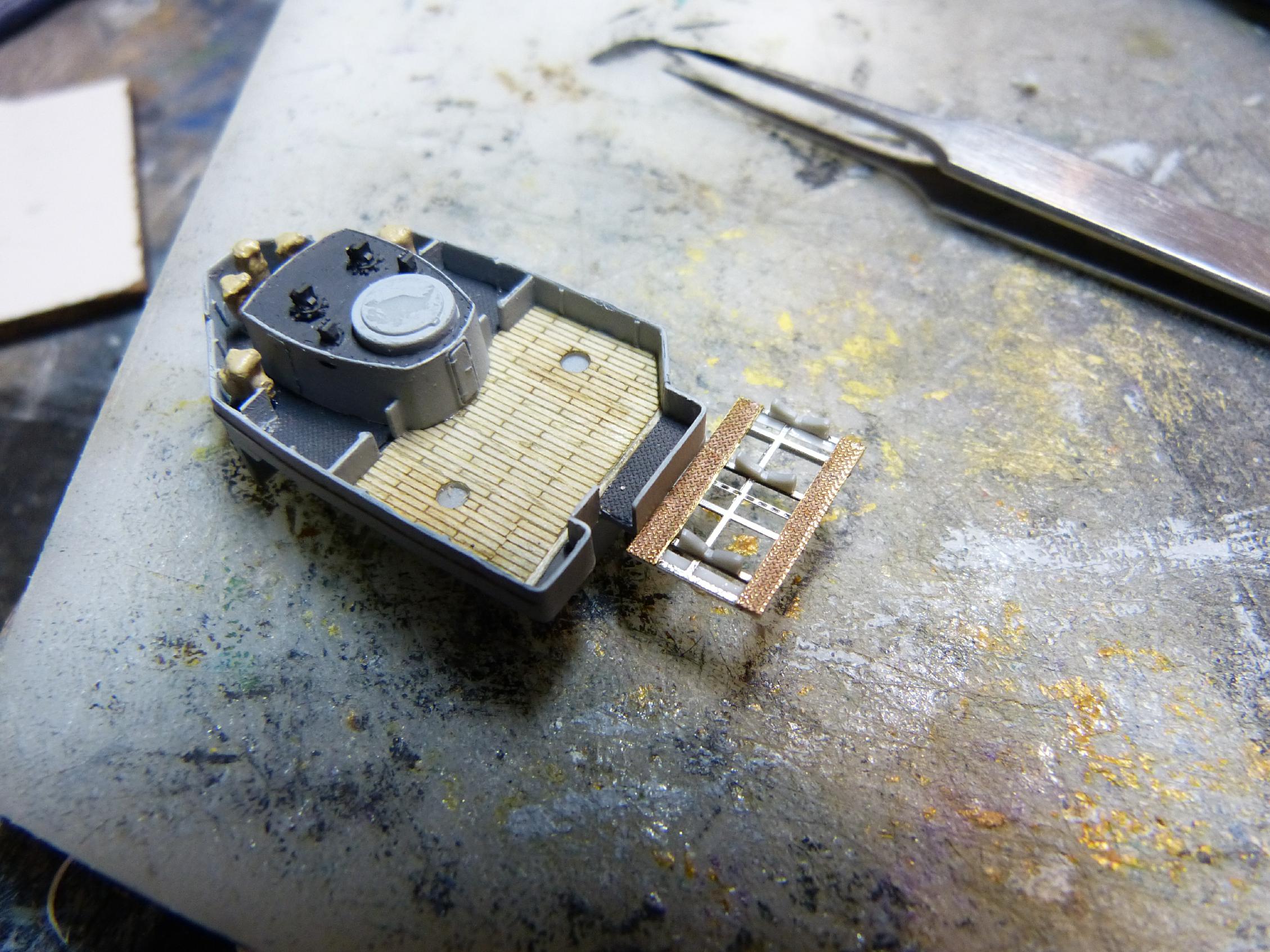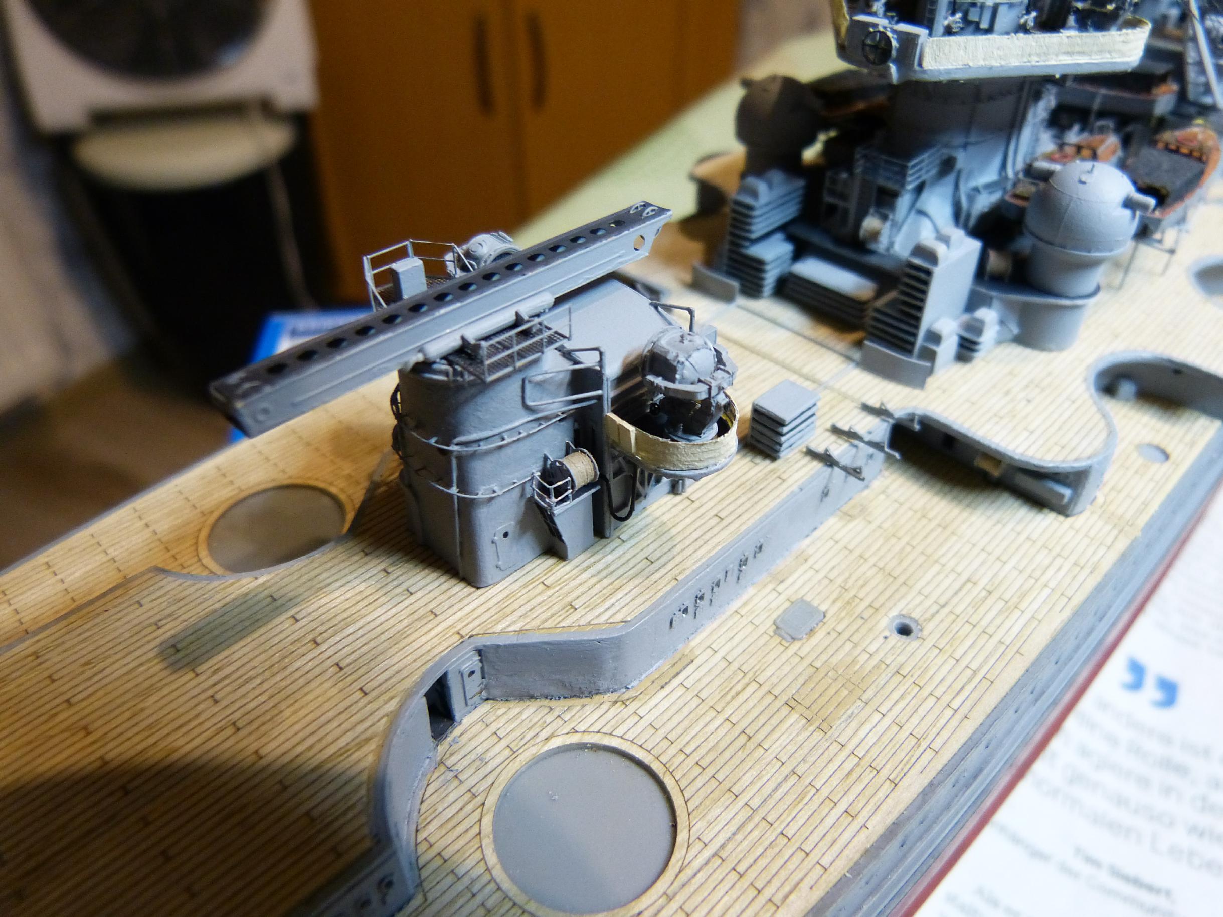 Von der Anpassung des oberen Teils habe ich leider keine Fotos gemacht. Nur so viel, den hinteren Teil habe ich wie bei SH mit Riffelblech ausgeführt (laut Dragon Holzdeck). Riffelblech ist für den Bereich der Beobachtungsgeräte am logischsten und im (gut recherchierten) Draminski-Scharnhorst-Buch auch so gegeben.