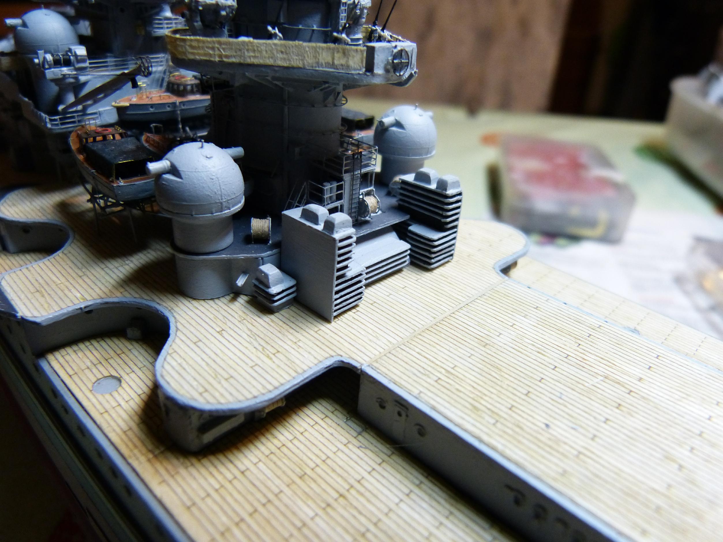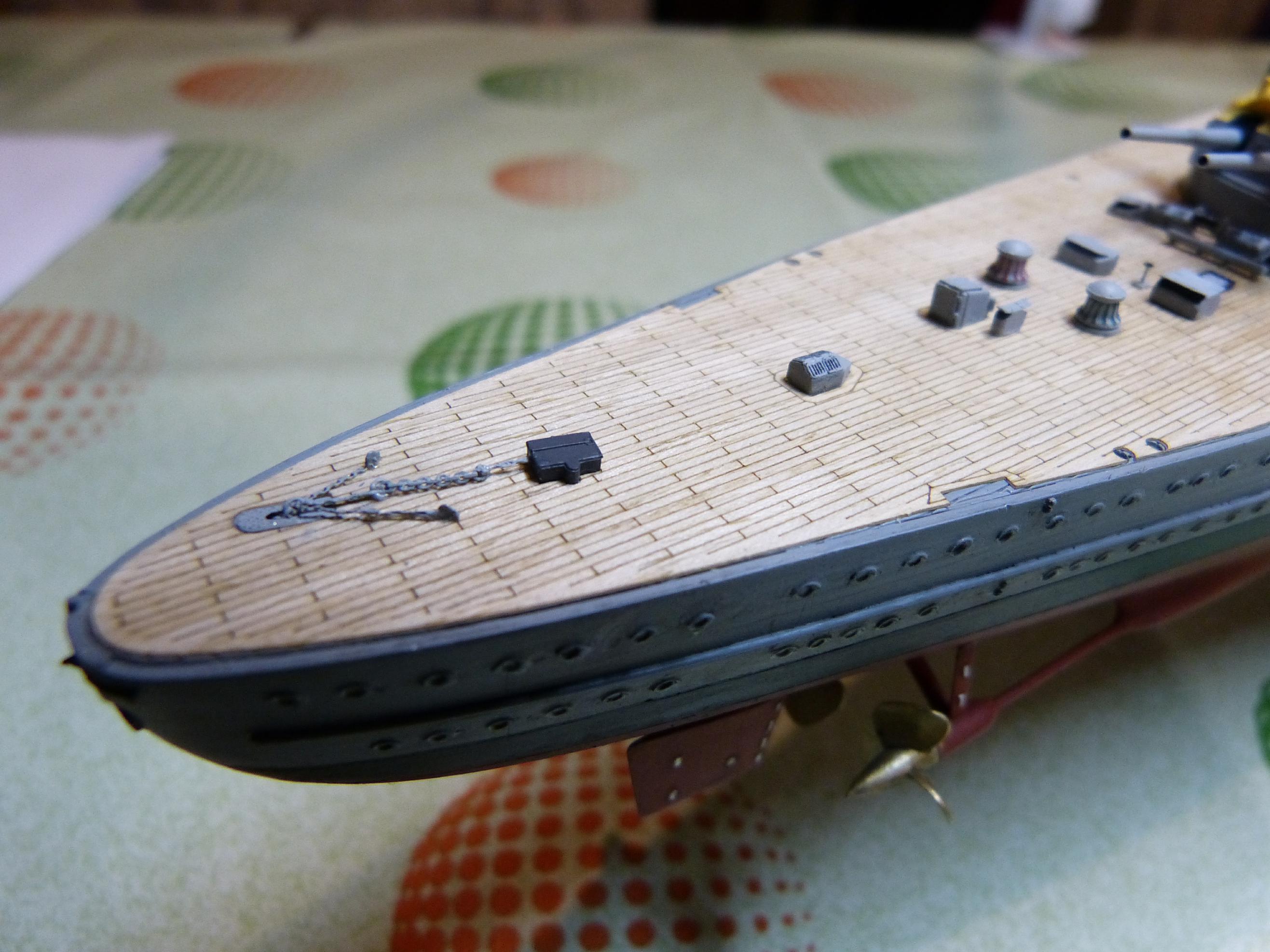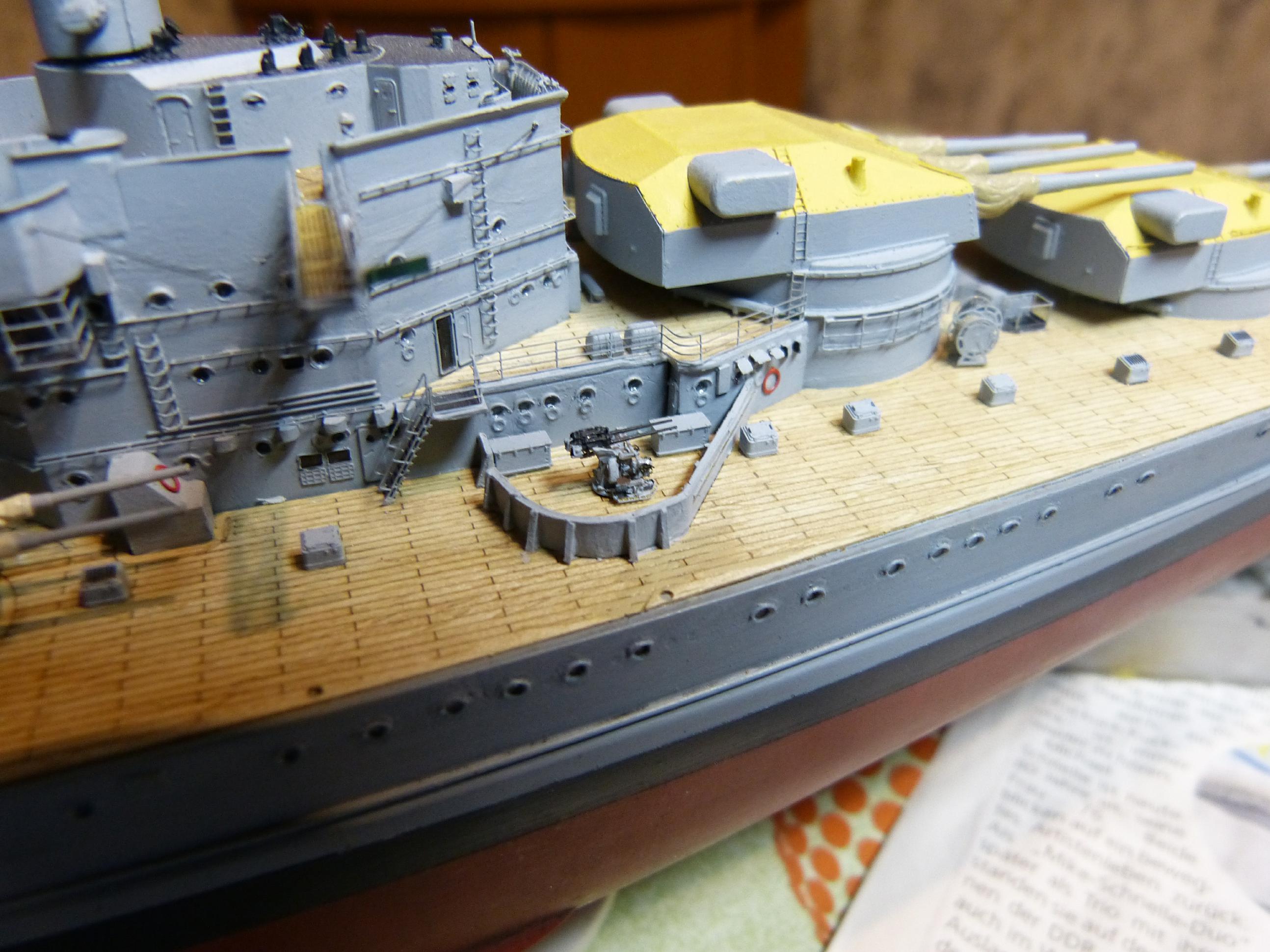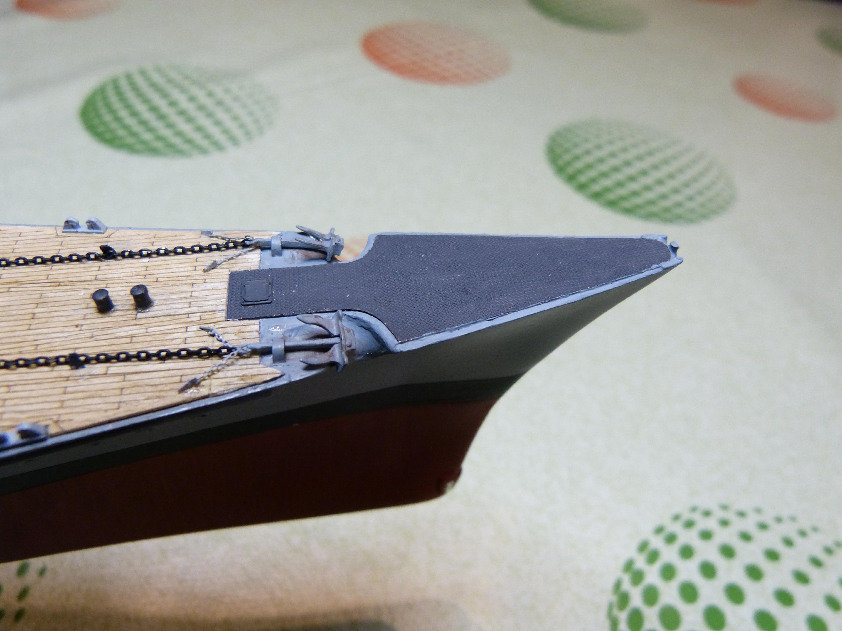 Von der Anpassung des oberen Teils habe ich leider keine Fotos gemacht. Nur so viel, den hinteren Teil habe ich wie bei SH mit Riffelblech ausgeführt (laut Dragon Holzdeck). Riffelblech ist für den Bereich der Beobachtungsgeräte am logischsten und im (gut recherchierten) Draminski-Scharnhorst-Buch auch so gegeben.