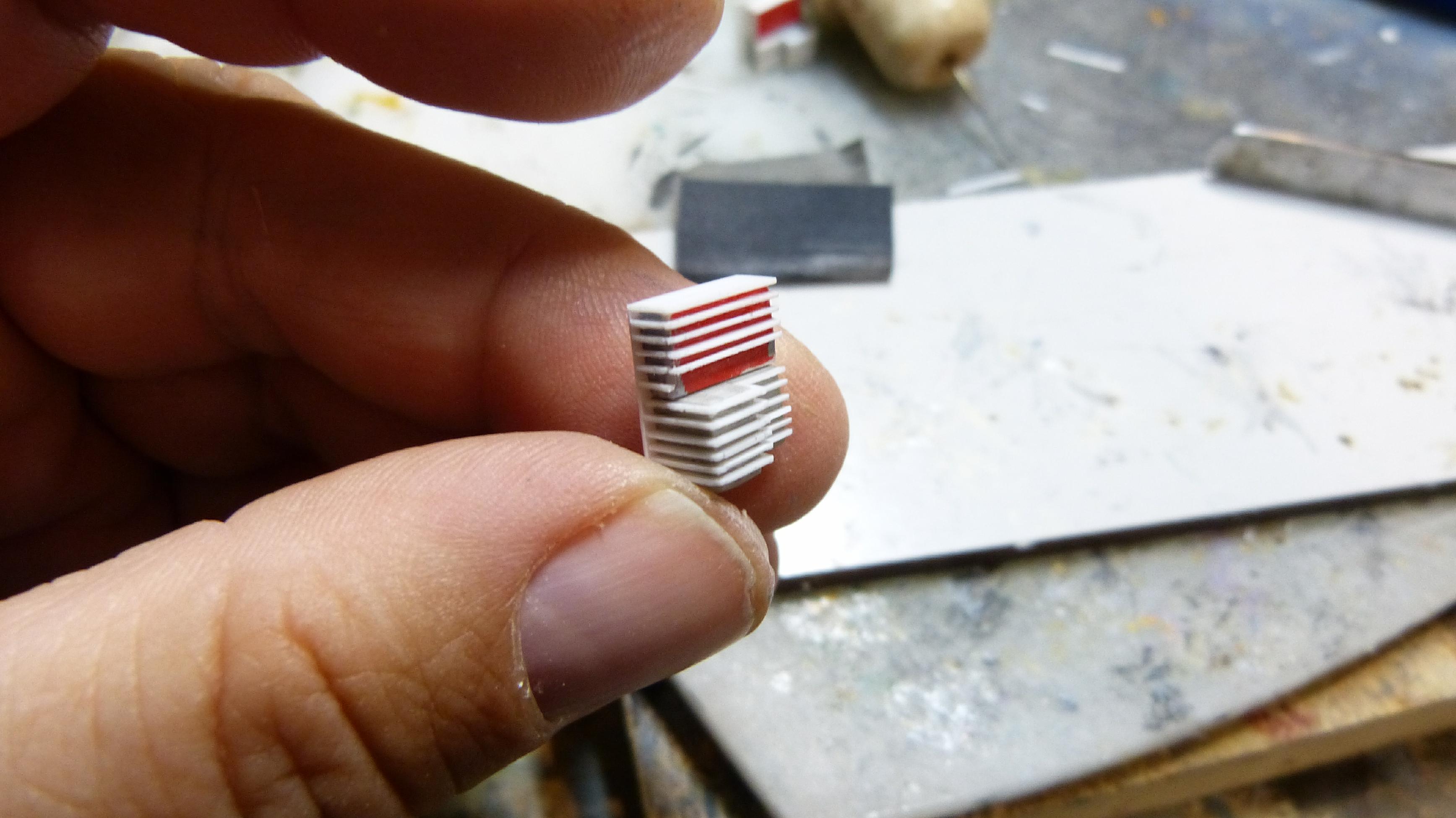 Zunächst hatte ich eine Lüftervariante mit übereinandergeklebten Plastiksheets gebaut, die mir dann aber auch nicht so recht zusagte, zumal sie zu schmal geraten war (Foto 10 links im Bild). Die neue Variante war aus einer massiven Basis und Streifen ringsherum geklebt.