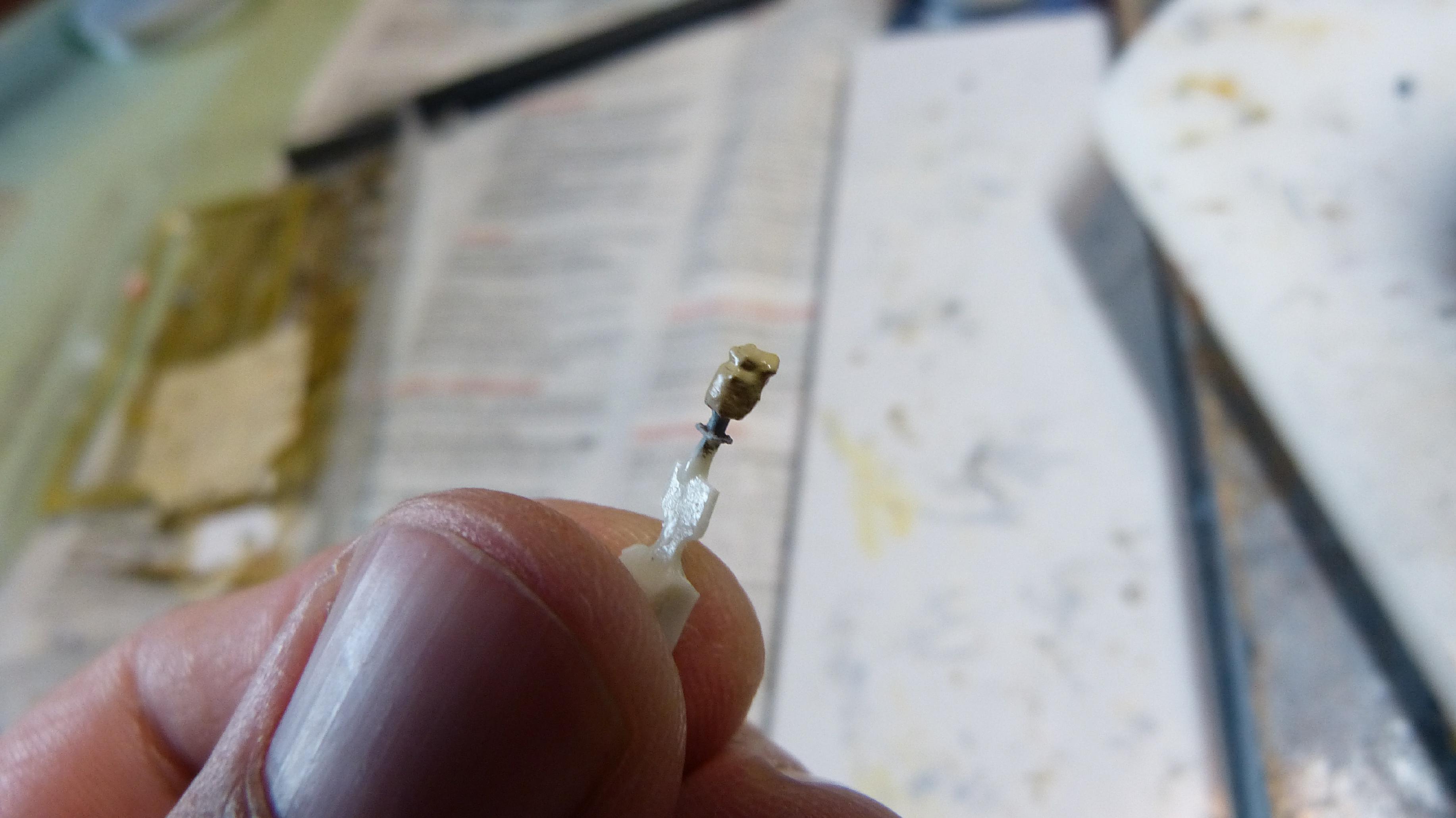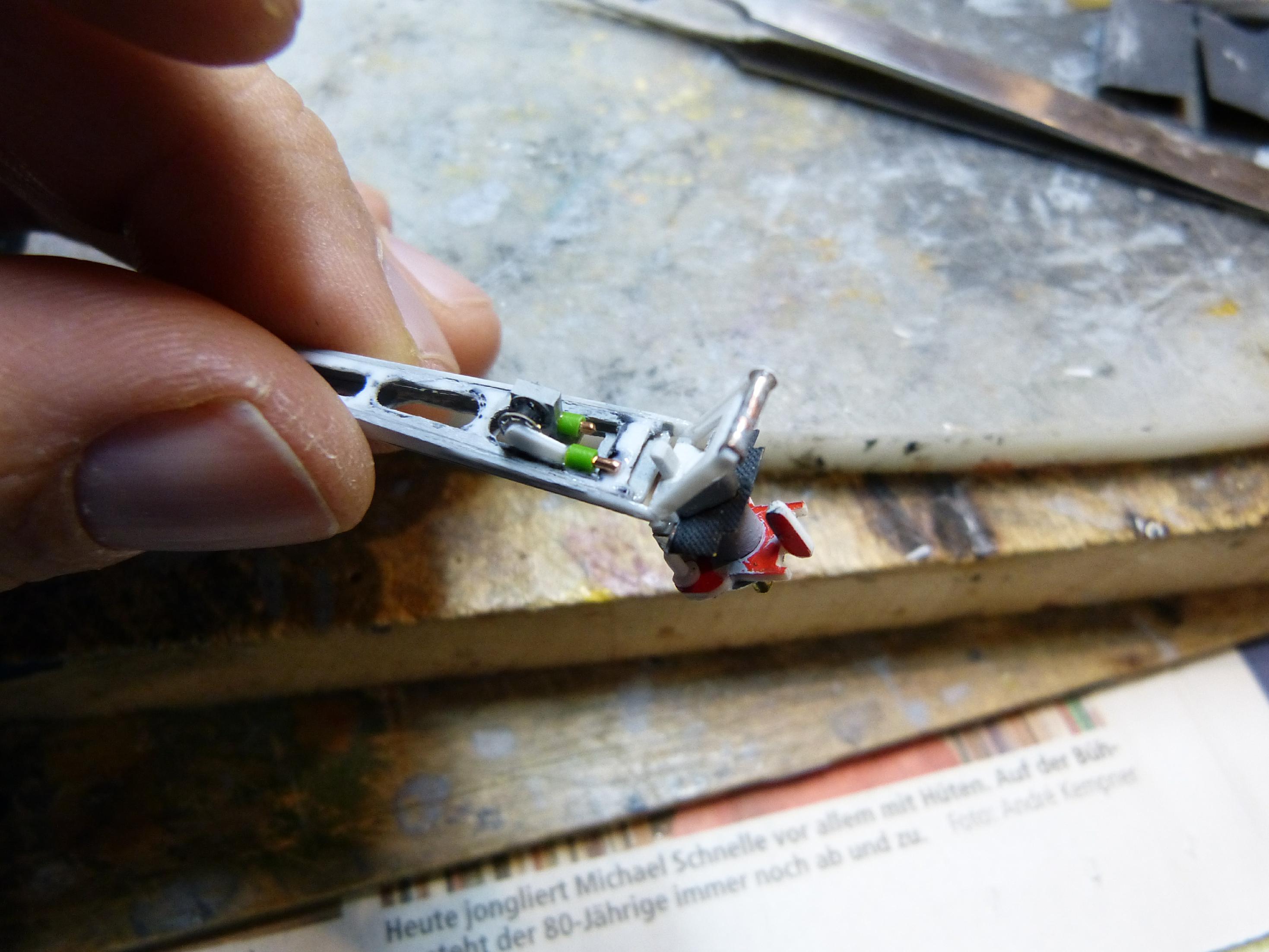 Zuletzt zurechtbiegen und anbringen. Den weißen Faden mit Revell 89 (beige) anmalen.