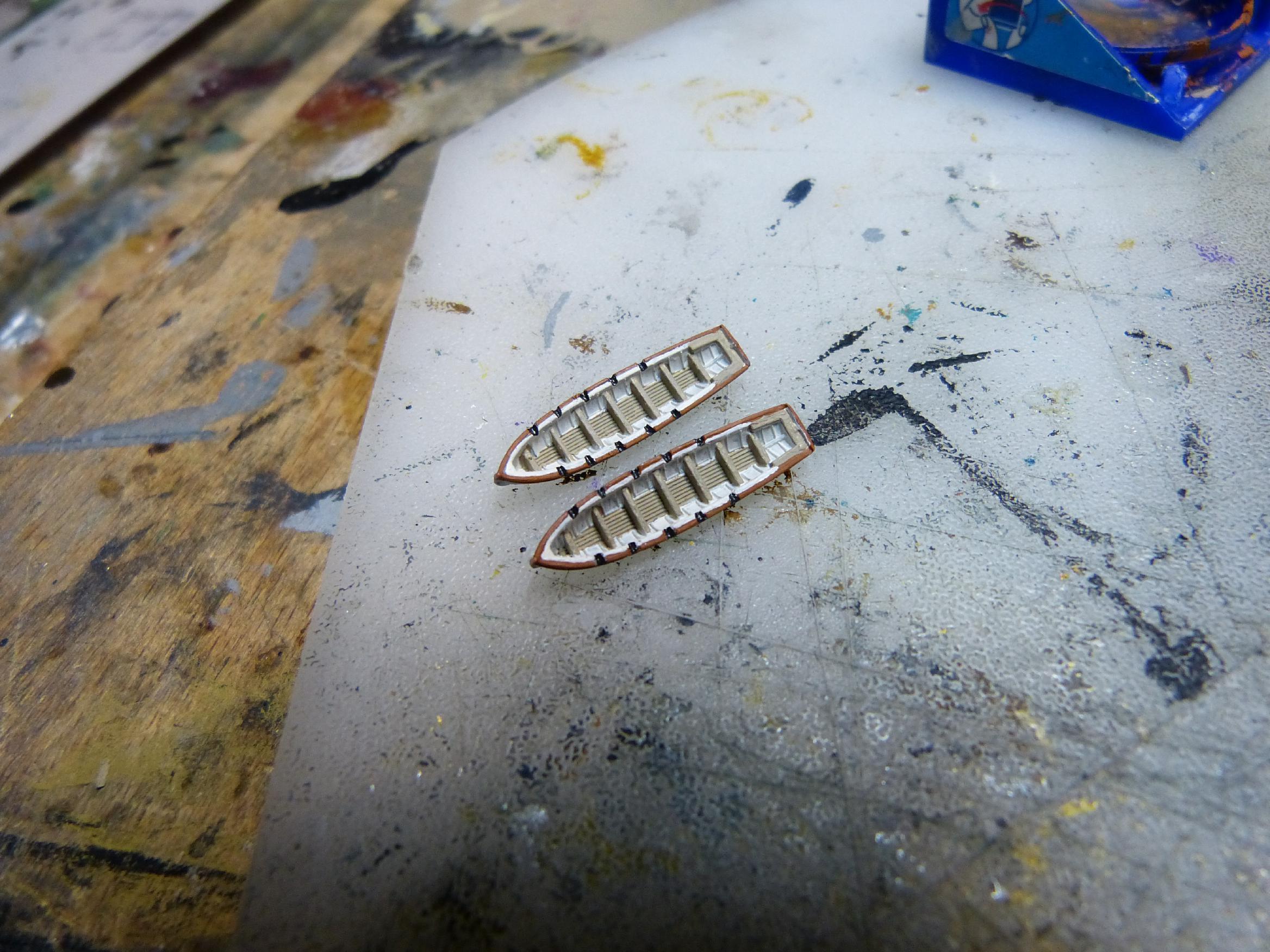 Die Kutter selbst stammen aus dem Dragon-Bausatz. Die aus dem Very Fire-Bausatz gefielen mir nicht so richtig. Das untere erhielt noch entsprechende Auflieger aus Ätzi-Resten. Hier fehlen nun noch Ruder, Zurrgurte und Rettungsring.
