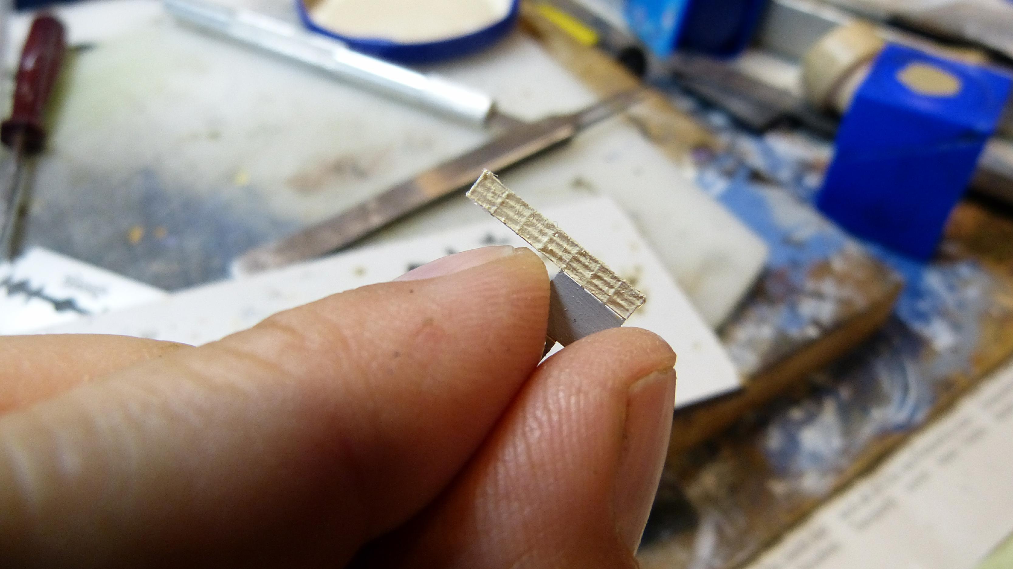 Auf demselben Originalfoto sah ich auch, dass der Decksbereich am Bug nicht glatt, sondern als Riffelblech ausgeführt war (was eigentlich auch logisch ist wegen Rutschgefahr). Also nochmal Hauler-Riffelblech-Sheet besorgt und die Sektion wieder geändert.
