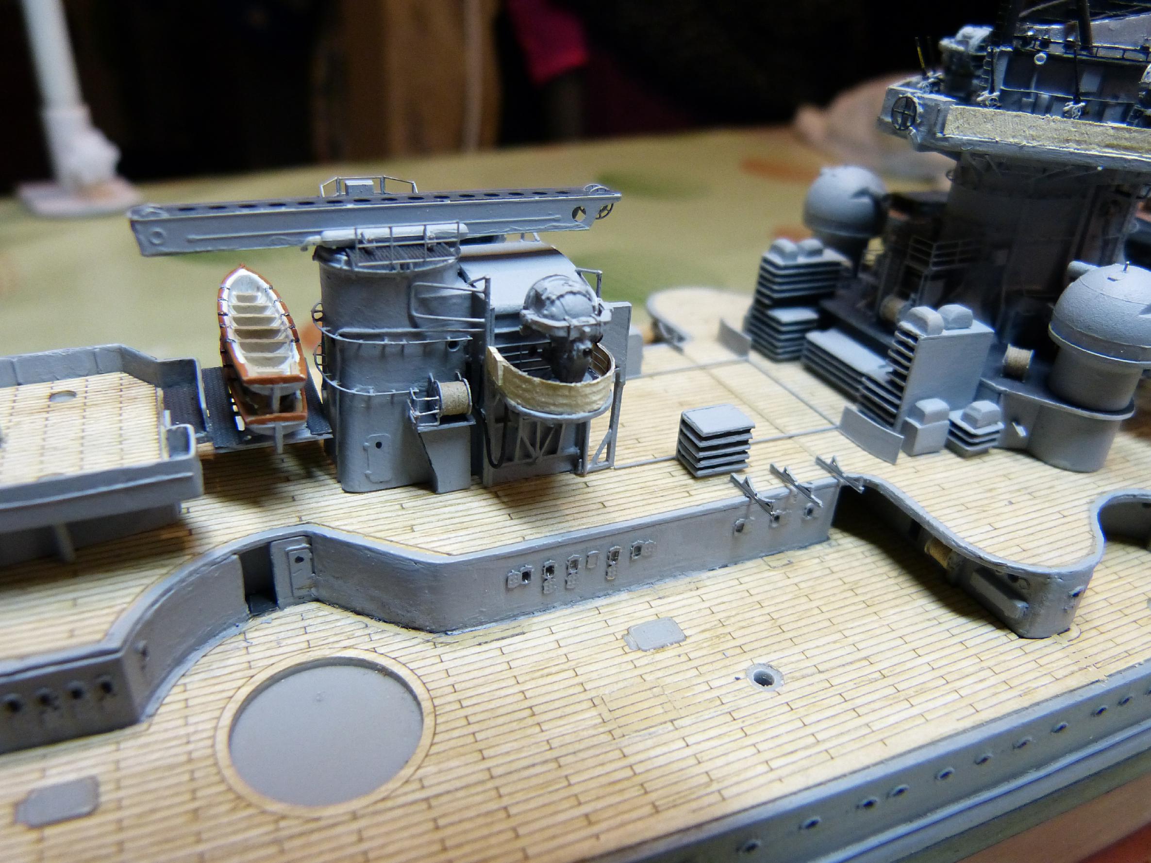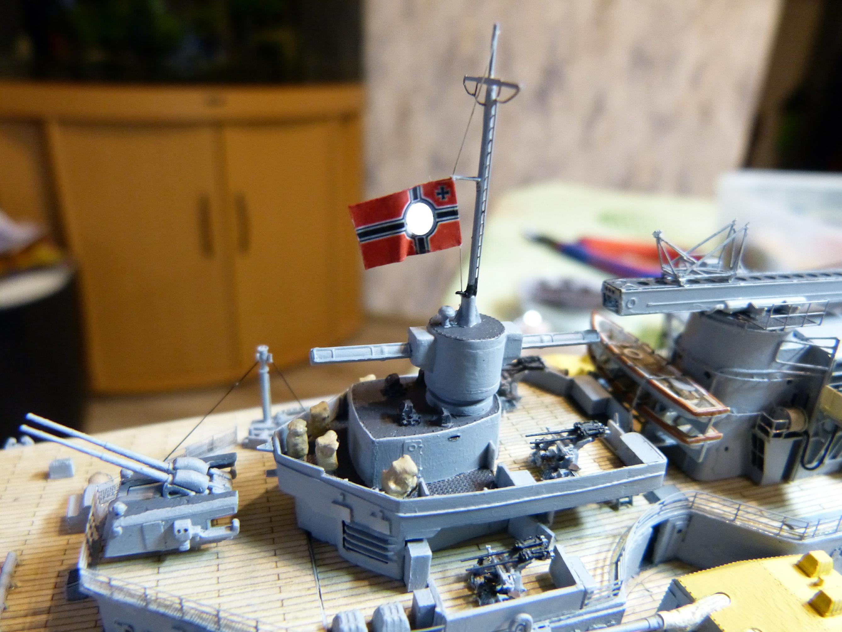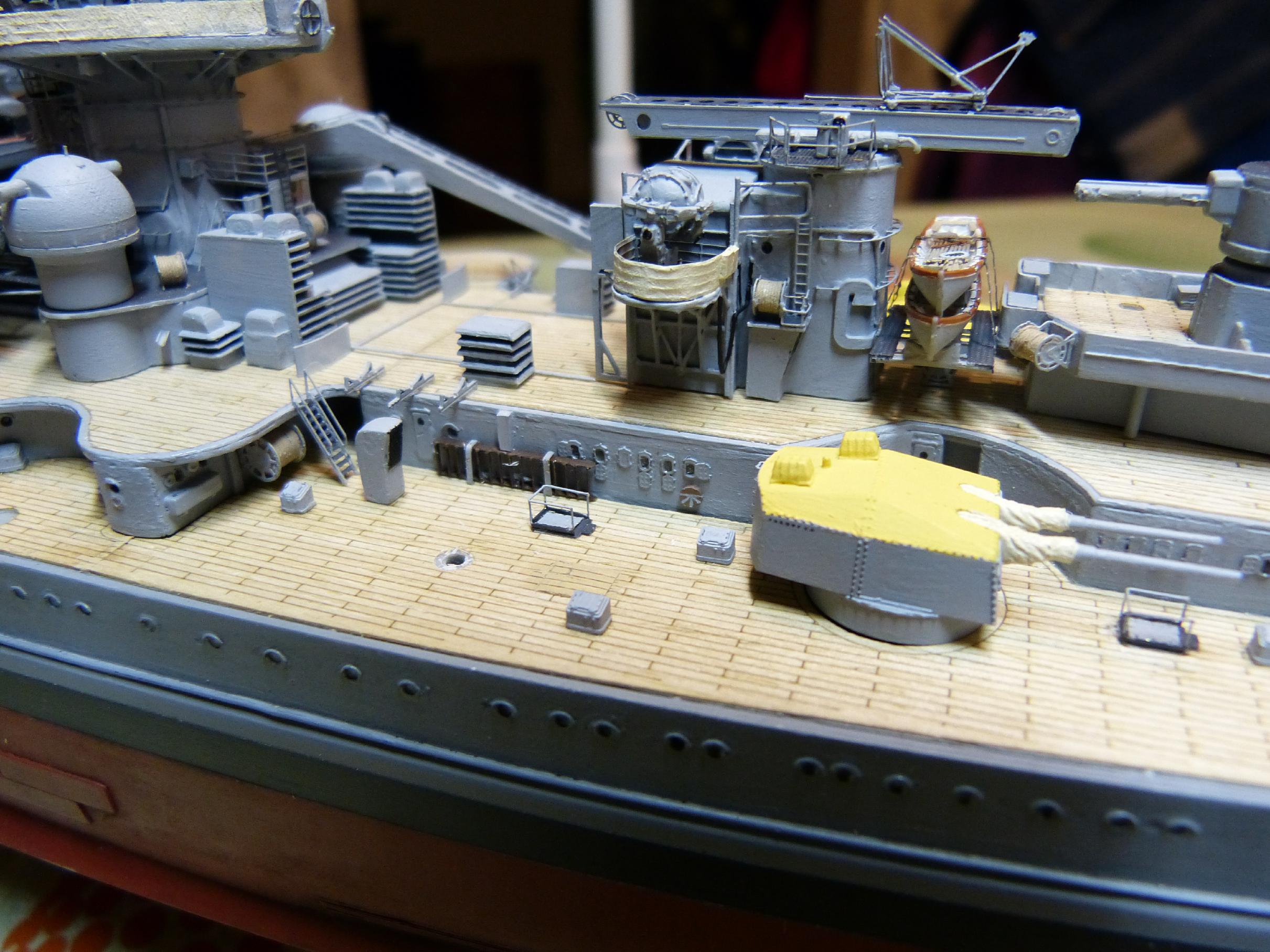 Auch am achteren Leitstand wurde einiges erweitert – E-Messer mit Kleinmast. Weiterhin wurden die Kutter komplettiert (Zurrgurte, Ruder, Rettungsring). Hier auch der hintere 15 cm – Zwillingsturm zu sehen.