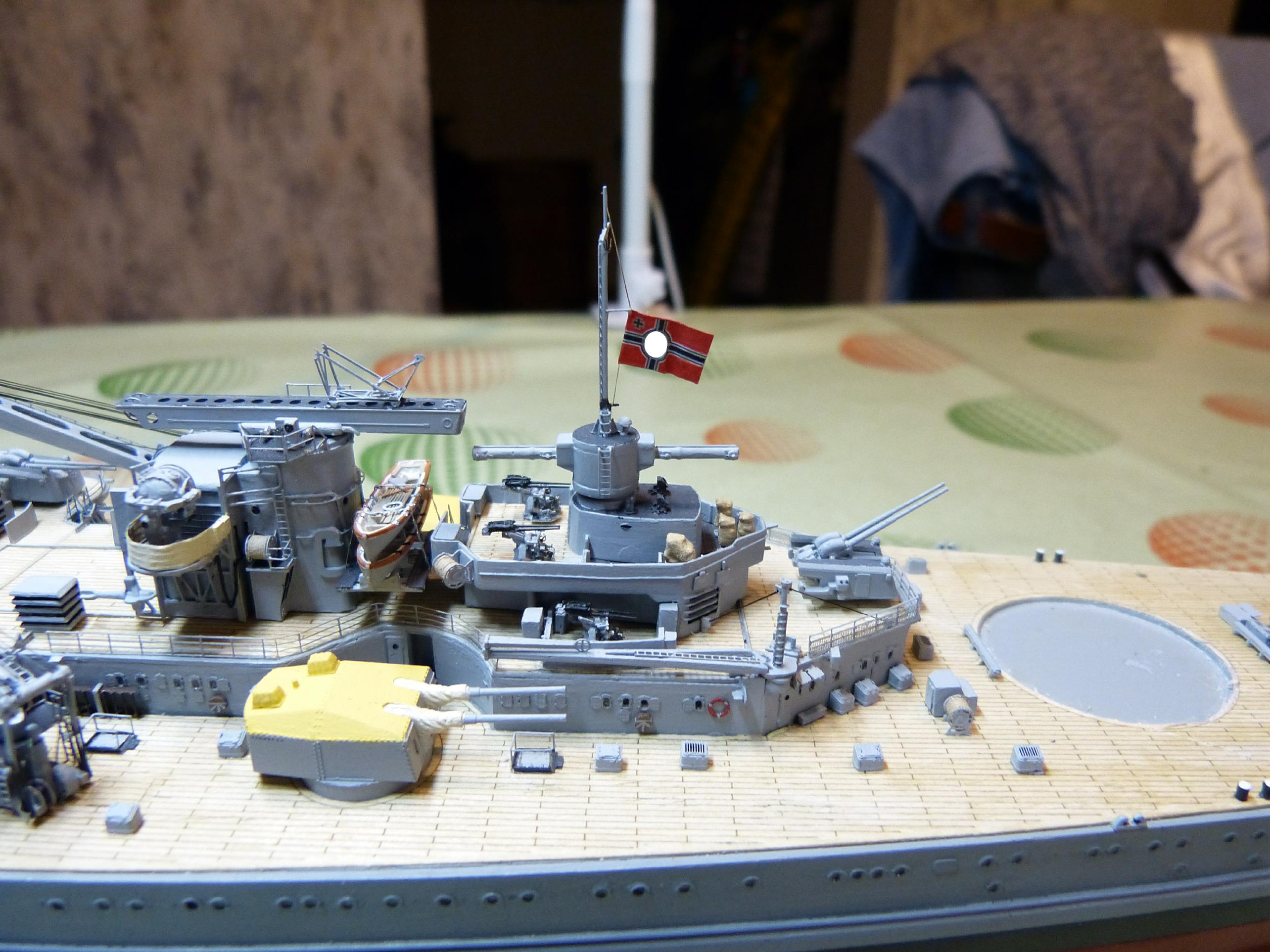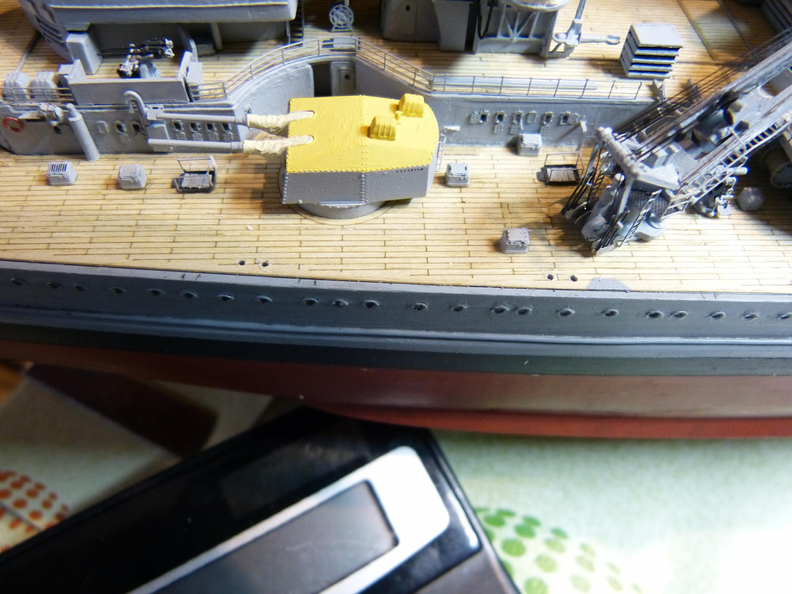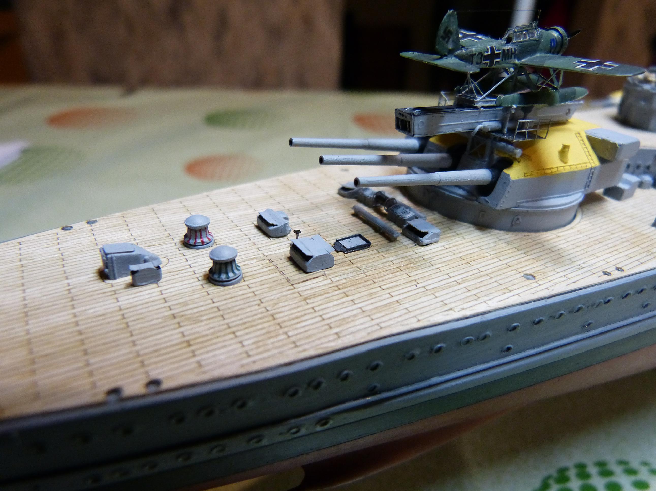 Auch am achteren Leitstand wurde einiges erweitert – E-Messer mit Kleinmast. Weiterhin wurden die Kutter komplettiert (Zurrgurte, Ruder, Rettungsring). Hier auch der hintere 15 cm – Zwillingsturm zu sehen.