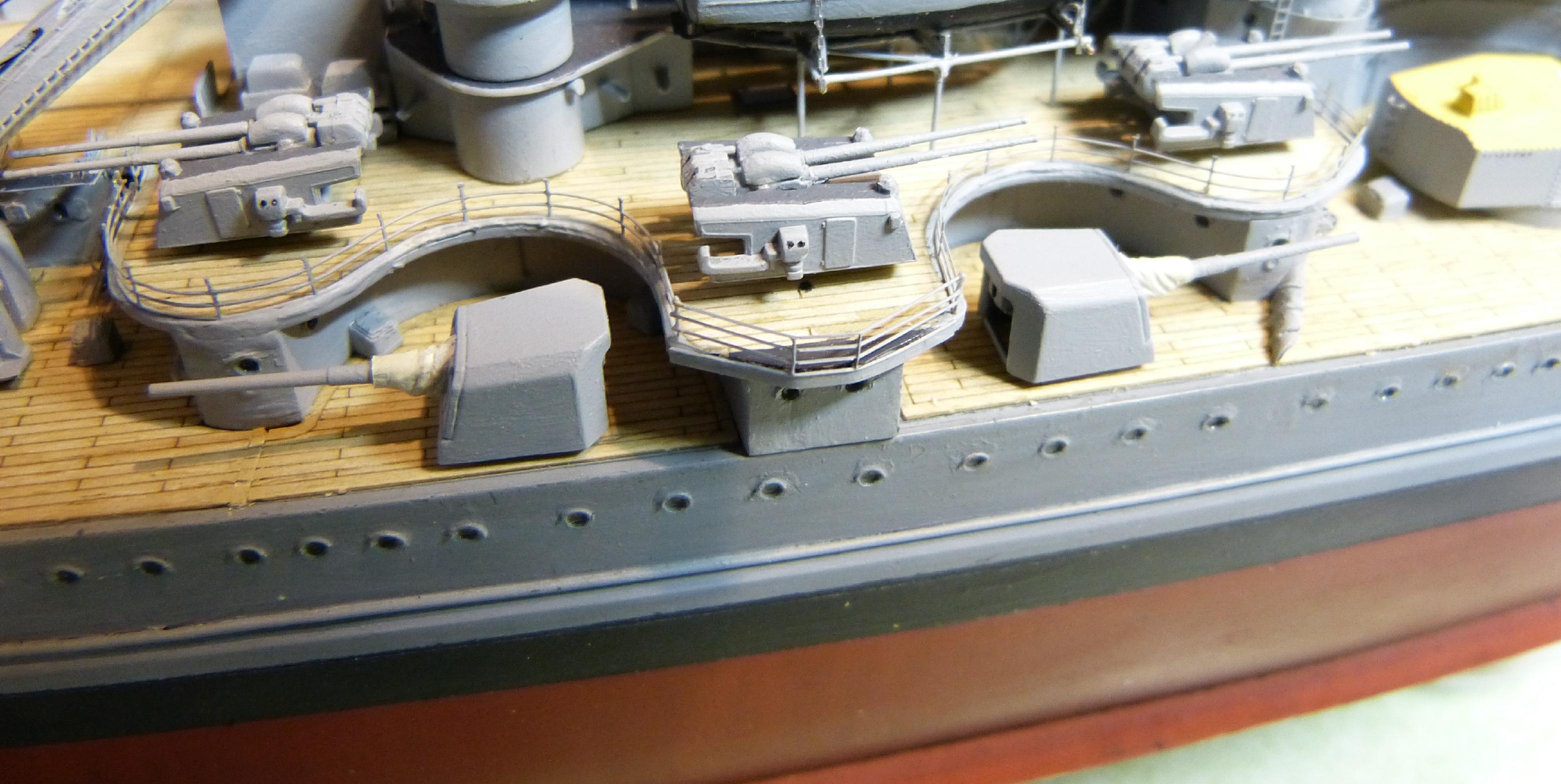Inzwischen hatte ich auch die 7 Stück 10,5 cm-sFlaks gebaut, und zwar ohne weiteren Schnickschnack, nur mit Master-Messingrohren. Des Weiteren ist die Reling um die Zehnfünfer aus Artwox AW60014 improvisiert worden.