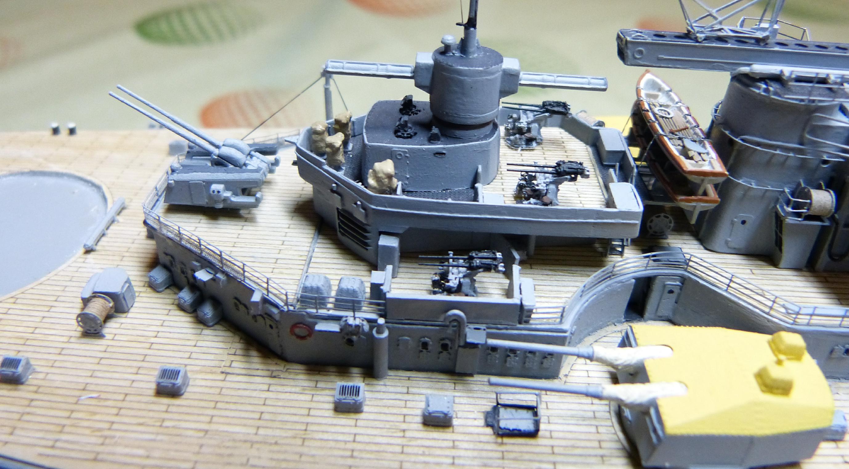 Zwischen den großen Lüftern hinter dem Schornstein und der Schleuderbase gibt es noch zwei kleinere Lüfter (Scratch), zwei rudimentäre Verschanzungen (laut Plänen vorhanden und Originalfoto erahnbar) und die Bootsauflieger für zwei Motorjollen, welche jedoch 1940 nicht mehr an Bord waren. Aus meiner Phantasie heraus habe ich noch Strukturreste des vormaligen ersten Hangars mit dargestellt (historisch nicht belegt). Der Gitterpodest mit der Zwozentimeter-Vierling kam übrigens erst Anfang 1941 zum Einsatz.