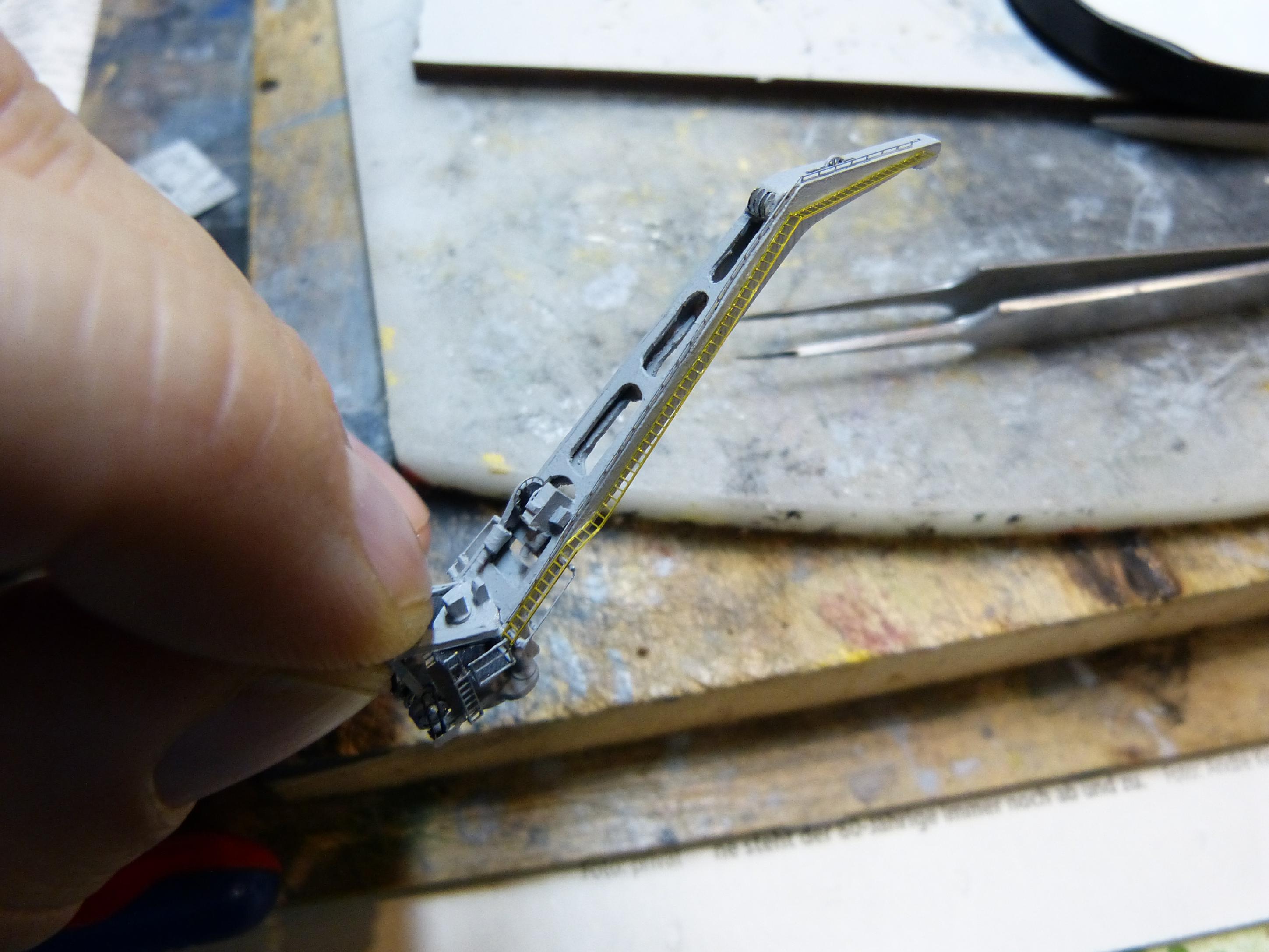 Zwischen dem Leitstand und der Schleuderbasis befand sich „freischwebend“ (ohne sichtbare Stützen) ein Gestell für zwei Bereitschaftskutter übereinandergestapelt. Dieses wurde grob nach Originalplan mittels Ätzi-Resten und Riffelblech erstellt.