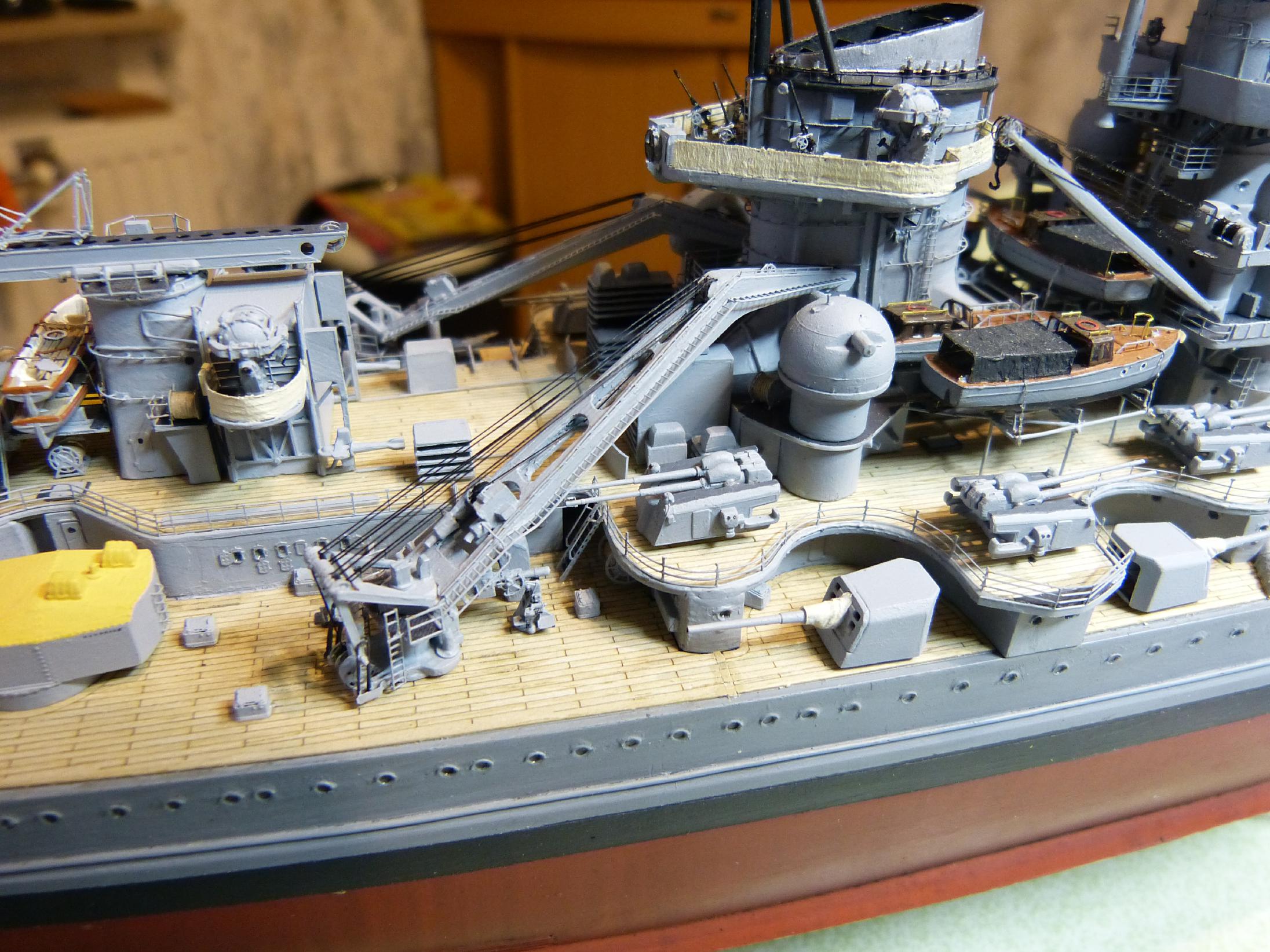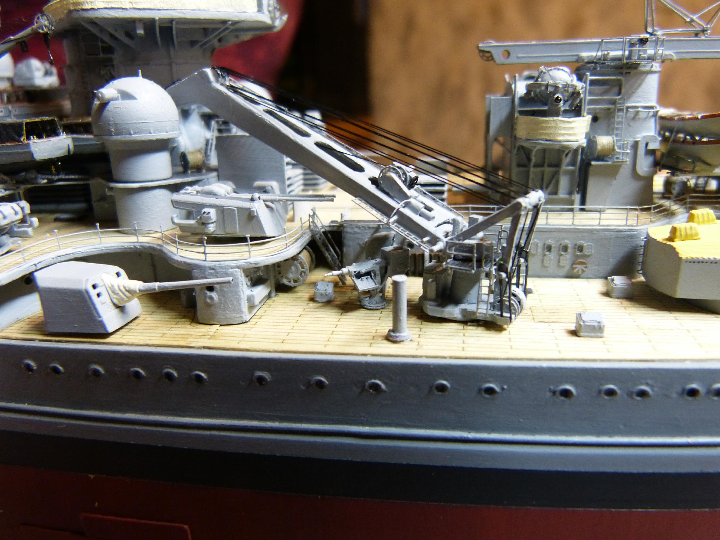 Für den Flugzeug-Umsetzkran gibt es leider nicht viele Vorlagen oder Fotos. Originalfotos GU – Fehlanzeige. Kagero – Nix, weil Ausrüstungsstand 1941. Originalpläne – ansatzweise dargestellt. Zumindest ist da zu erkennen, dass der Kran ähnlich wie bei Scharnhorst ausgeführt war, jedoch weiter vorne montiert. Letztendlich war meine Vorlage eine Mischung aus den GU-Originalplänen und Draminskis Scharnhorst-Buch.