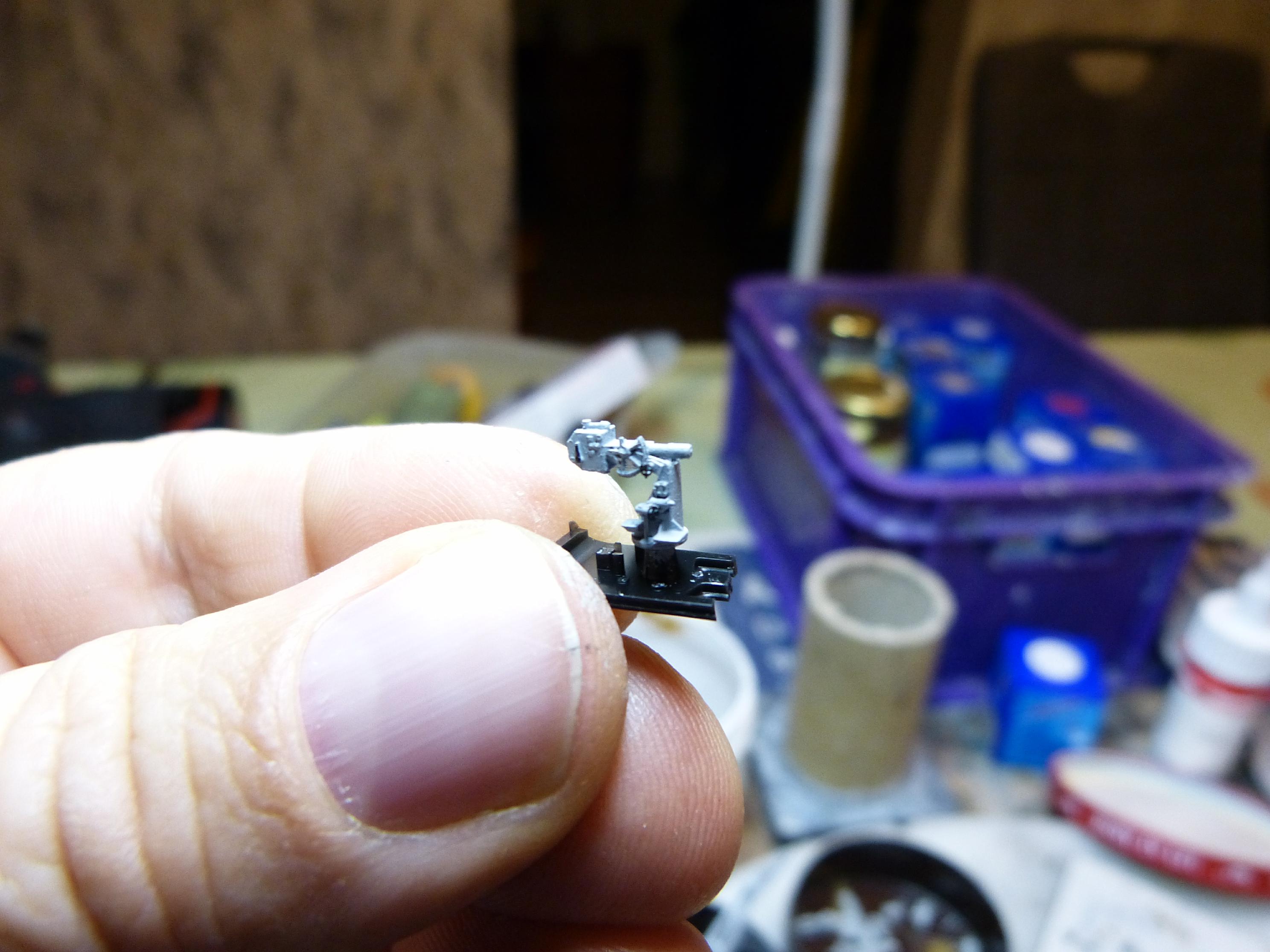 Zuletzt kam die Schleuderbasis dran. Das komplette Teil ist ein 3D-Druckerprodukt von Model-Monkey (USA). Eigentlich bin ich als alter Scratcher kein Freund von 3D-Druck (Modellbau viel zu leicht gemacht). Aber hier habe ich eine Ausnahme gemacht, da das Teil mit seinen Rundungen sehr schwer zu scratchen ist. Zumindest passt es auch ganz gut hinsichtlich Maßstab.